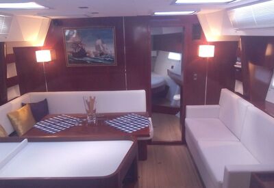 Es handelt sich um die Version mit festem Doghouse über dem Steuerstand und geräumiger Eignerkabine über die gesamte Schiffsbreite im Heck. Ausbau in Mahagoni mit hellen Bodenbrettern. Maschine: VOLVO PENTA D3-110 (110 PS/81 KW), Liegeplatz: Südfrankreich.