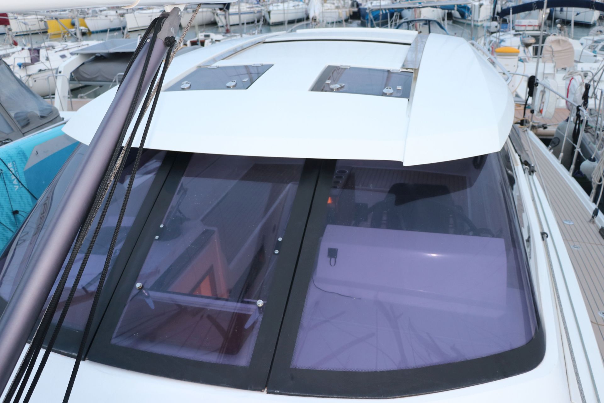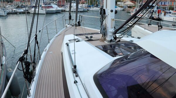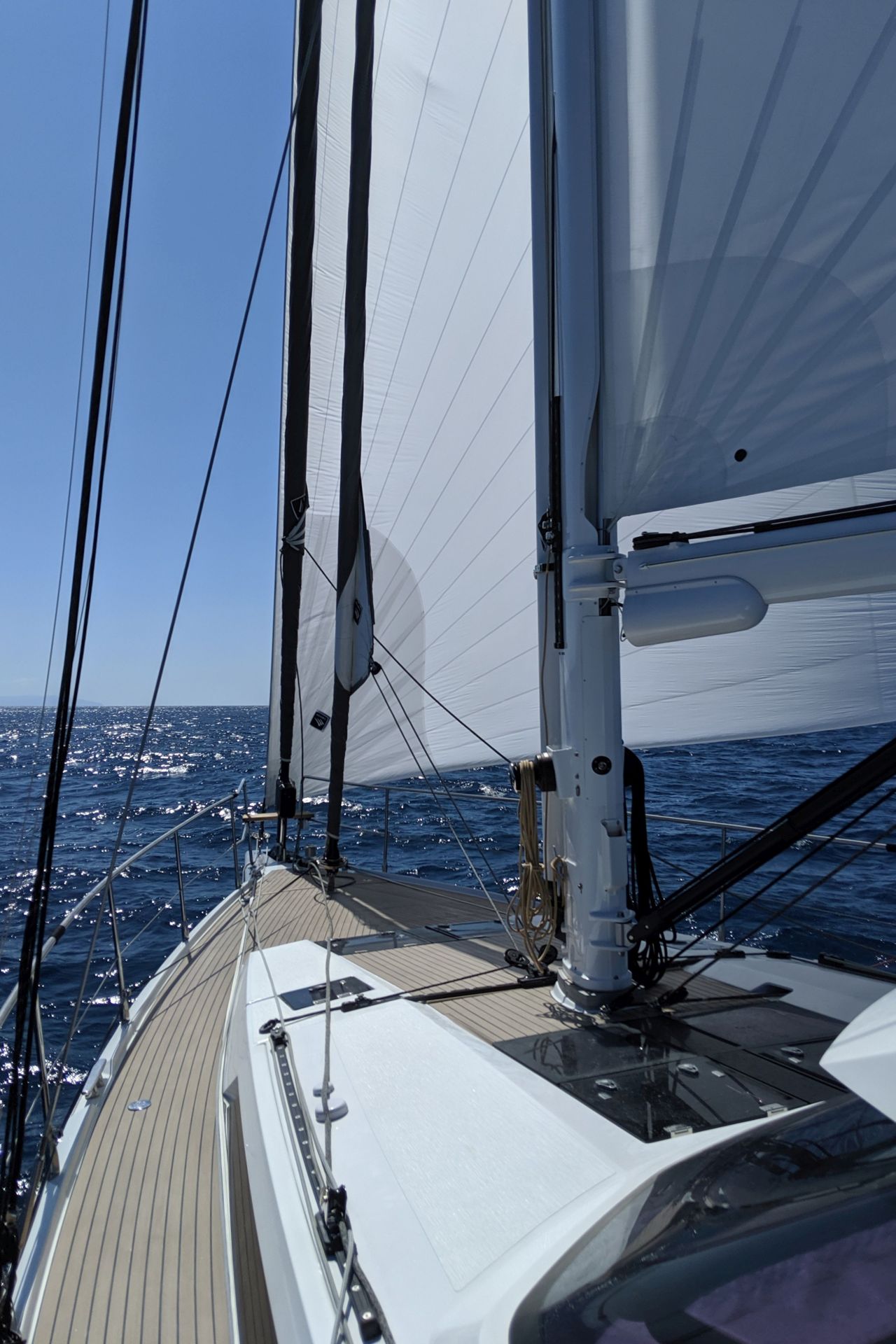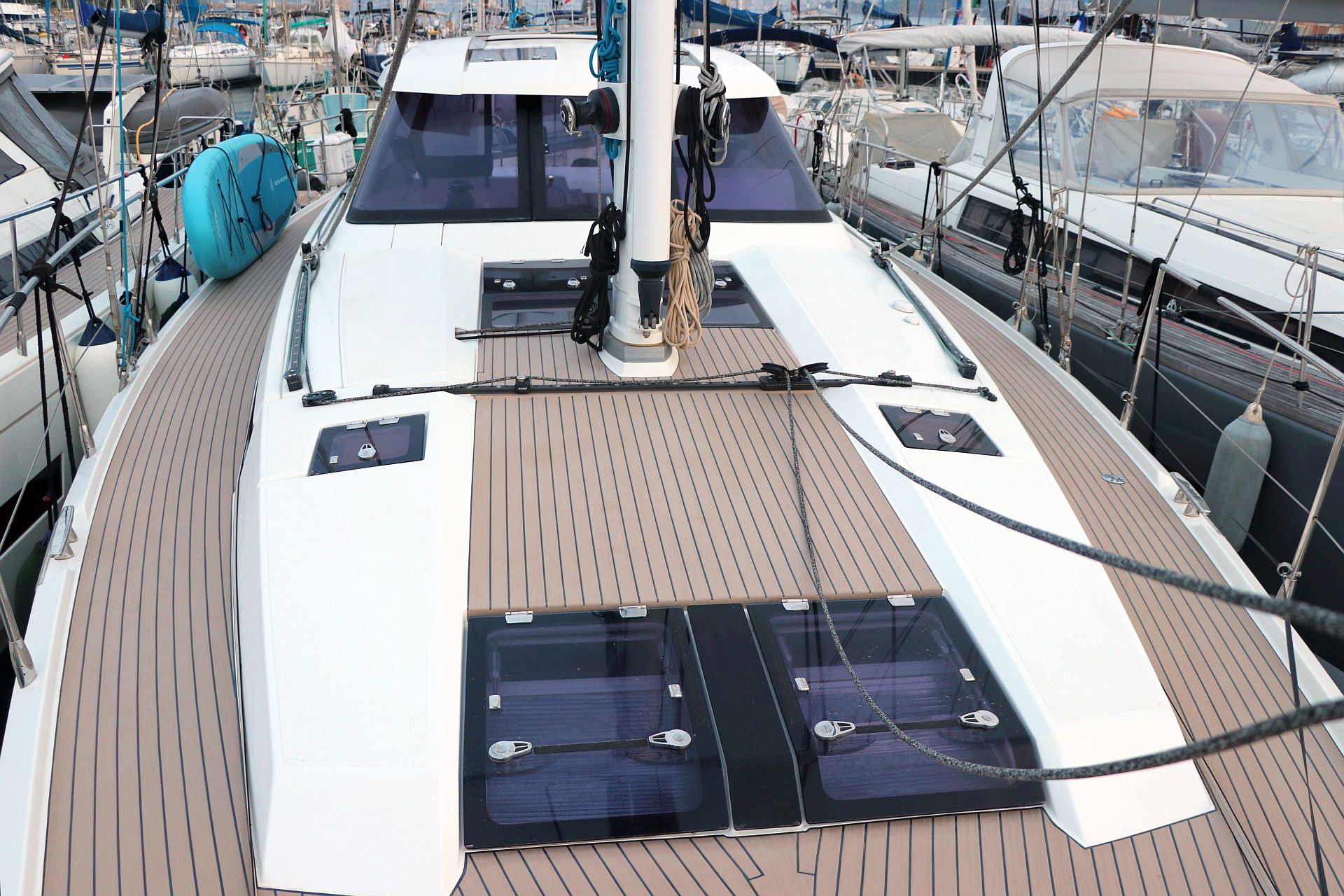 Umfangreich und für Langfahrt ausgerüstete AMEL 50 Baujahr 2018 mit ausfahrbarem Bugstrahlruder, elektrischen Rollanlagen für Großsegel und Genua, elektrischen Winschen, Selbstwendefock am Kutterstag, Klimaanlage, Dieselgenerator 8 KW, Watermaker, elektrische Davits mit Dinghy usw. Heller Ausbau in seidenmatt lackierter Eiche und weiß bespannten Panelen. Das Titelbild ist ein Prospektfoto.