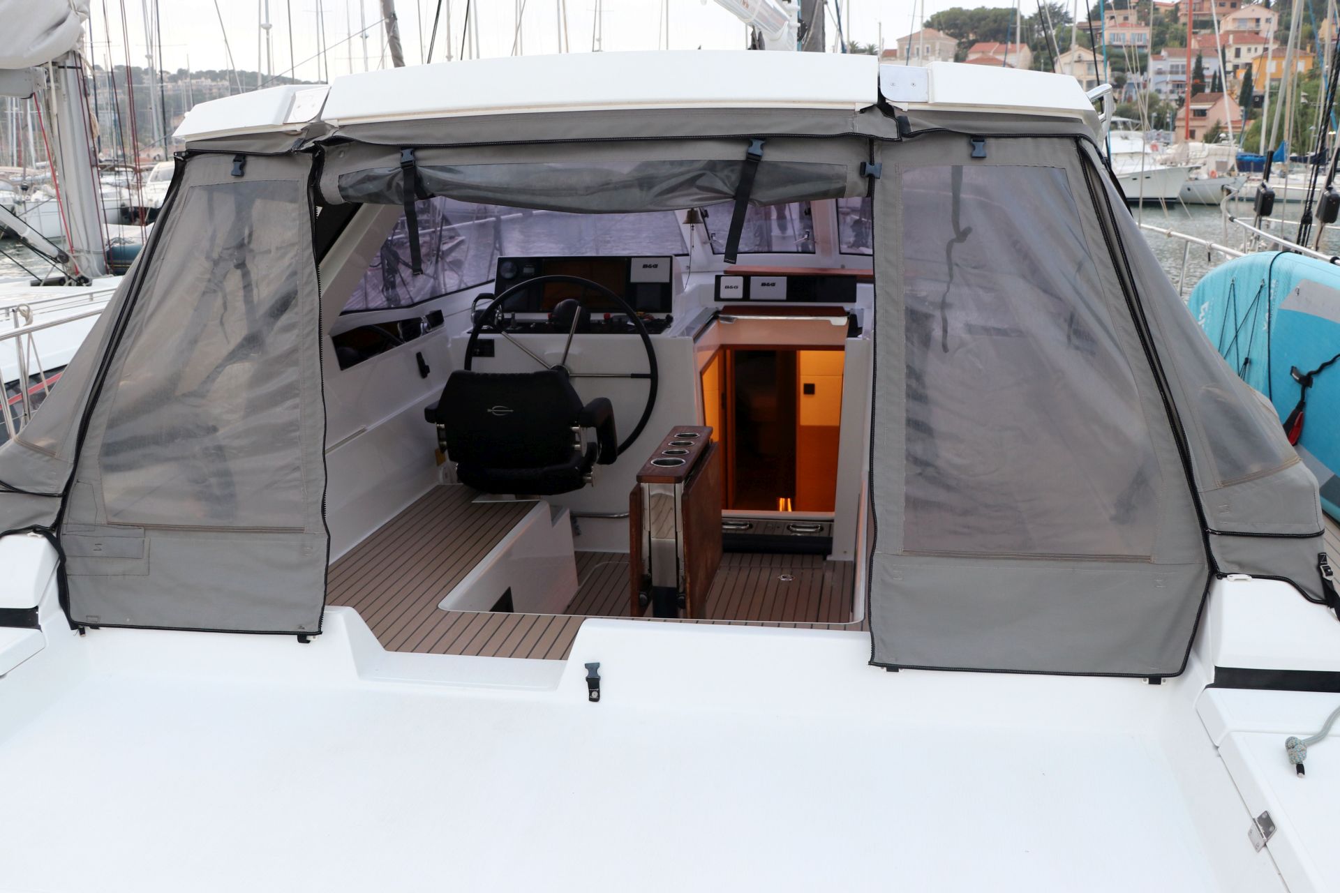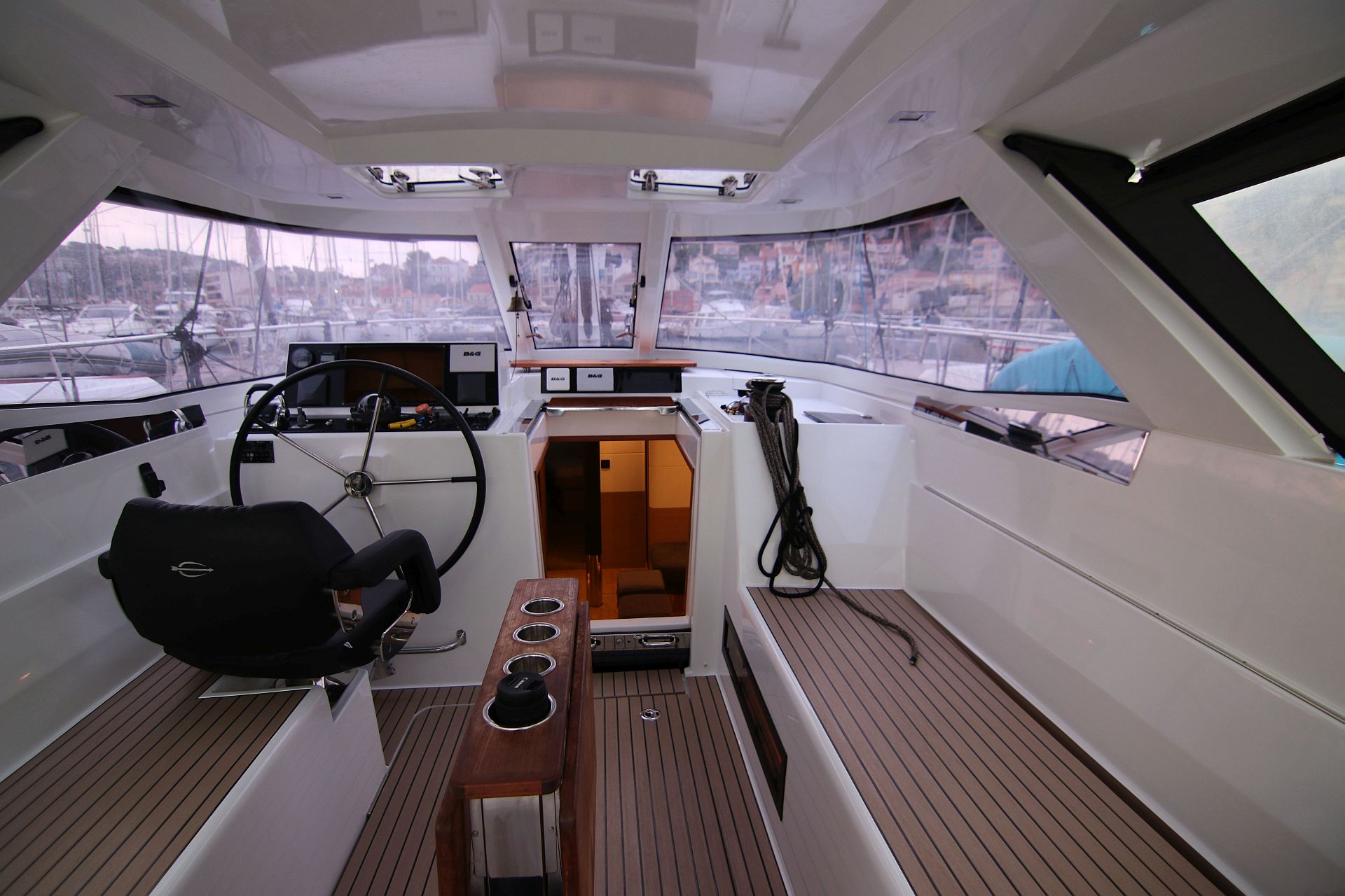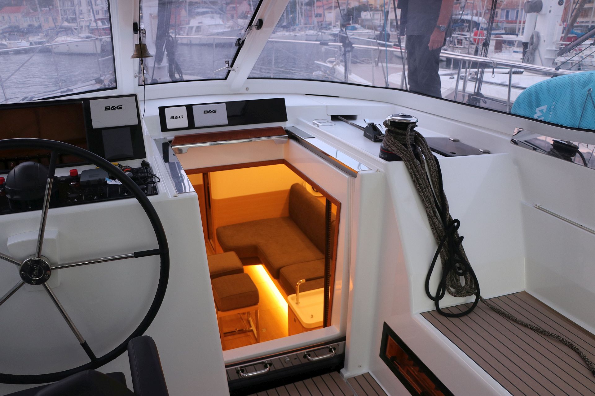 - Tiefes gut geschütztes Cockpit mit Steuerstand und Steuersitz an Backbord