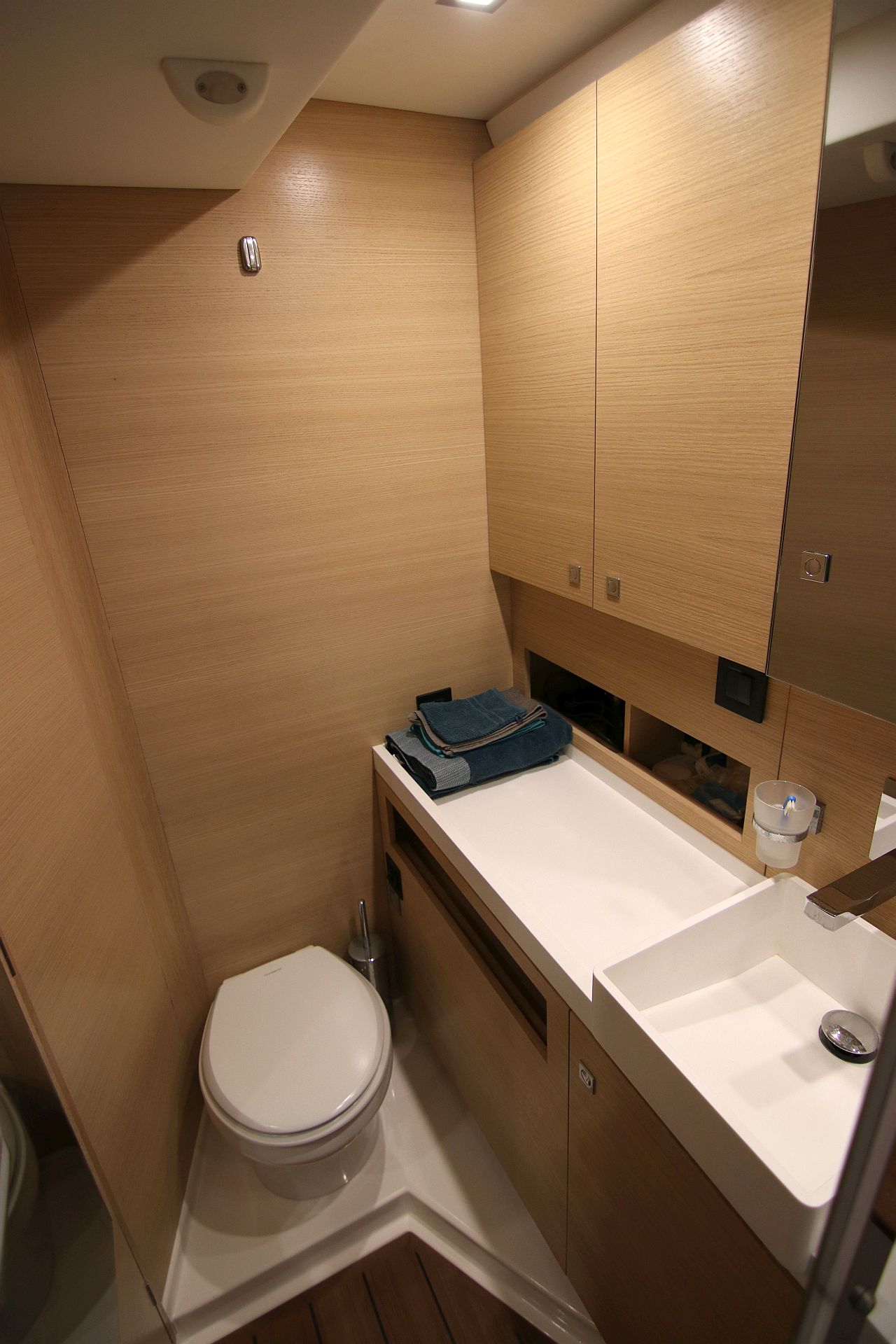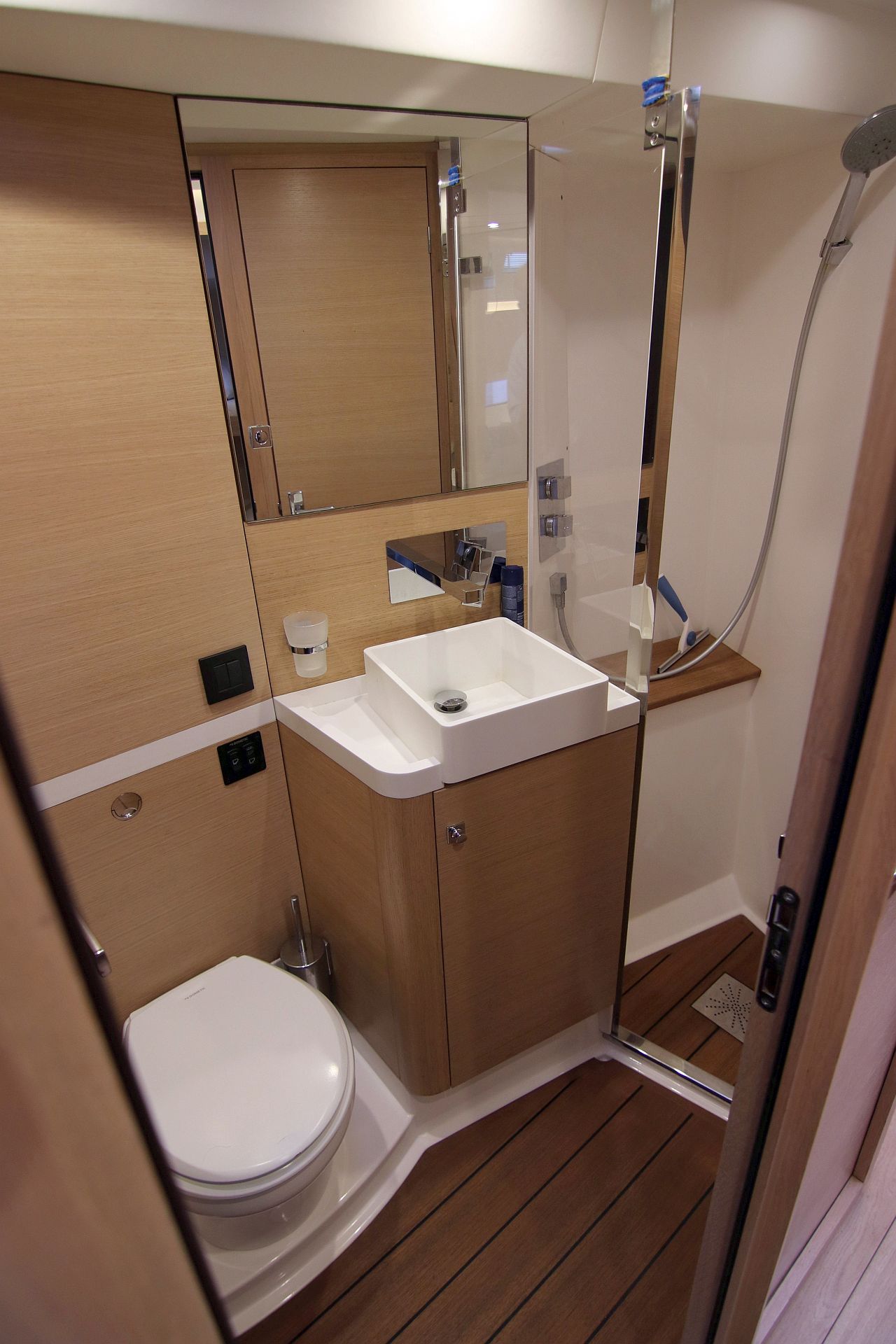 - Nasszelle mit separater Duschkabine und elektrischer Toilette an Backbord
