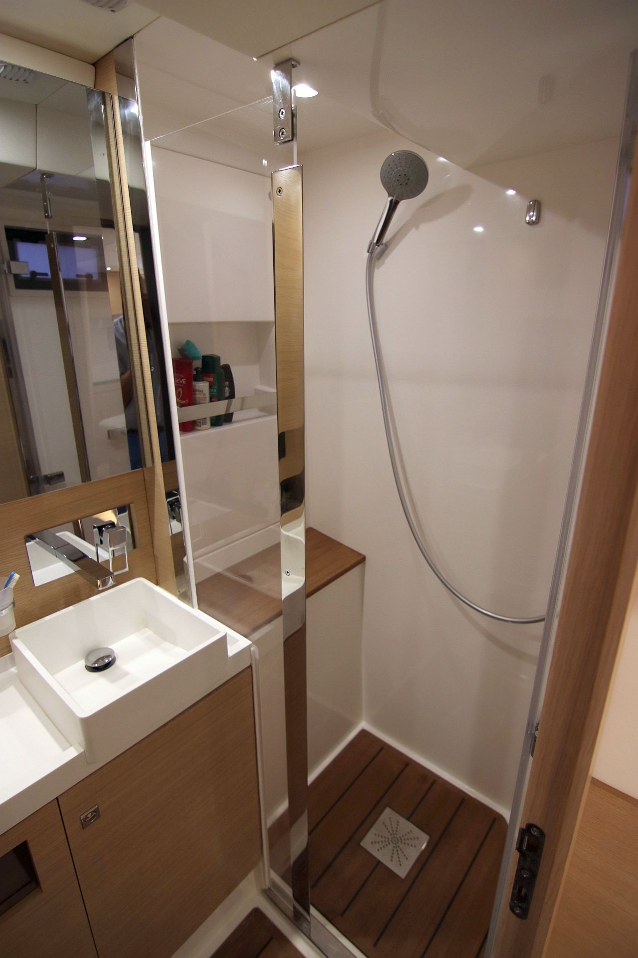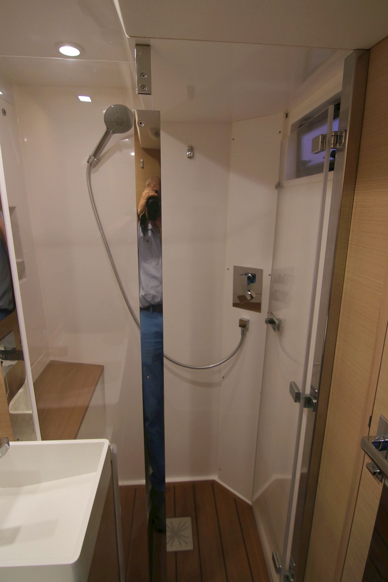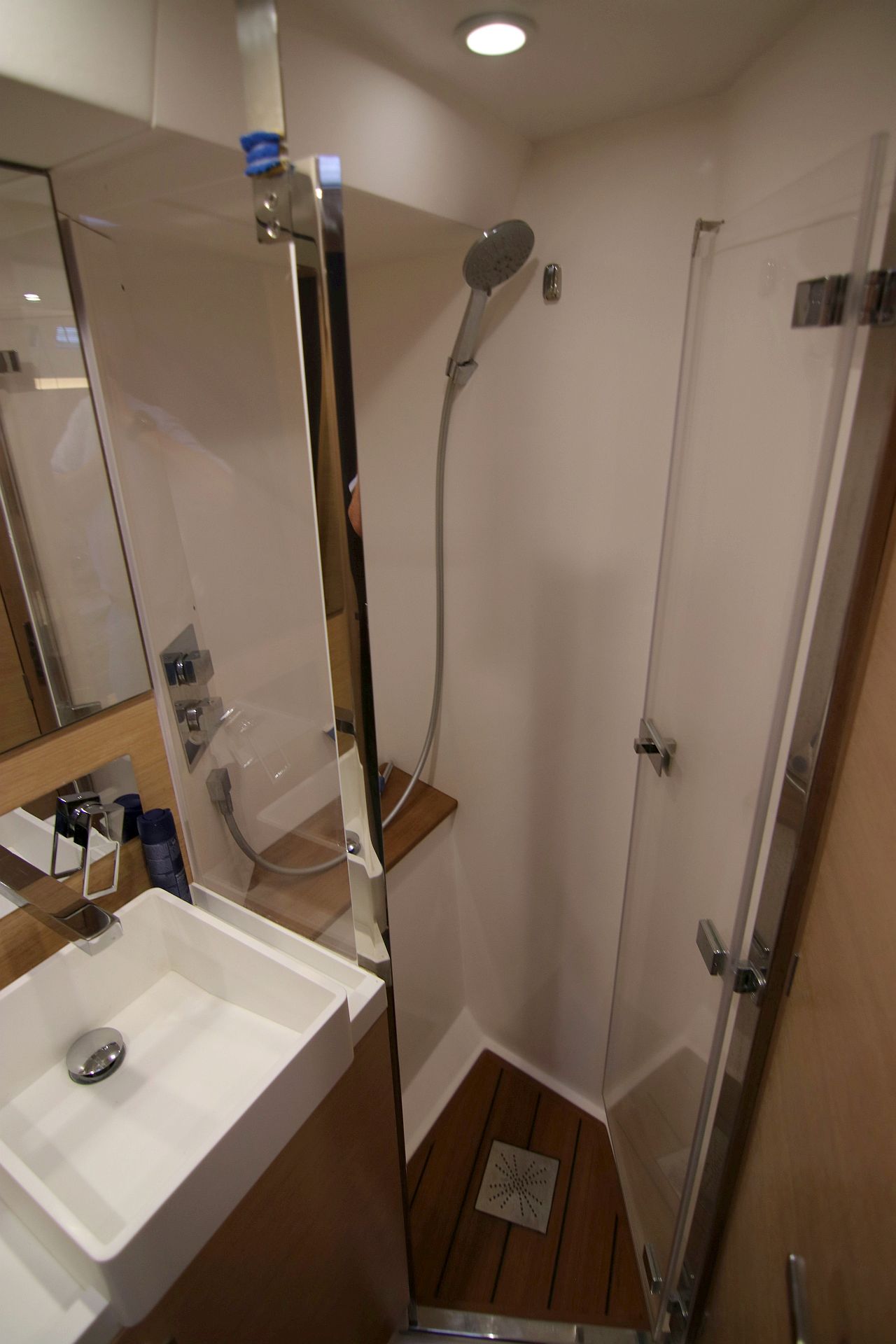 - Eignerbad mit separater Duschkabine und elektrischer Toilette an Backbord