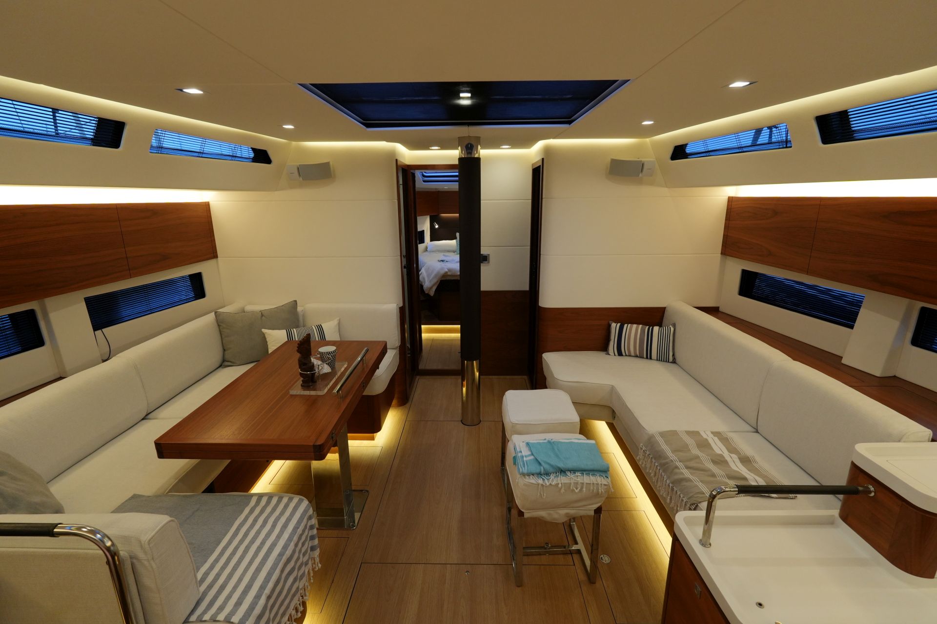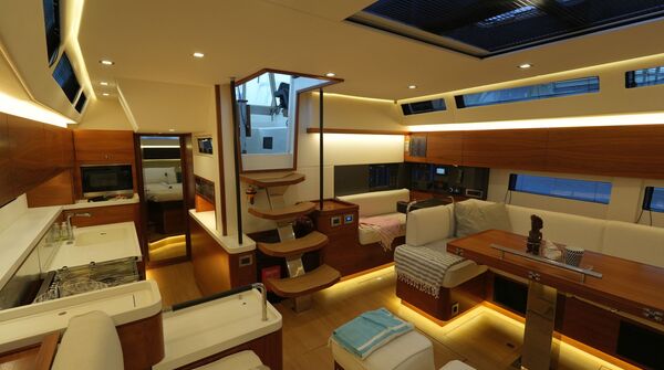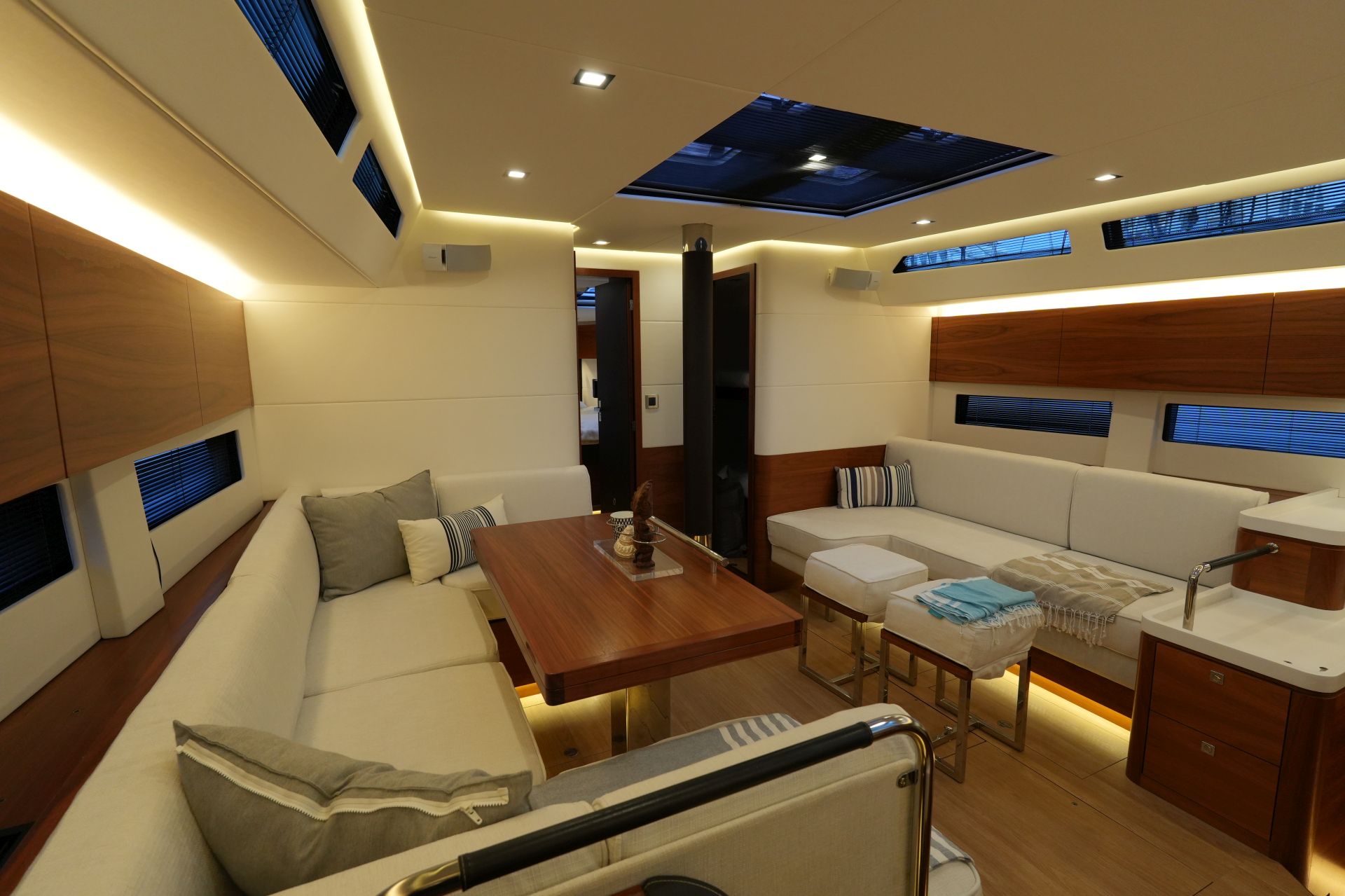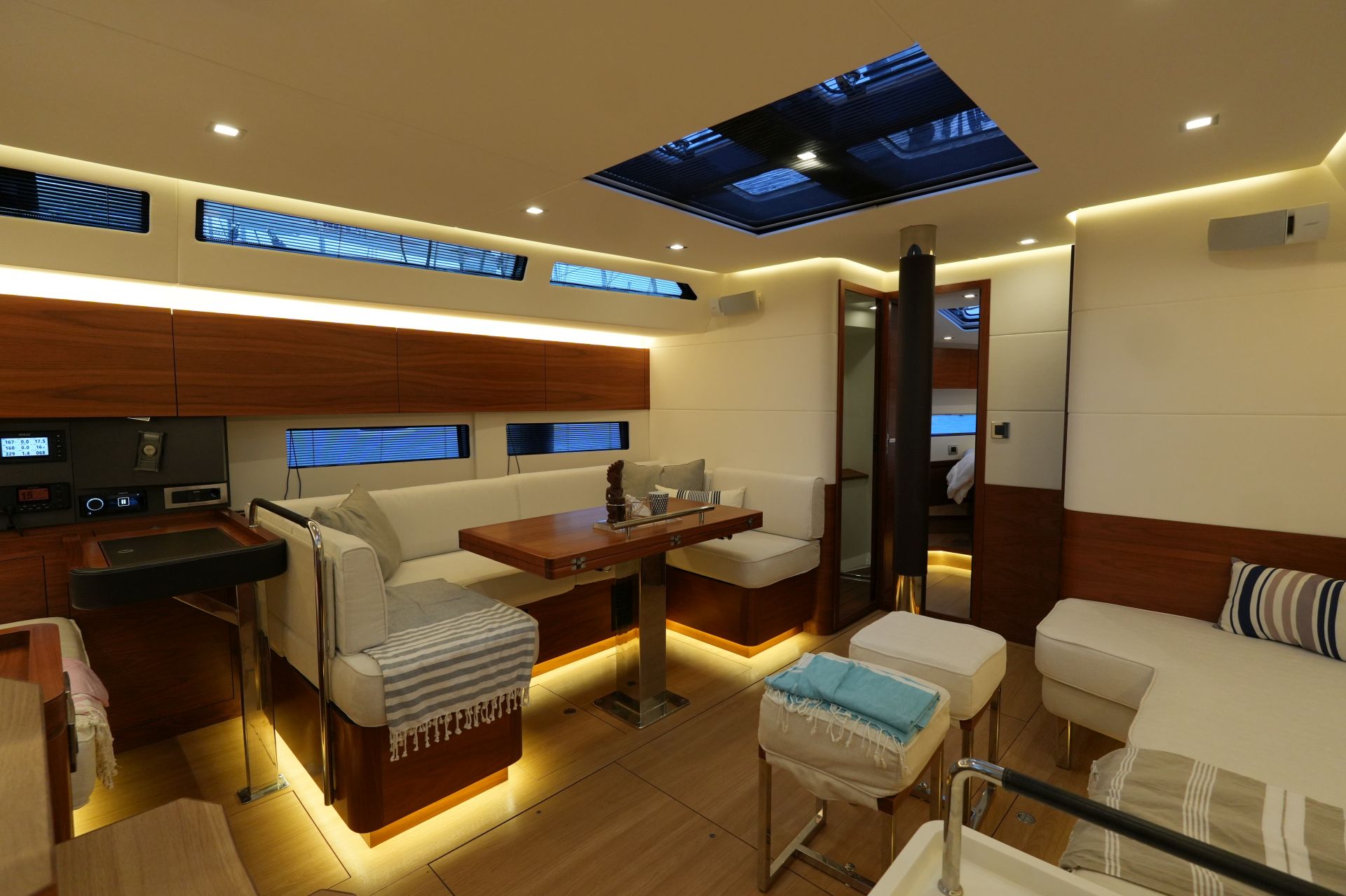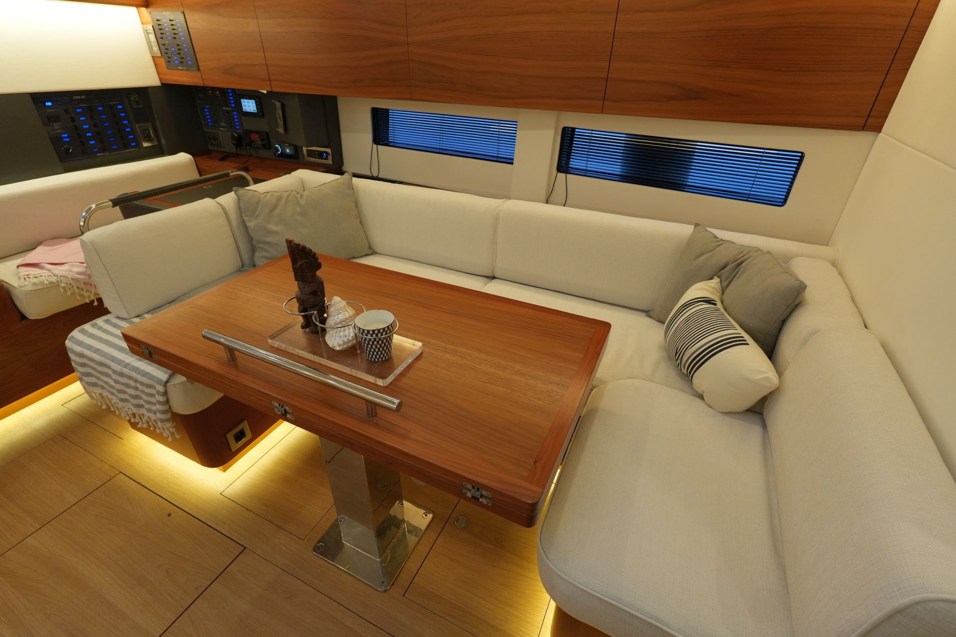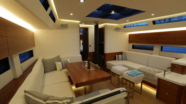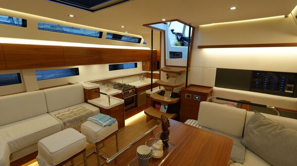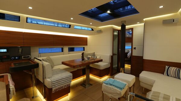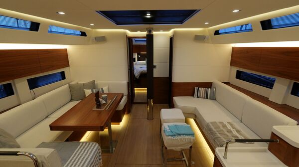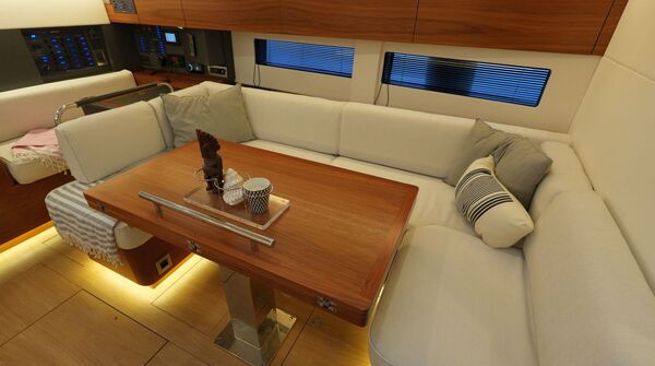 - Großzügiger, geräumiger Salon mit U-förmiger Sitzgruppe an Backbord
