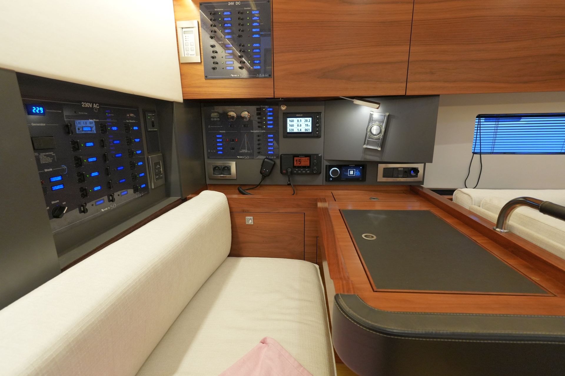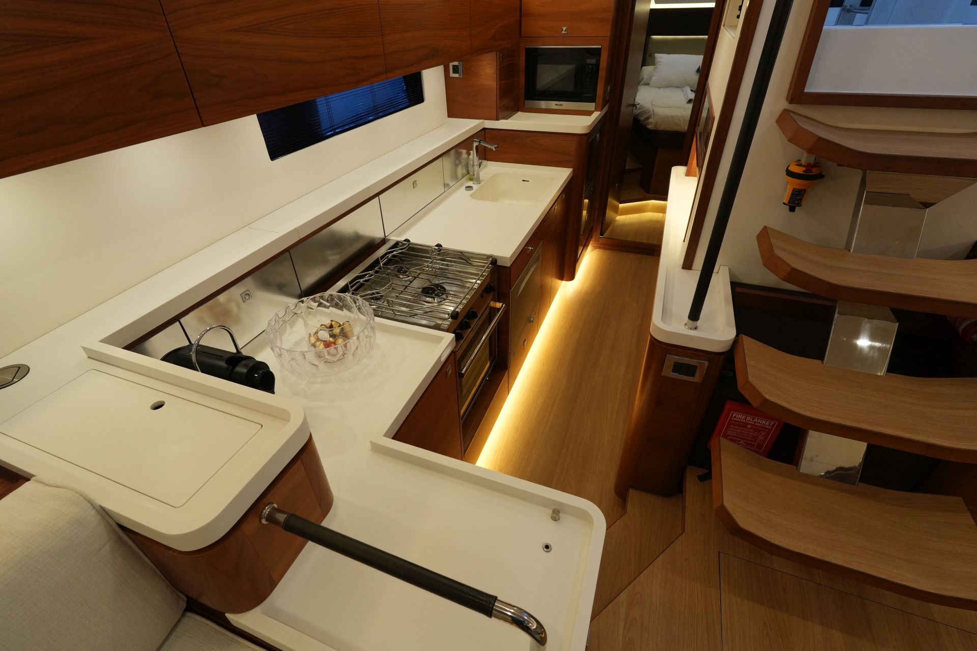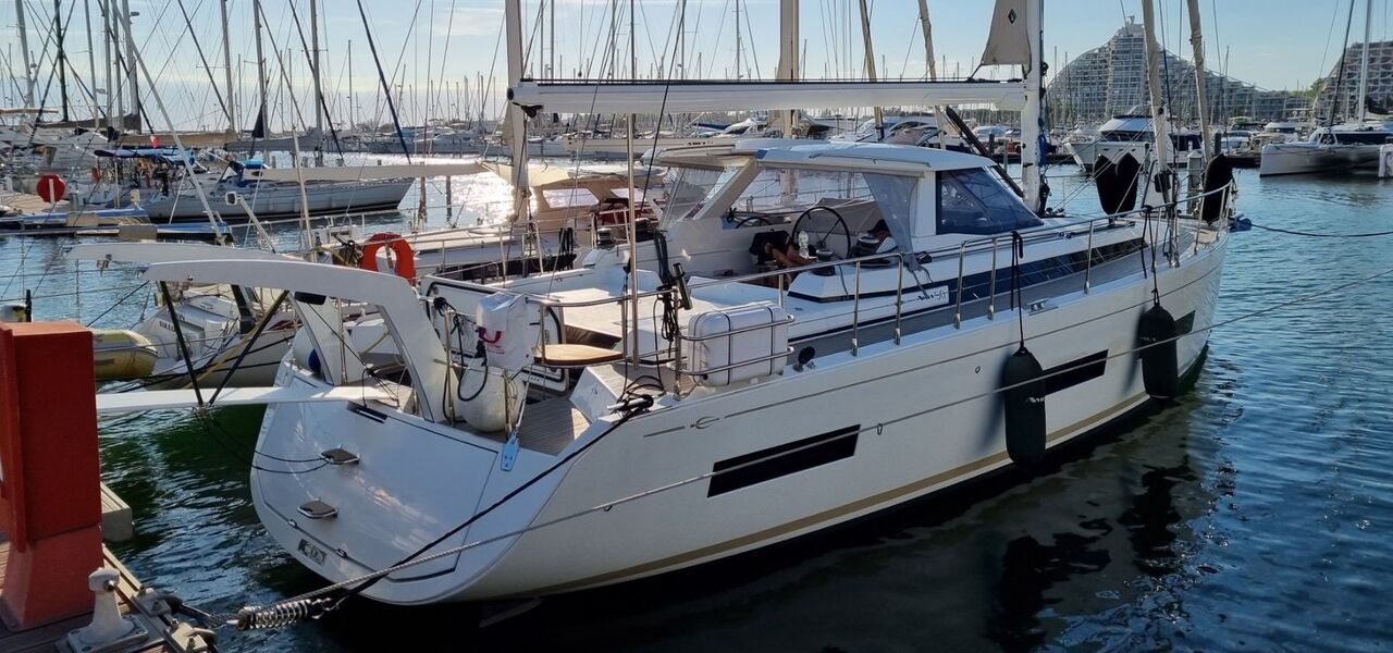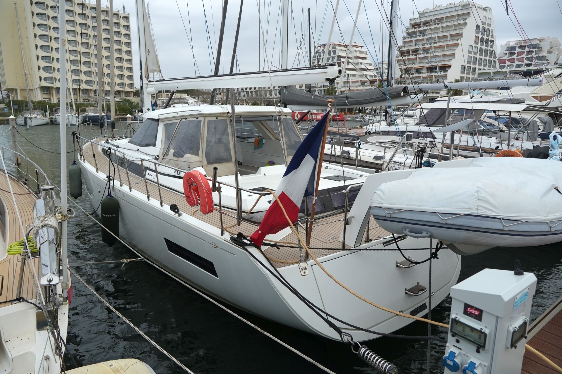 Hervorragend zur weltweiten Fahrt ausgestattete Eigneryacht. Umfangreiche Spezifikation inkl. Dieselgenerator 8 KW, Watermaker, Klimaanlage, Waschmaschine, elektrische Winschen, elektrische Davits inkl. 3,10 m Dinghy, STARLINK Internet-Satellitenantenne usw. Größere Maschine VOLVO PENTA D3-150 mit stärkerer Welle 45 mm und VARIFOLD Faltpropeller. Dank elektrischer Genuarollanlage, Selbstwendefock mit elektrischer Rollanlage und elektrischem Rollgroß inkl. elektrischem Unterliekstrecker ist diese AMEL 50 einhandtauglich. Moderner, exklusiver Ausbau in seidenmatt lackierter Amerikanischer Walnuß mit weiß bespannten Paneelen, hellen laminierten Bodenbrettern und zahlreichen Lederapplikationen. Die AMEL 50 liegt segelfertig in der Camargue, ist kurzfristig lieferbar und kann jederzeit nach Absprache besichtigt werden.