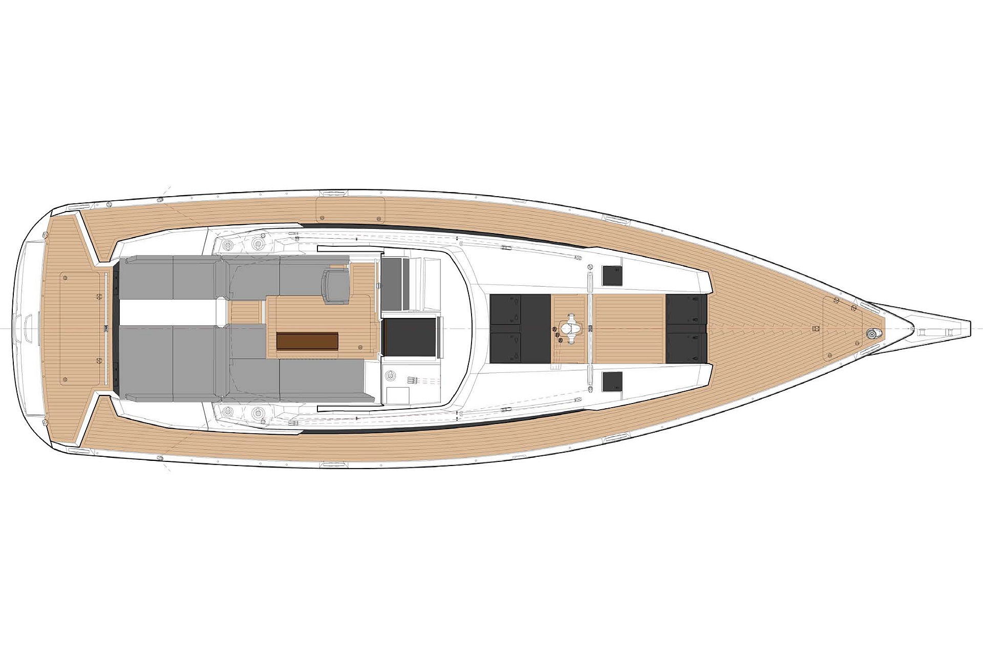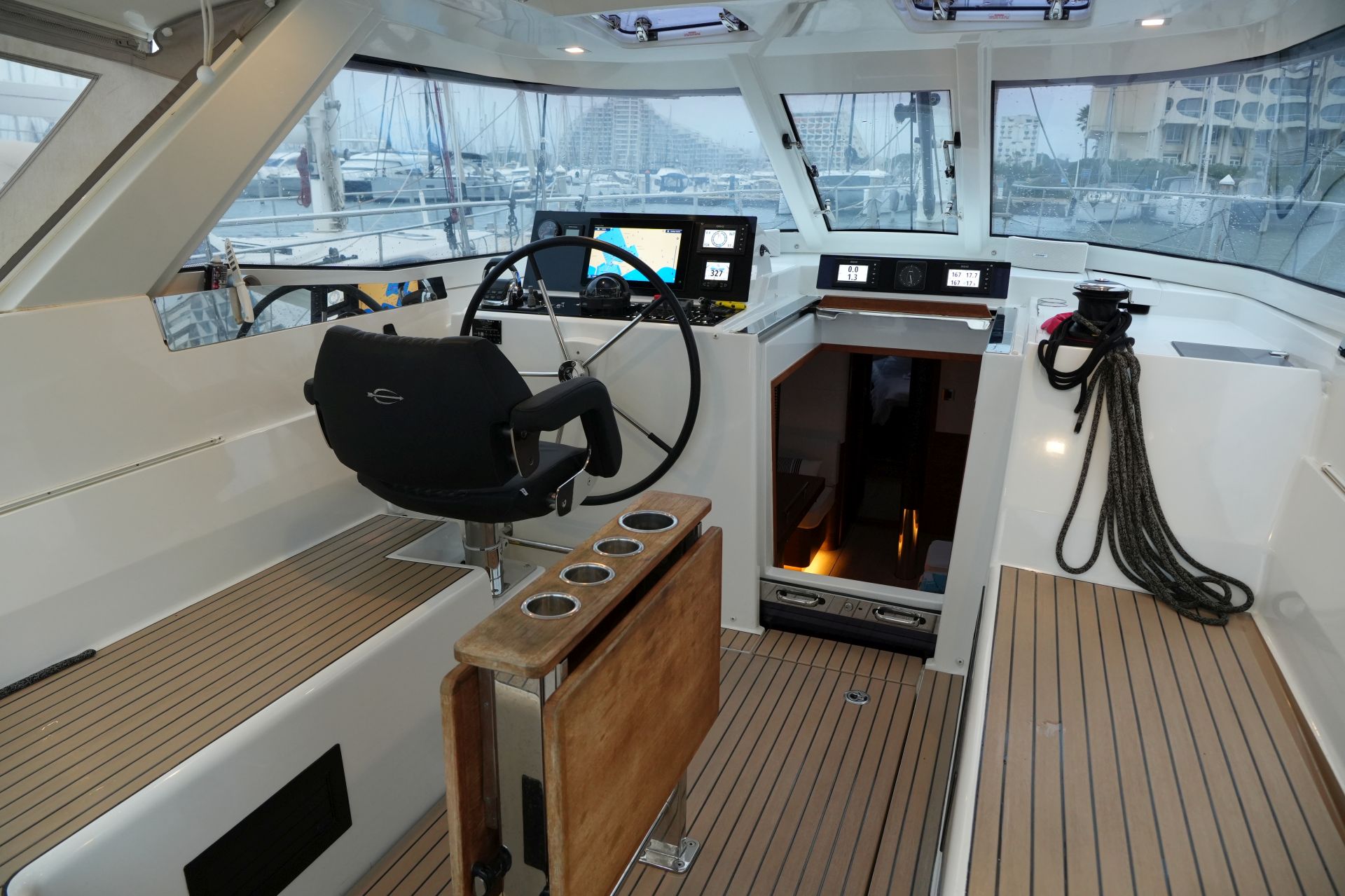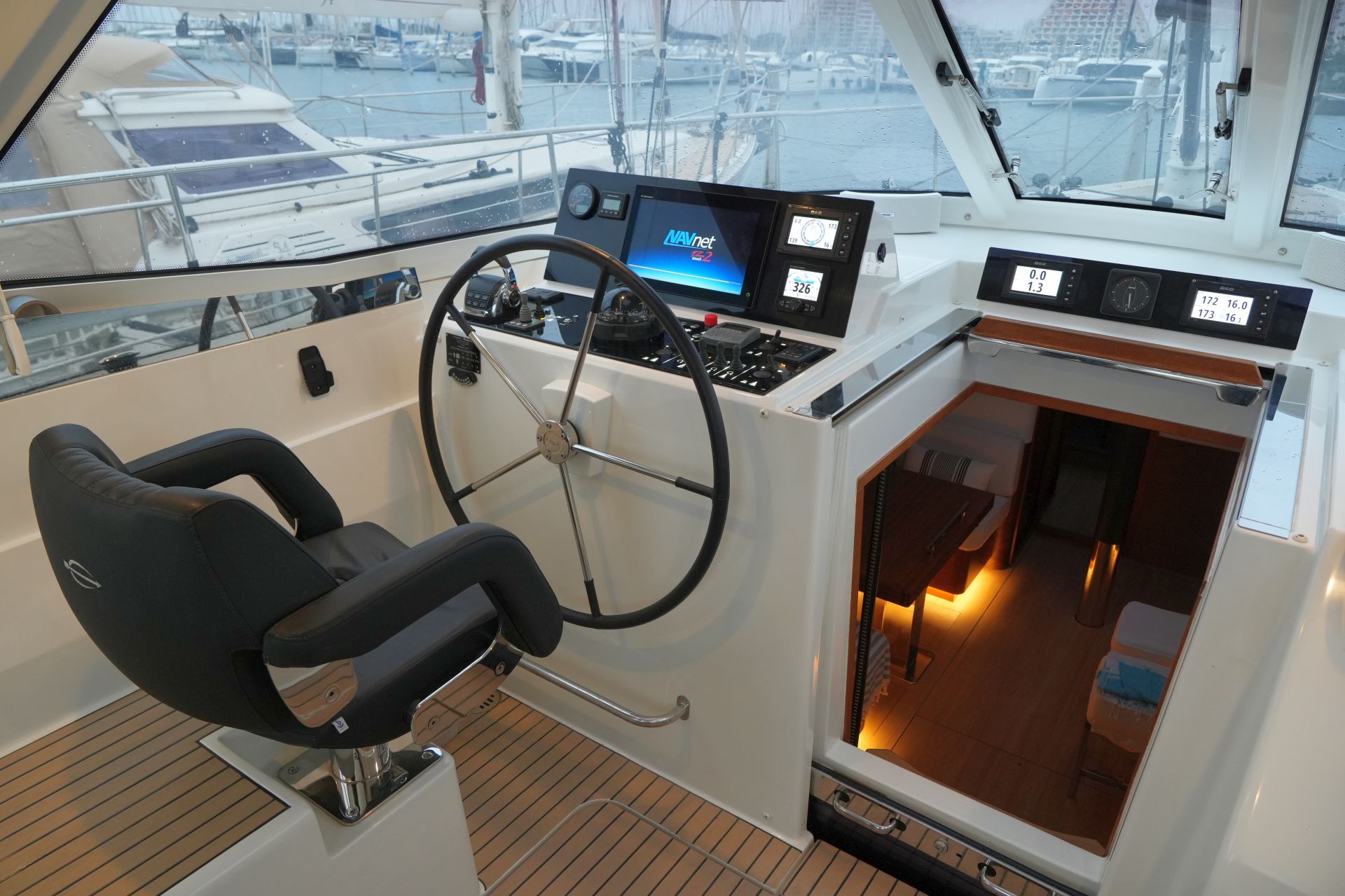 - Tiefes gut geschütztes Cockpit mit Steuerstand und Steuersitz an Backbord