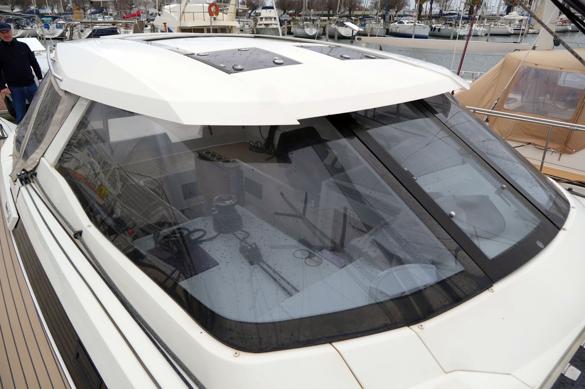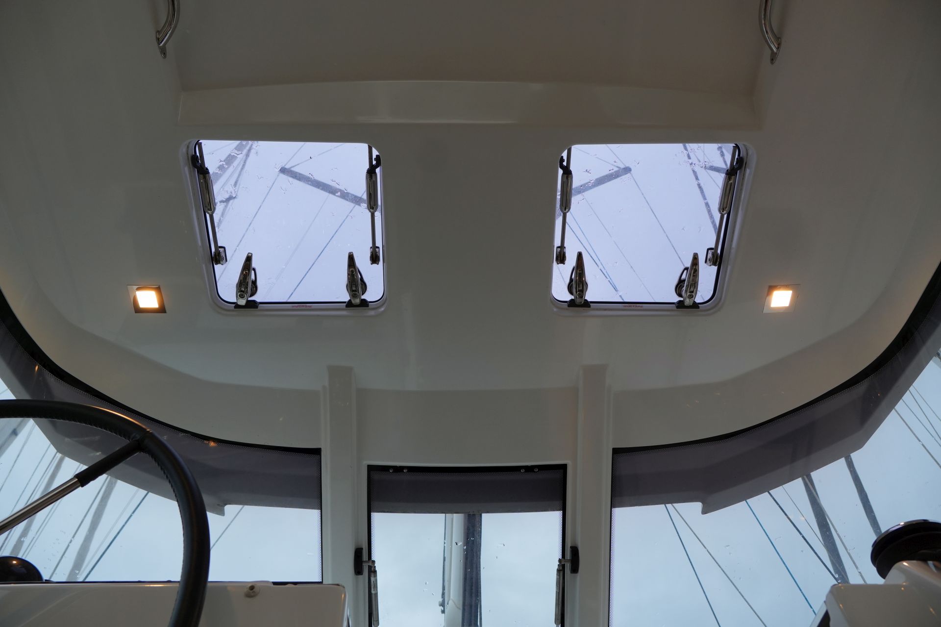 - Doghouse mit Windschutzscheibe (zentrale Scheibe zum Öffnen), zwei Luken im Dach, Deckenbeleuchtung und achtern ausziehbarem GFK-Bimini