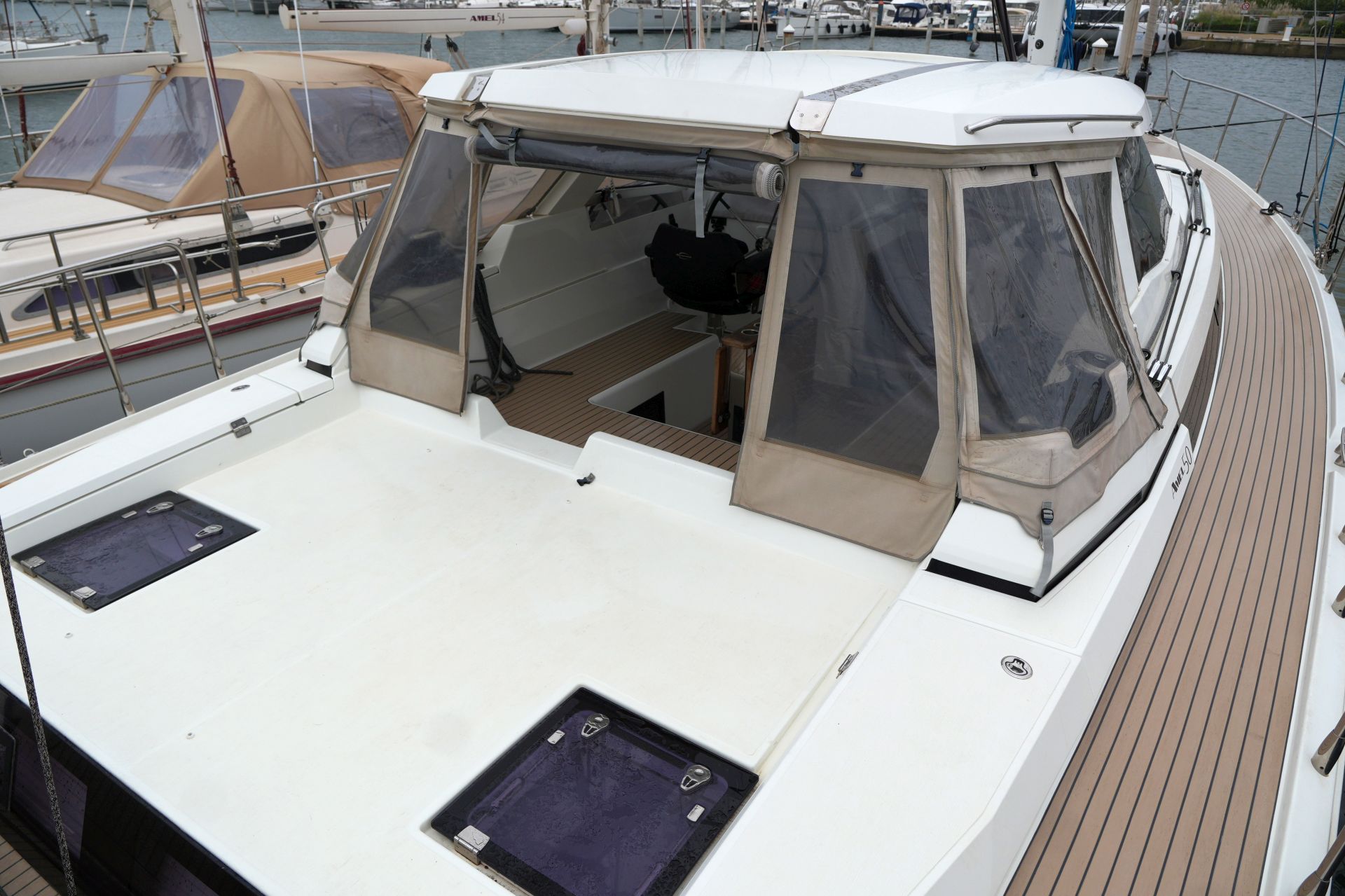 Blauwasser-Cruiser aus dem Jahr 2019Luxuriöser, seegängiger und für Langfahrt ausgestatteter Blauwasser-Cruiser aus Frankreich. Ihr ausgereiftes Konzept, der hohe Standard des Bootsbaus der Werft und die Fokussierung auf Sicherheit, Zuverlässigkeit und Komfort machen AMEL-Segelyachten seit Jahrzehnten zu erstklassigen Fahrtenyachten für lange Strecken und man trifft sie auf den entlegensten Revieren der Welt. Sehr steife, verwindungsfreie Bauweise mit anlaminierten Schotten unter Verwendung von Vinylester-Harzen. Tiefes, gut geschütztes Cockpit mit festem Doghouse über dem Steuerstand. Helles modernes Interieur und viel Licht und Luft unter Deck durch zahlreiche, große Rumpf- und Aufbaufenster, acht Decksluken und sieben Bullaugen. Die AMEL 50 wurde zur "European Yacht of the Year 2018" gewählt.