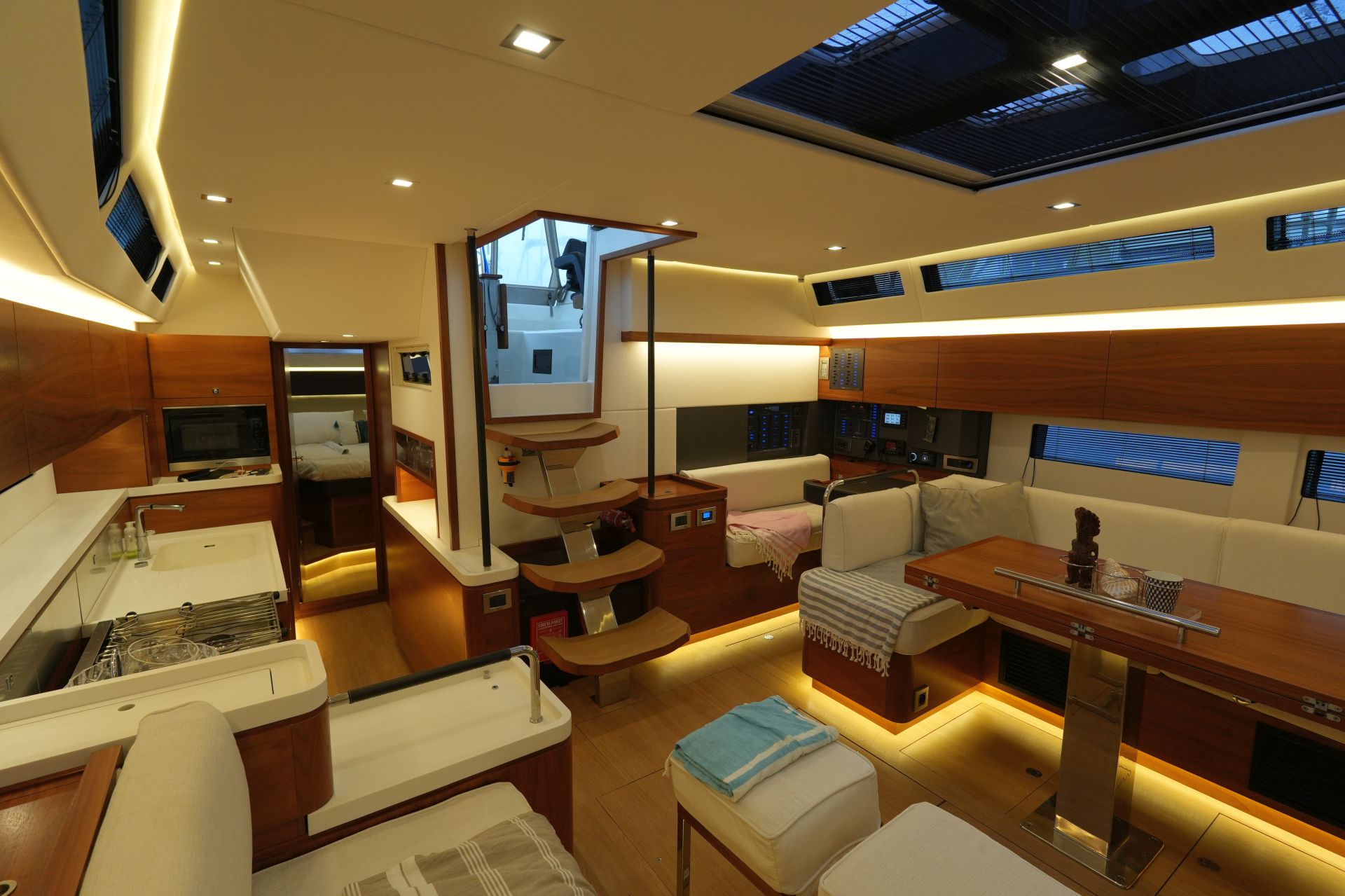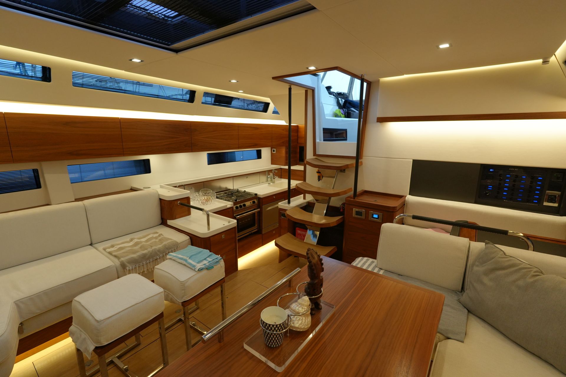 - Dimmbare LED-Innenbeleuchtung (Deckenstrahler, indirekte Beleuchtung und Leselampen)