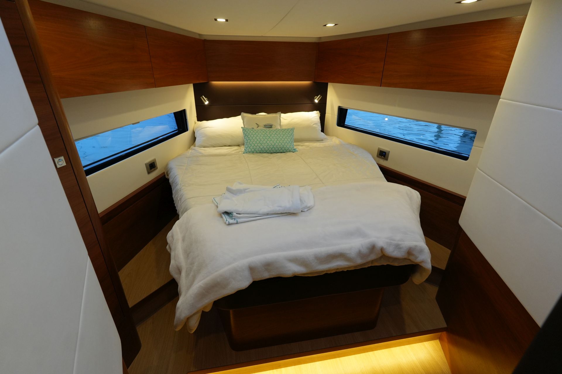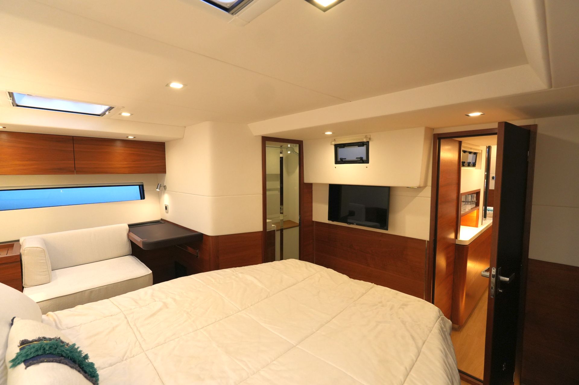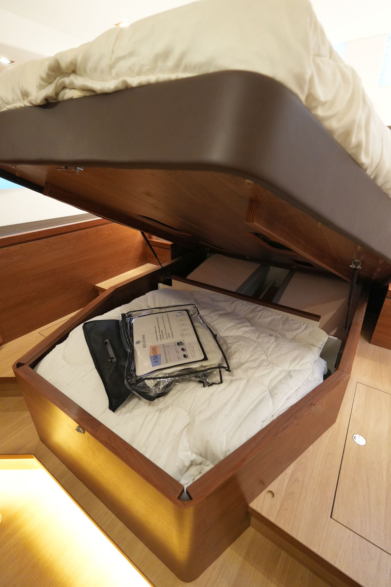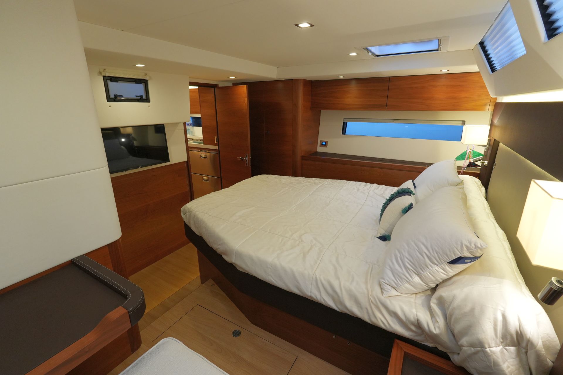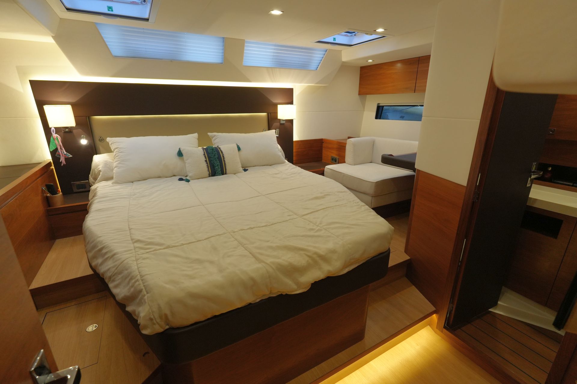 - Reichlich Stauraum in Schränken, Fächern und Schubladen - Luxuriöse, geräumige Eignerkabine im Heck mit breiter, freistehender Doppelkoje, Sessel und Schminktisch, reichlich Stauraum in Schränken, Fächern, Regalen und unter der Koje, die mit Gasdruckfedern hochgeklappt werden kann.