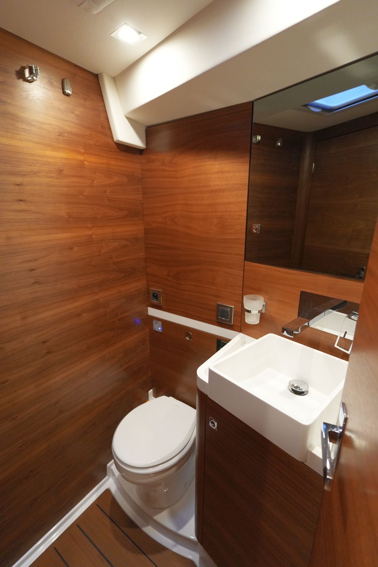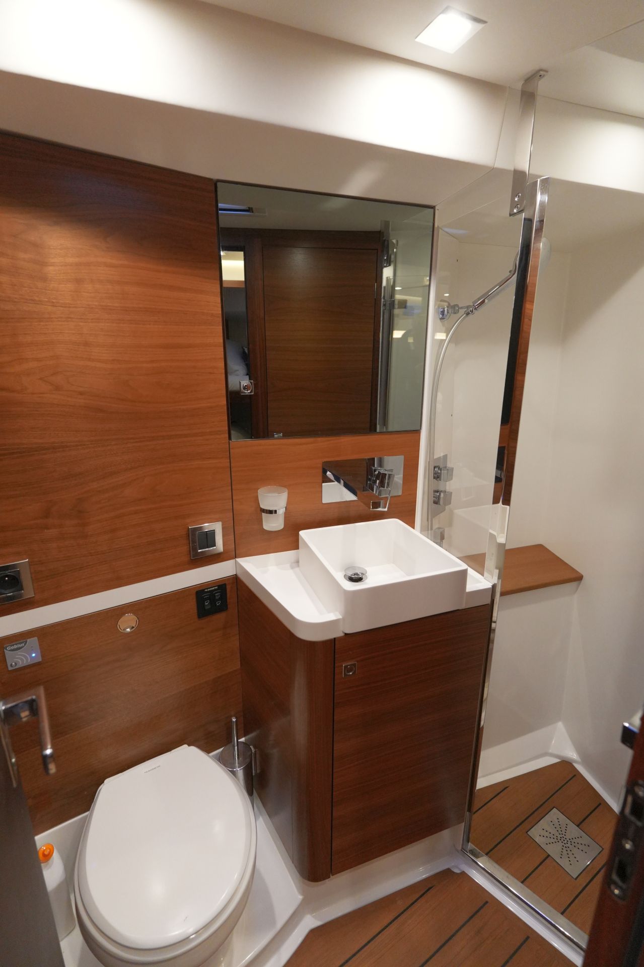 - Nasszelle mit separater Duschkabine und elektrischer Toilette an Backbord