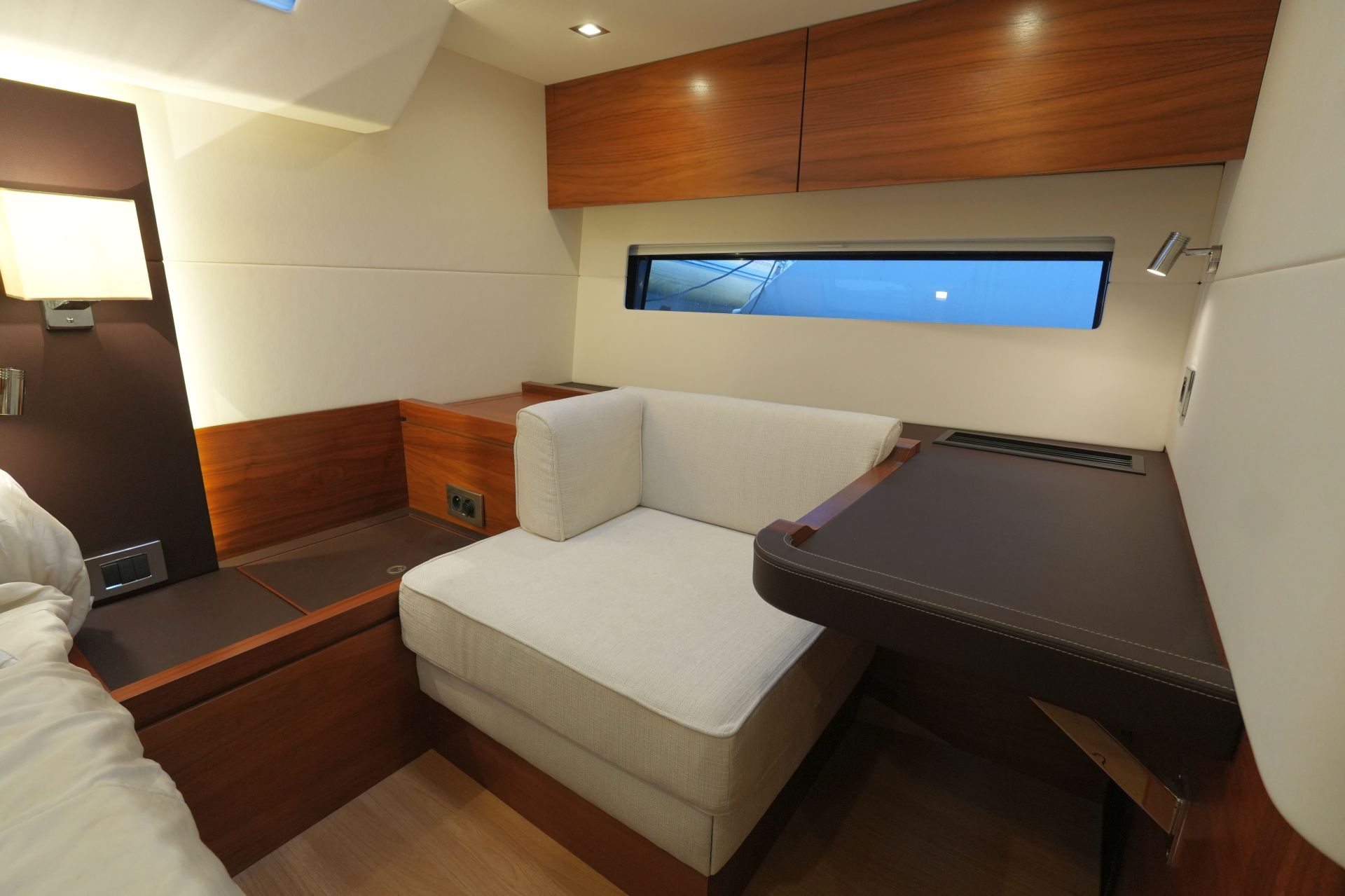 - Exklusiver, aufwendig ausgeführter, heller Ausbau in seidenmatt lackierter amerikanischer Walnuß mit weiß bespannten Paneelen, laminierten Bodenbrettern und zahlreichen Lederapplikationen