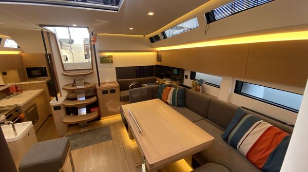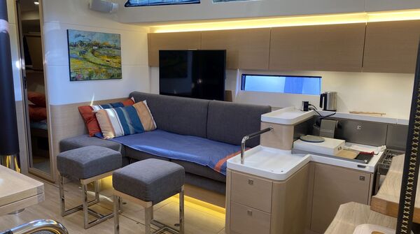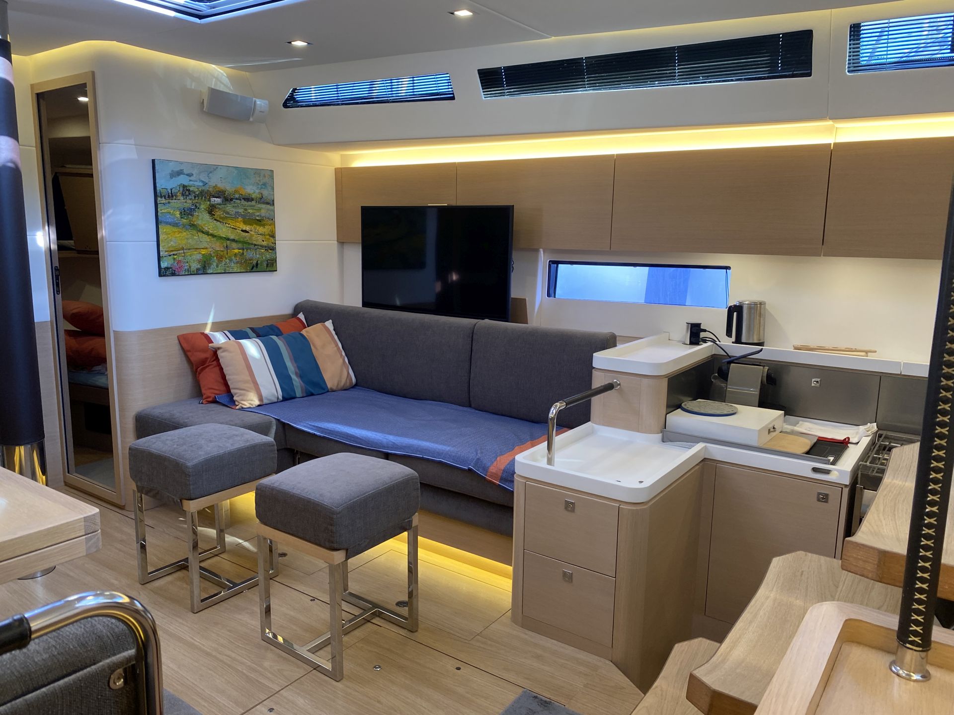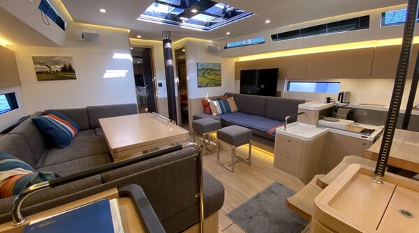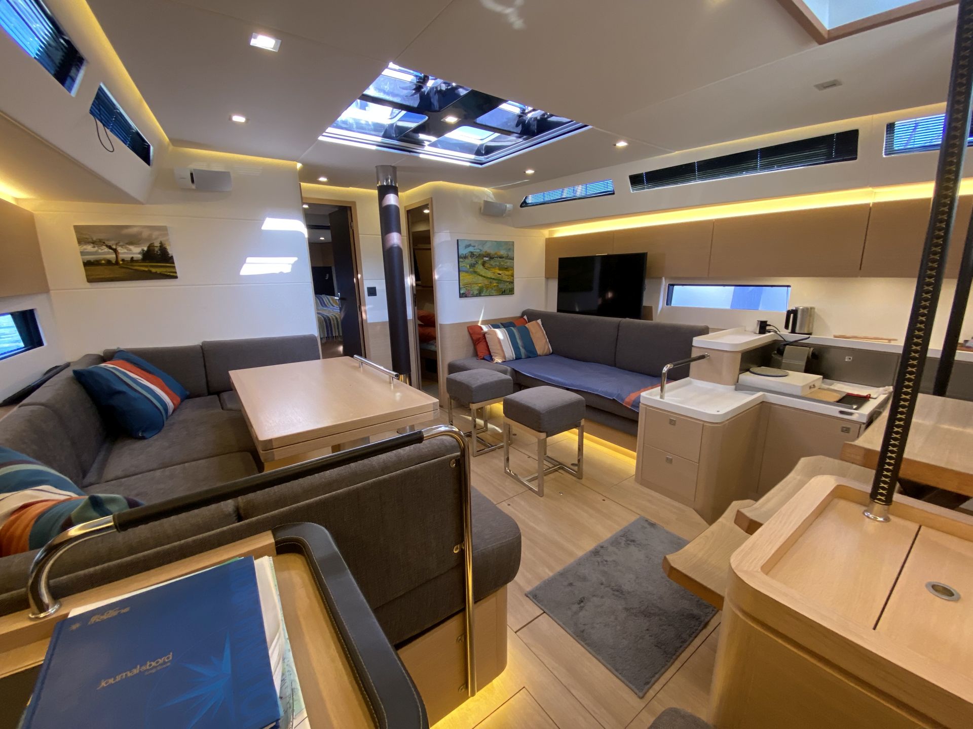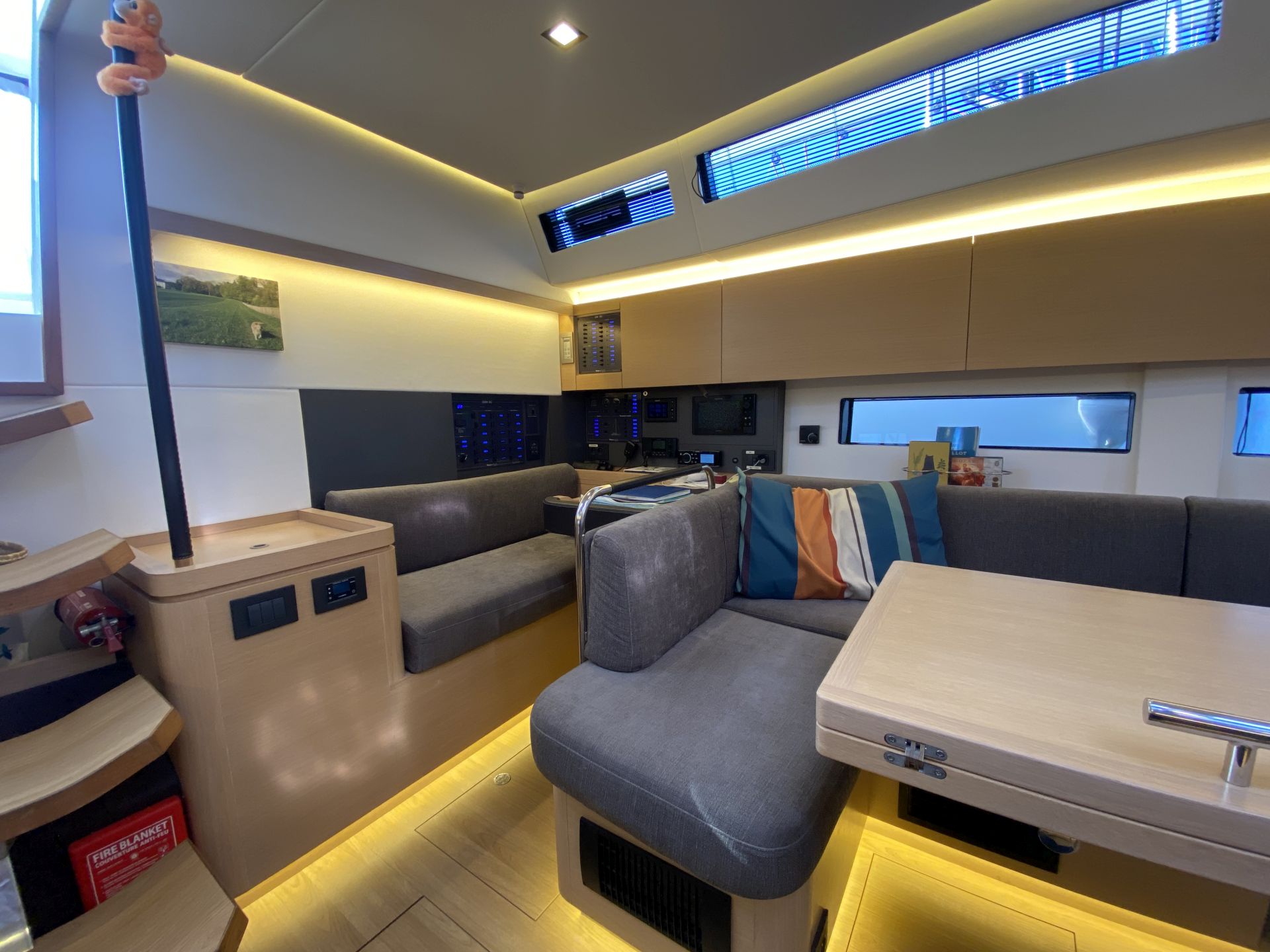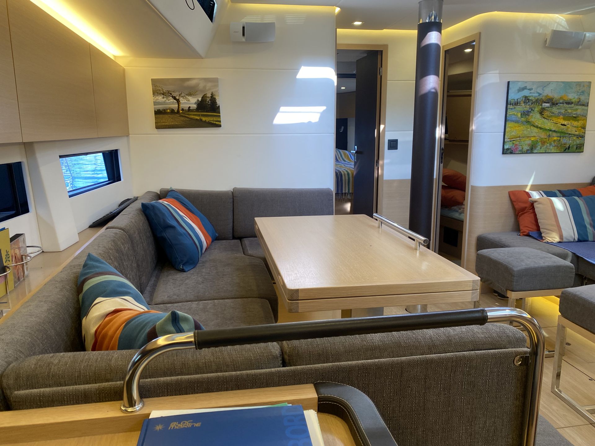 - Großzügiger, geräumiger Salon mit U-förmiger Sitzgruppe an Backbord