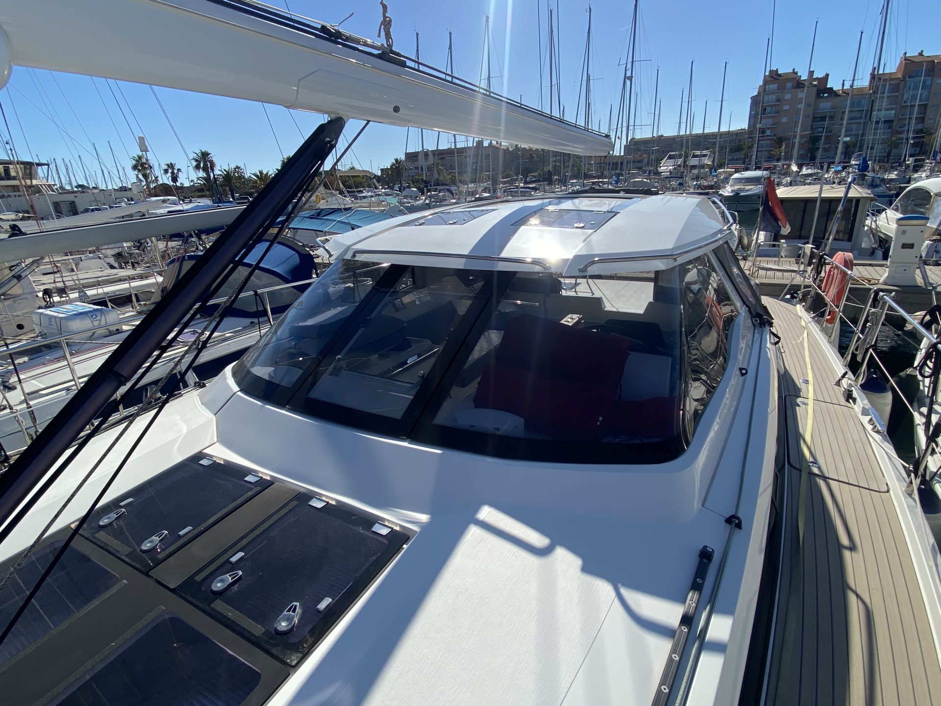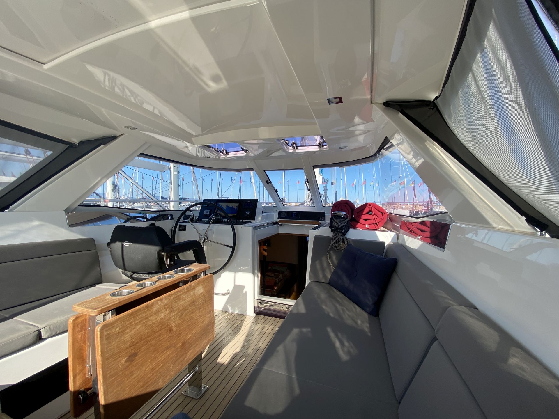 - Doghouse mit Windschutzscheibe (zentrale Scheibe zum Öffnen), zwei Luken im Dach, Deckenbeleuchtung und achtern ausziehbarem GFK-Bimini
