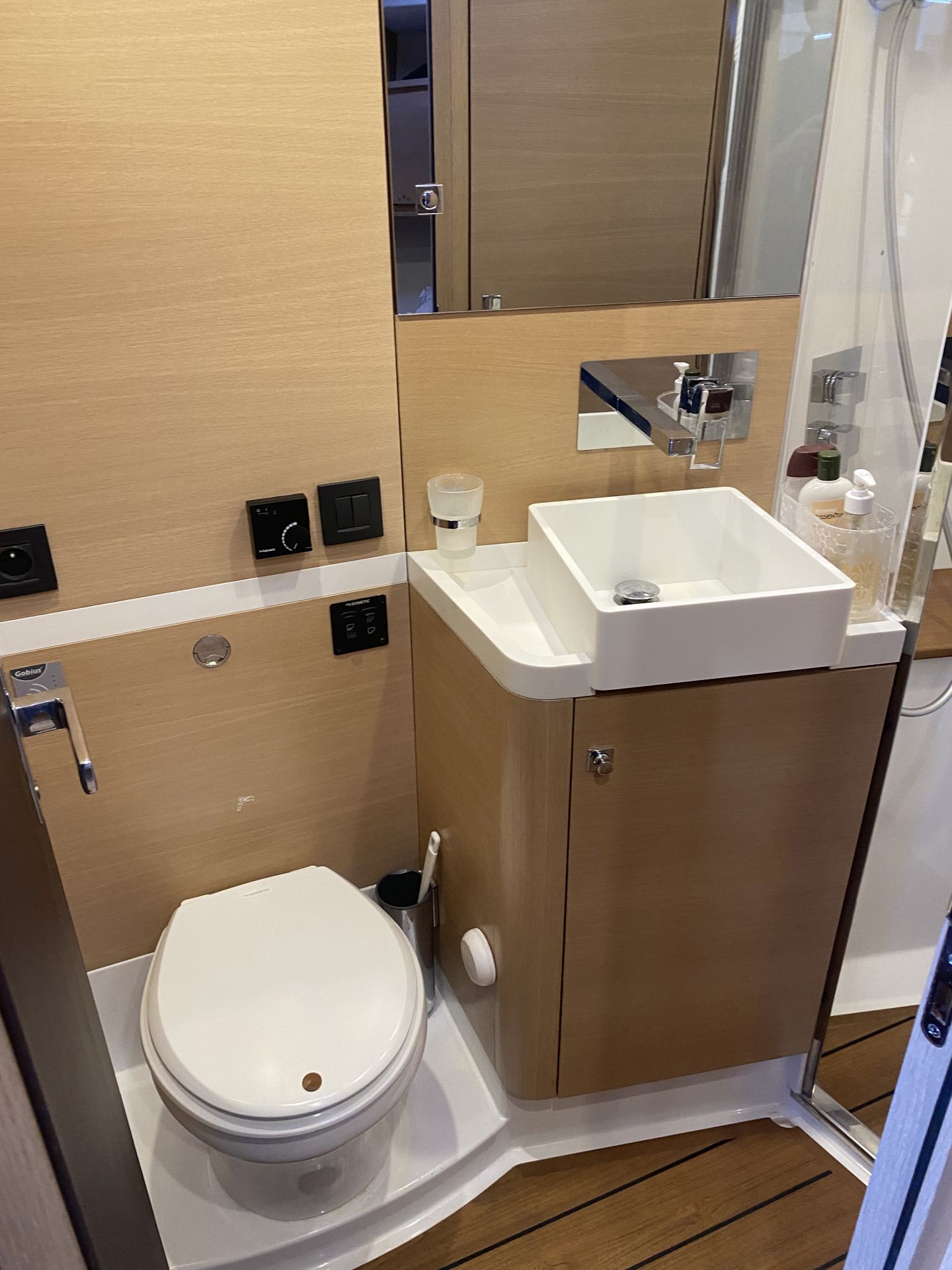 - Nasszelle mit separater Duschkabine und elektrischer Toilette an Backbord