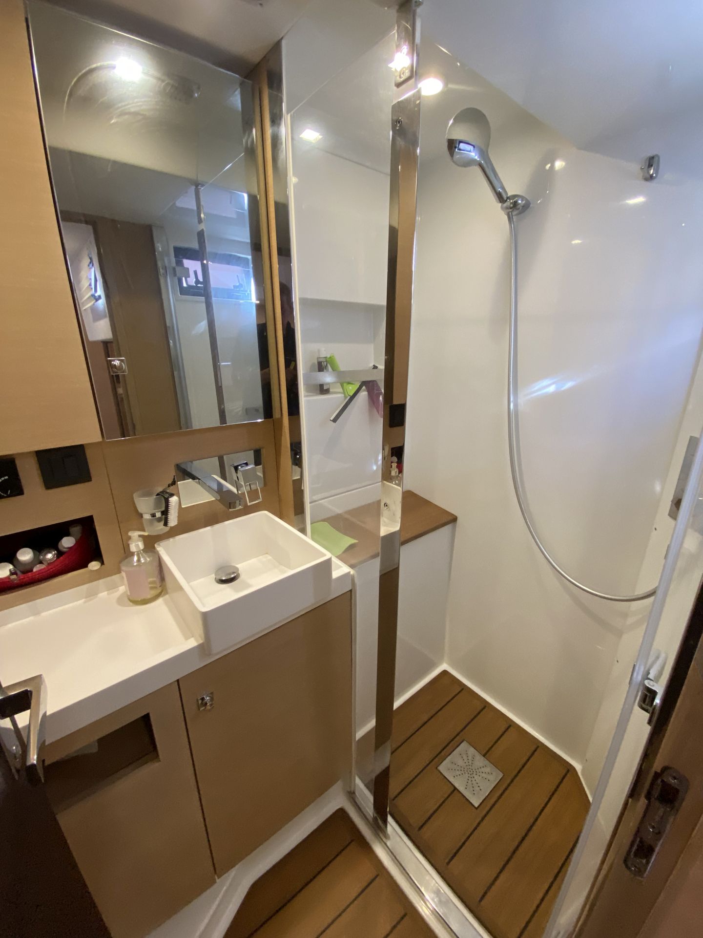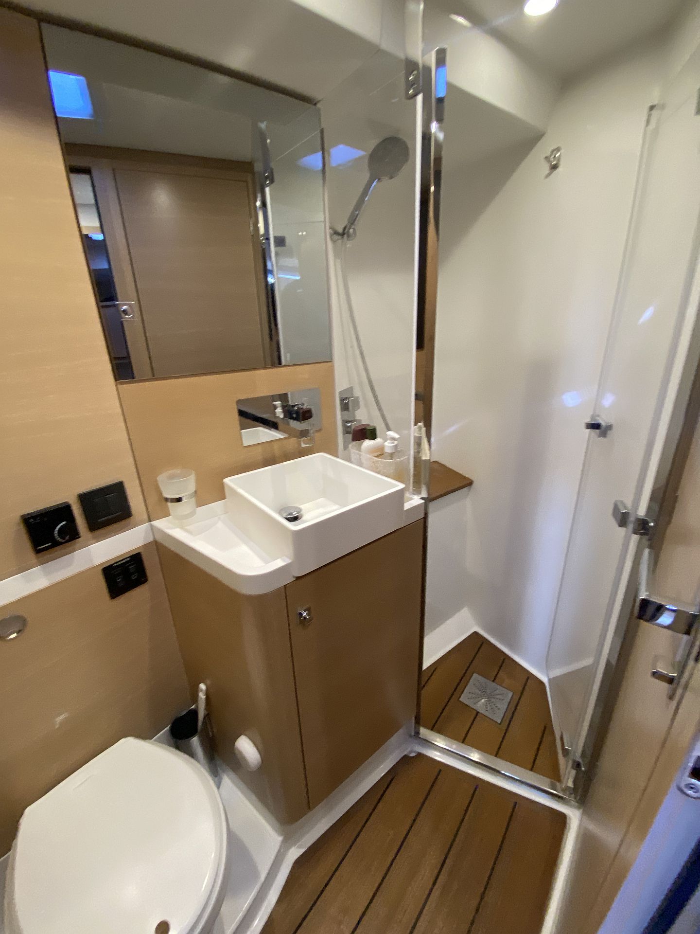 - Eignerbad mit separater Duschkabine und elektrischer Toilette an Backbord