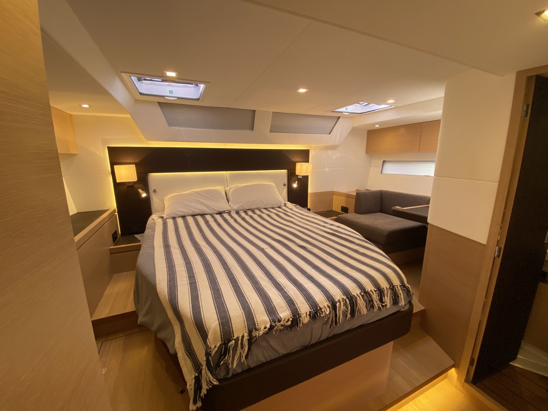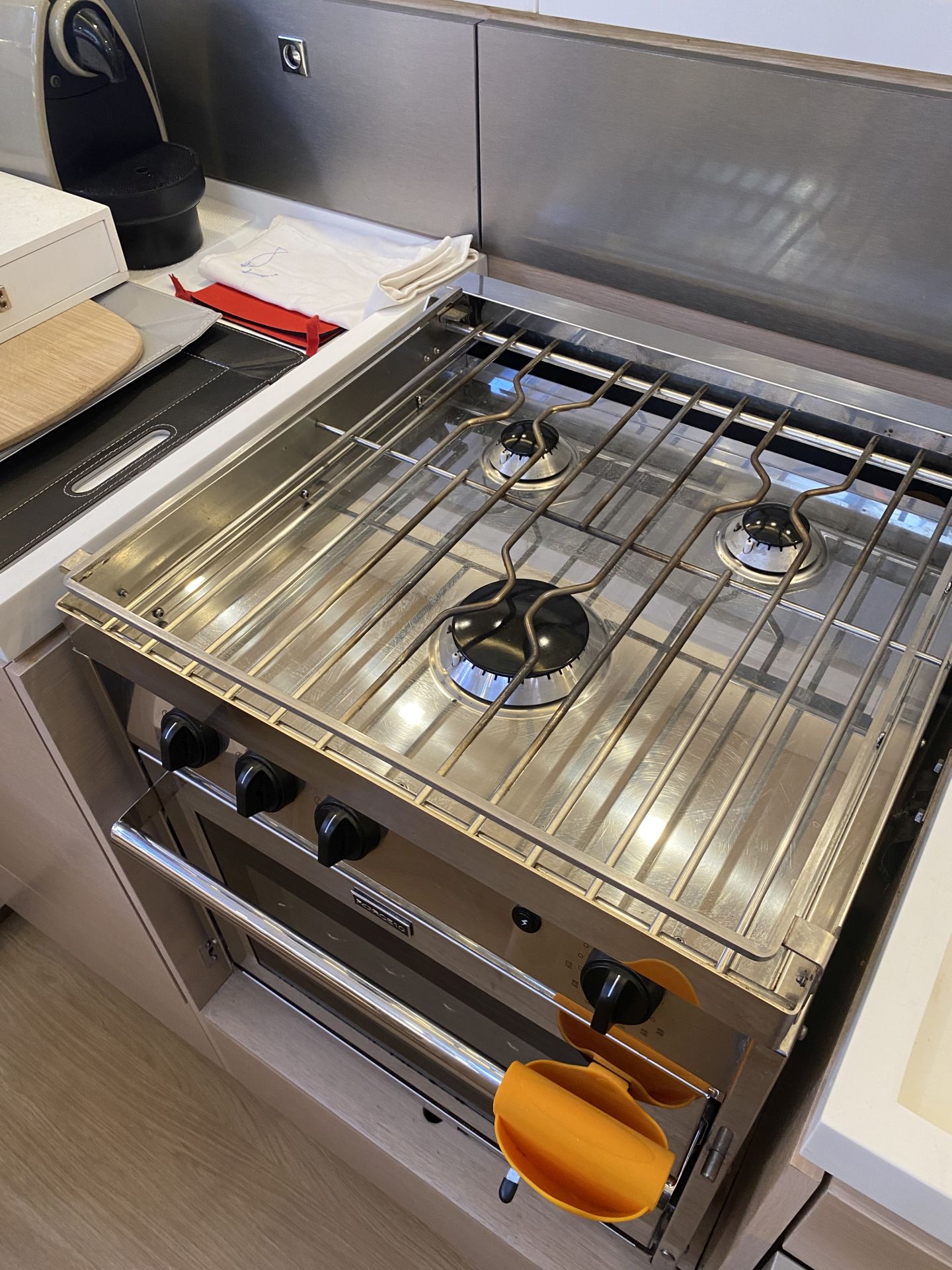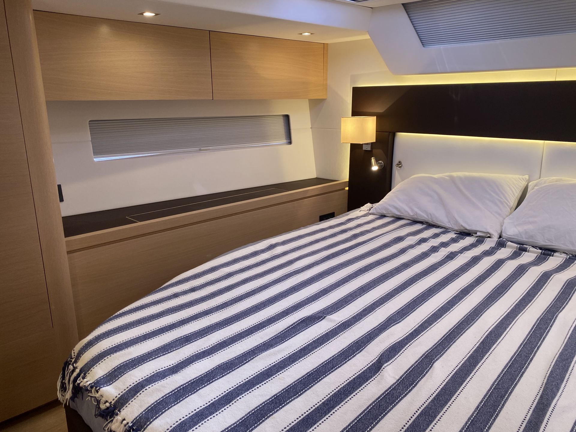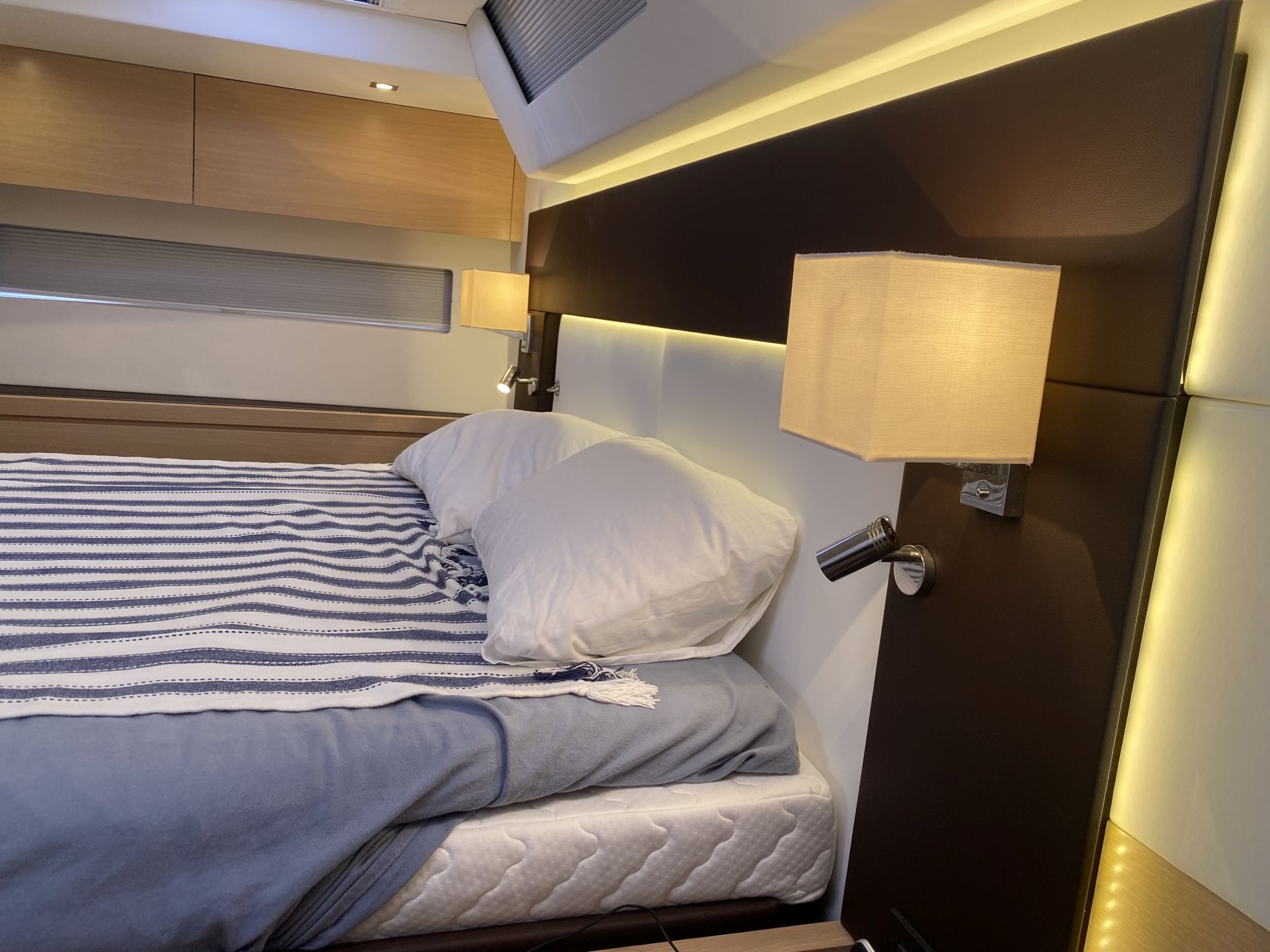 - Elektroherd FORCE 10 (3 Flammen und Backofen) - Luxuriöse, geräumige Eignerkabine im Heck mit breiter, freistehender Doppelkoje, Sessel und Schminktisch, reichlich Stauraum in Schränken, Fächern, Regalen und unter der Koje, die mit Gasdruckfedern hochgeklappt werden kann.