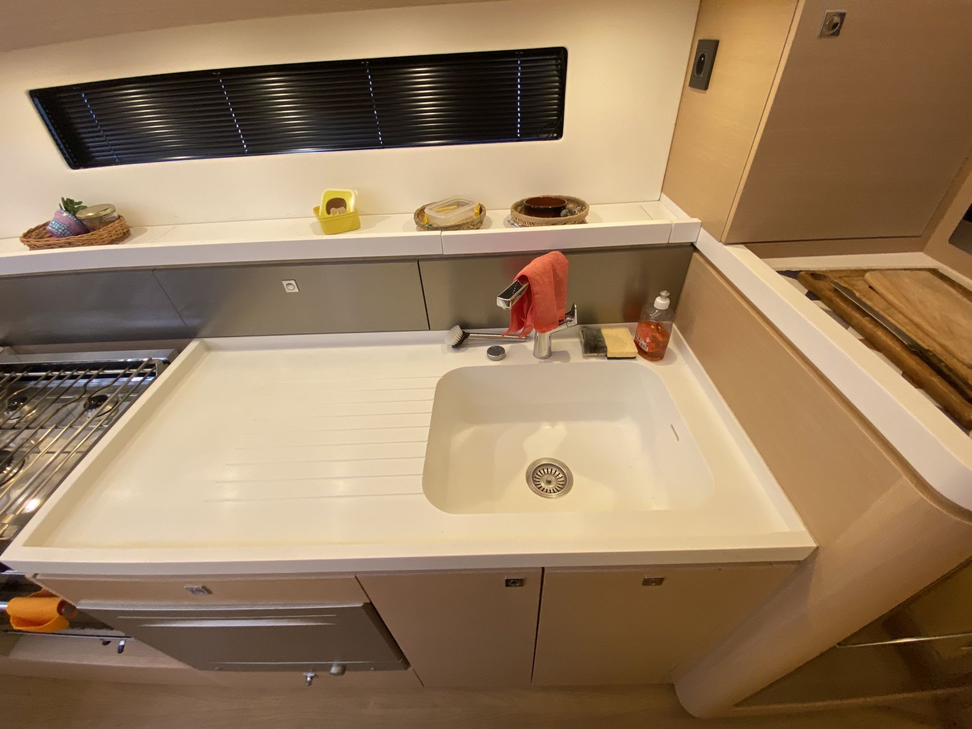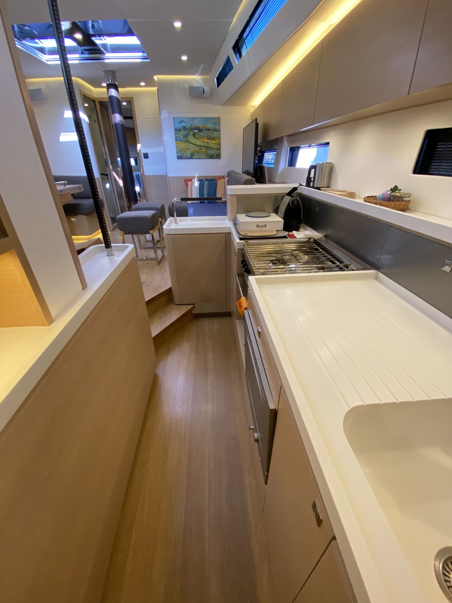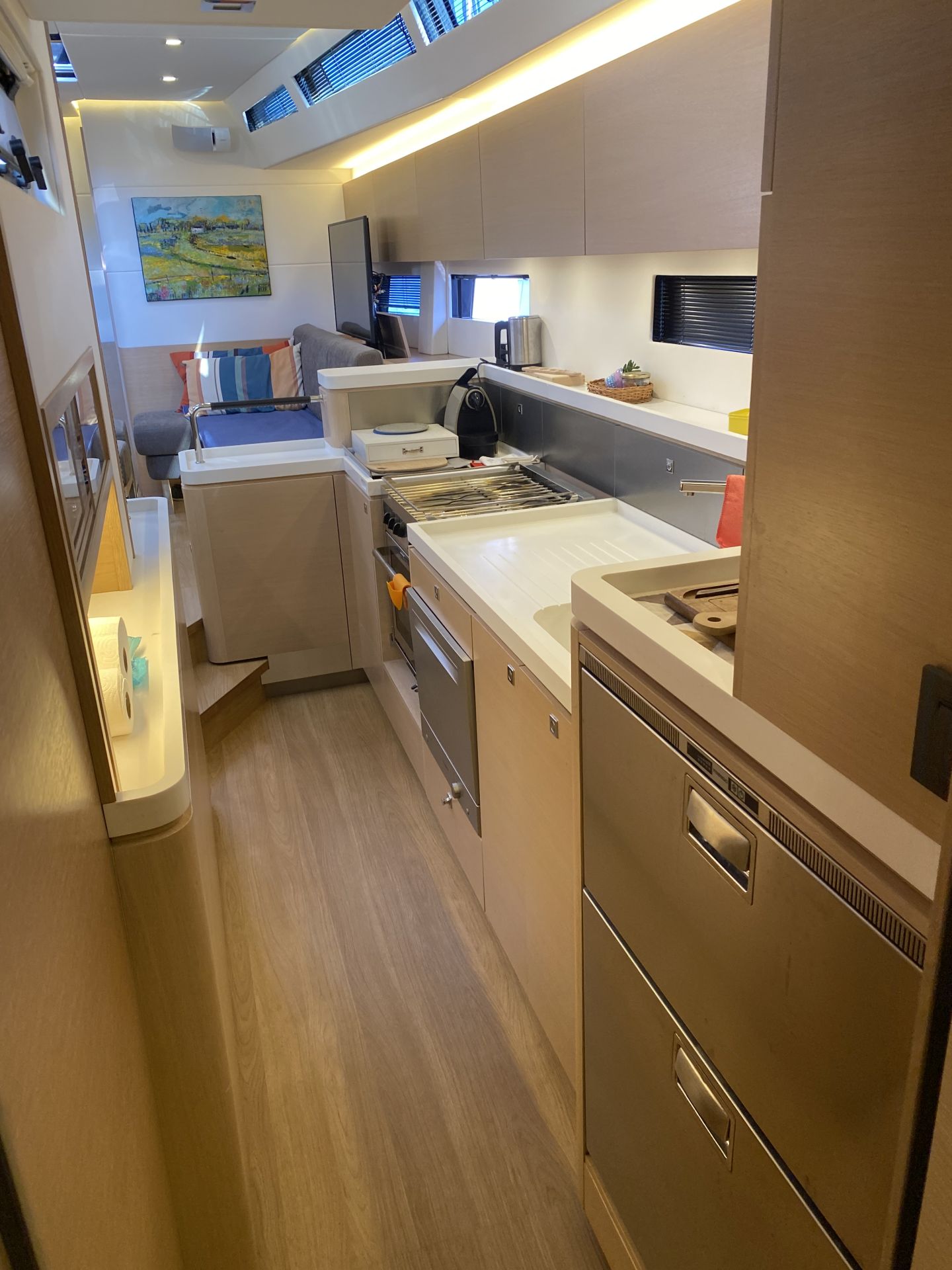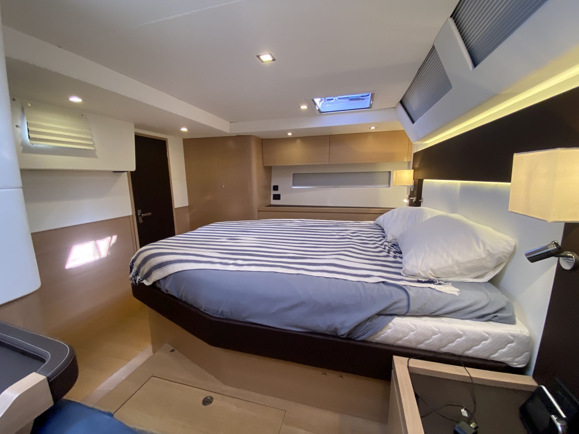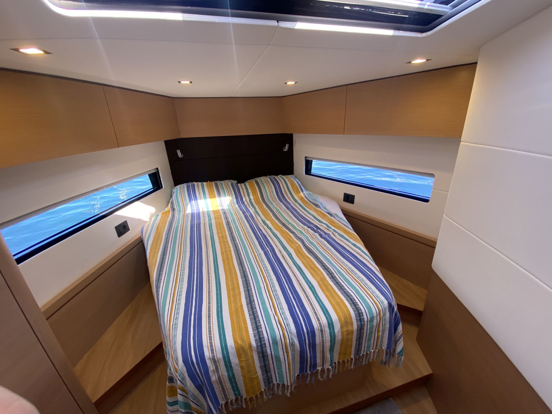 - Elektroherd FORCE 10 (3 Flammen und Backofen) - Luxuriöse, geräumige Eignerkabine im Heck mit breiter, freistehender Doppelkoje, Sessel und Schminktisch, reichlich Stauraum in Schränken, Fächern, Regalen und unter der Koje, die mit Gasdruckfedern hochgeklappt werden kann.