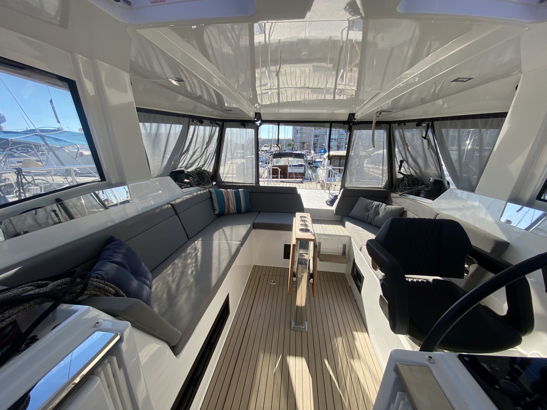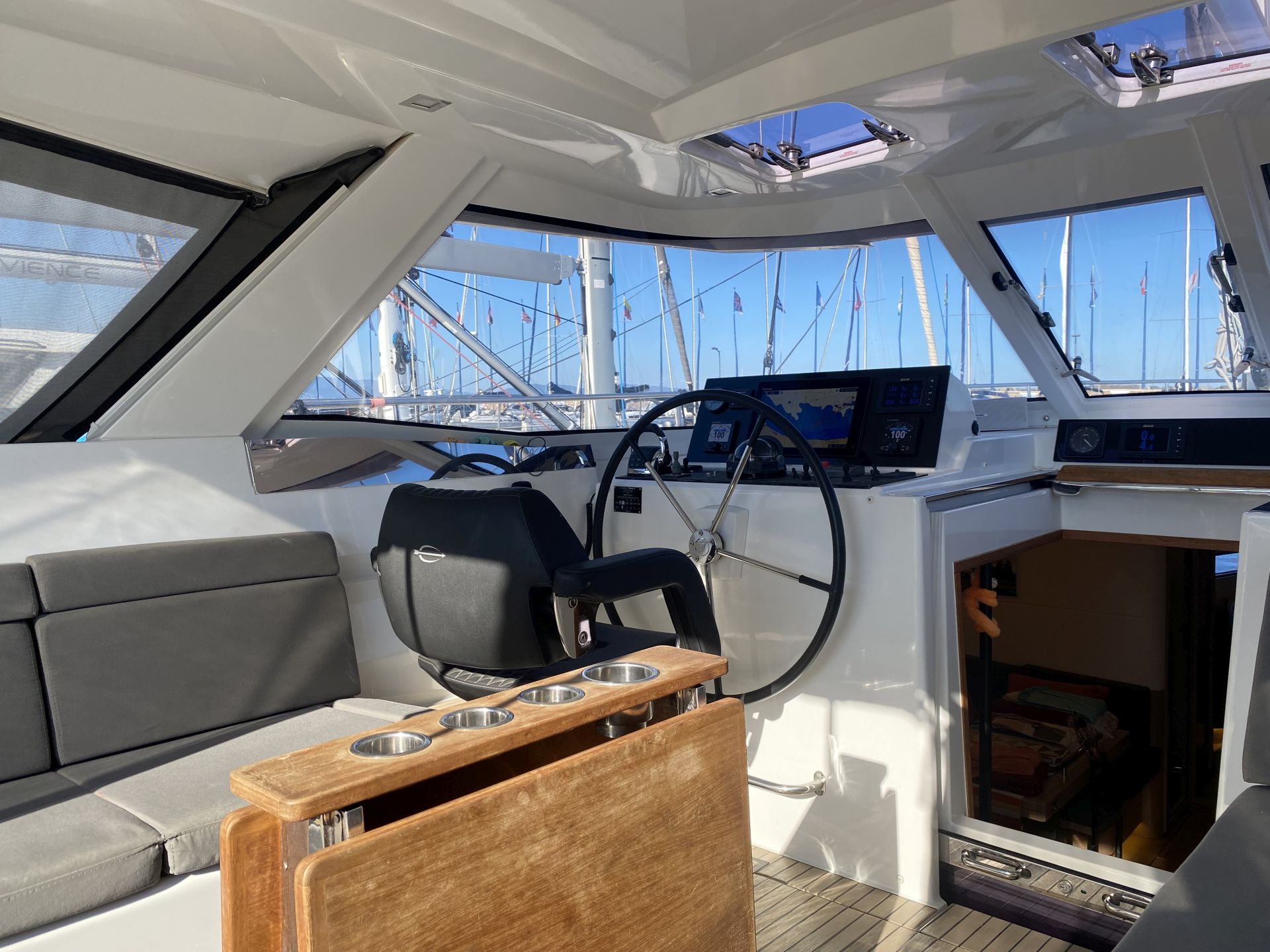 - Tiefes gut geschütztes Cockpit mit Steuerstand und Steuersitz an Backbord
