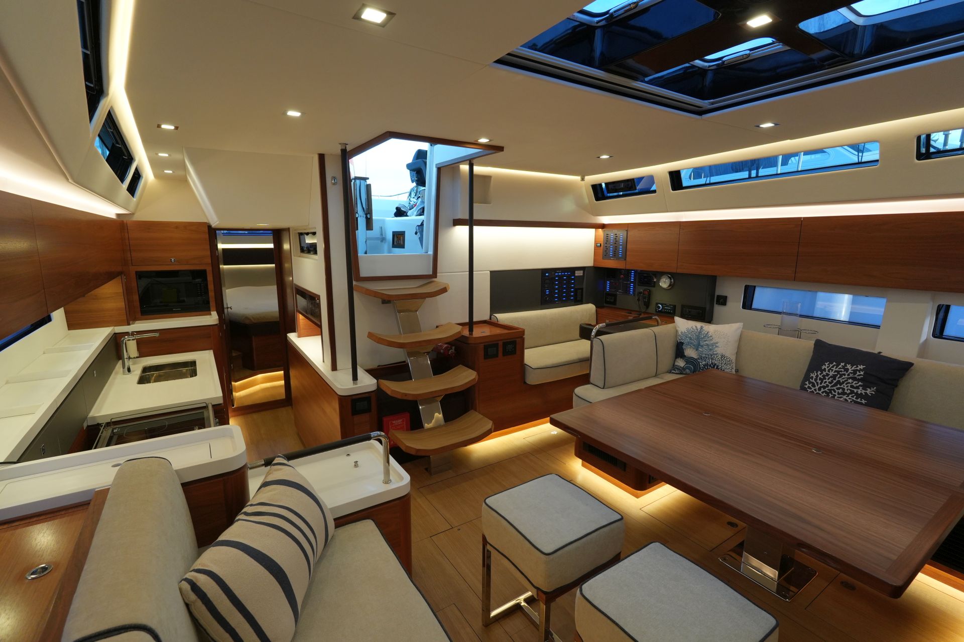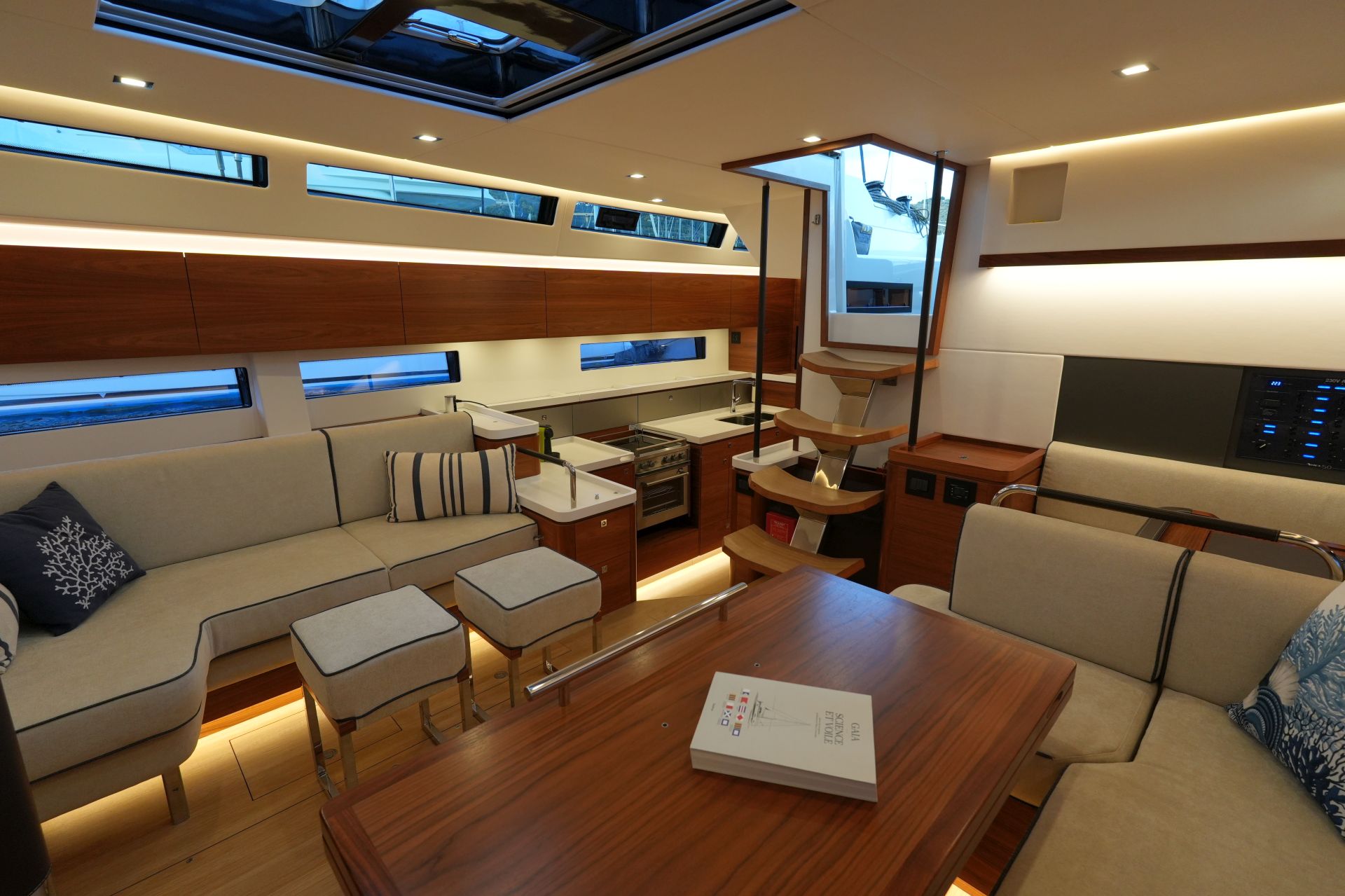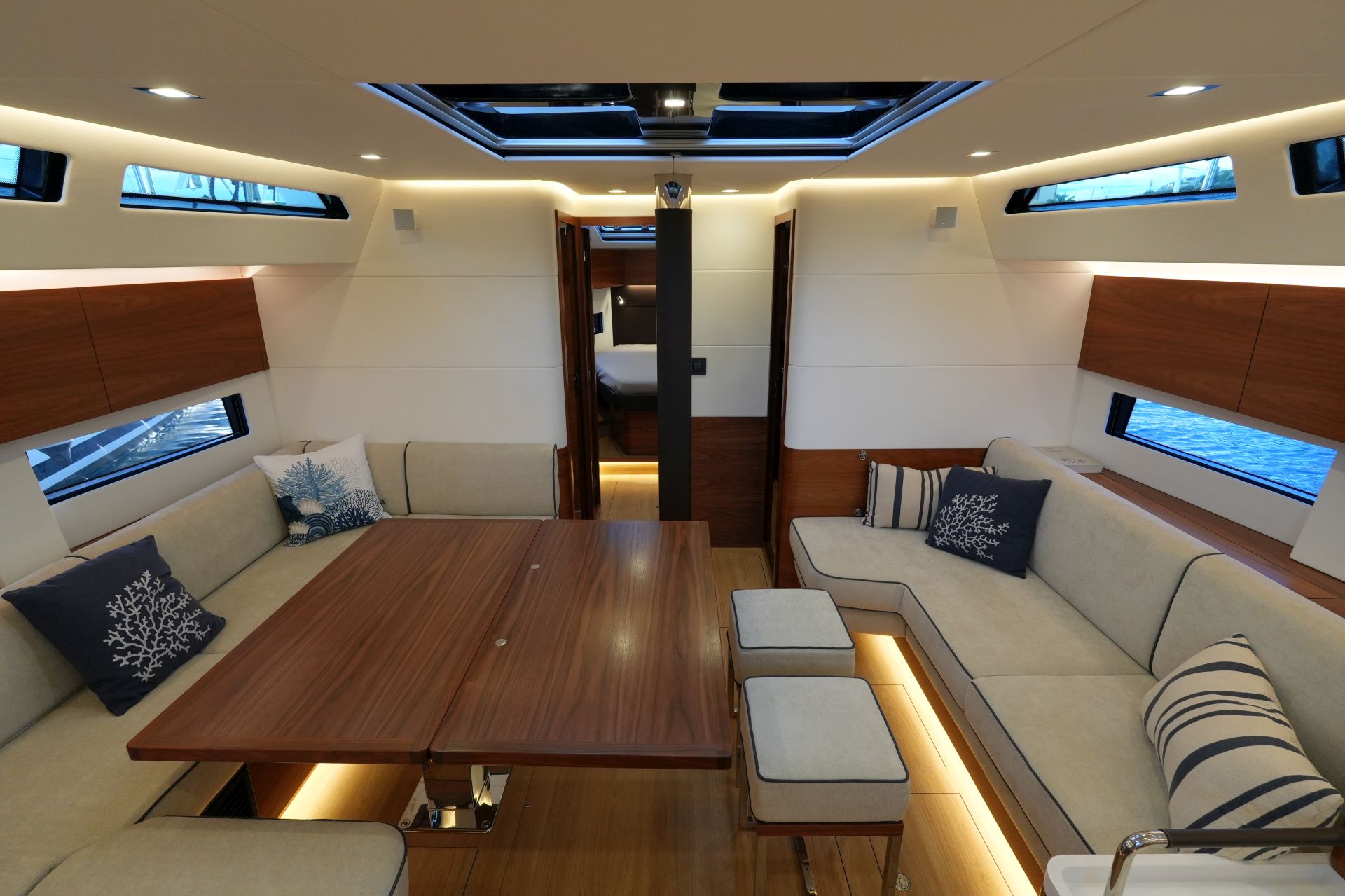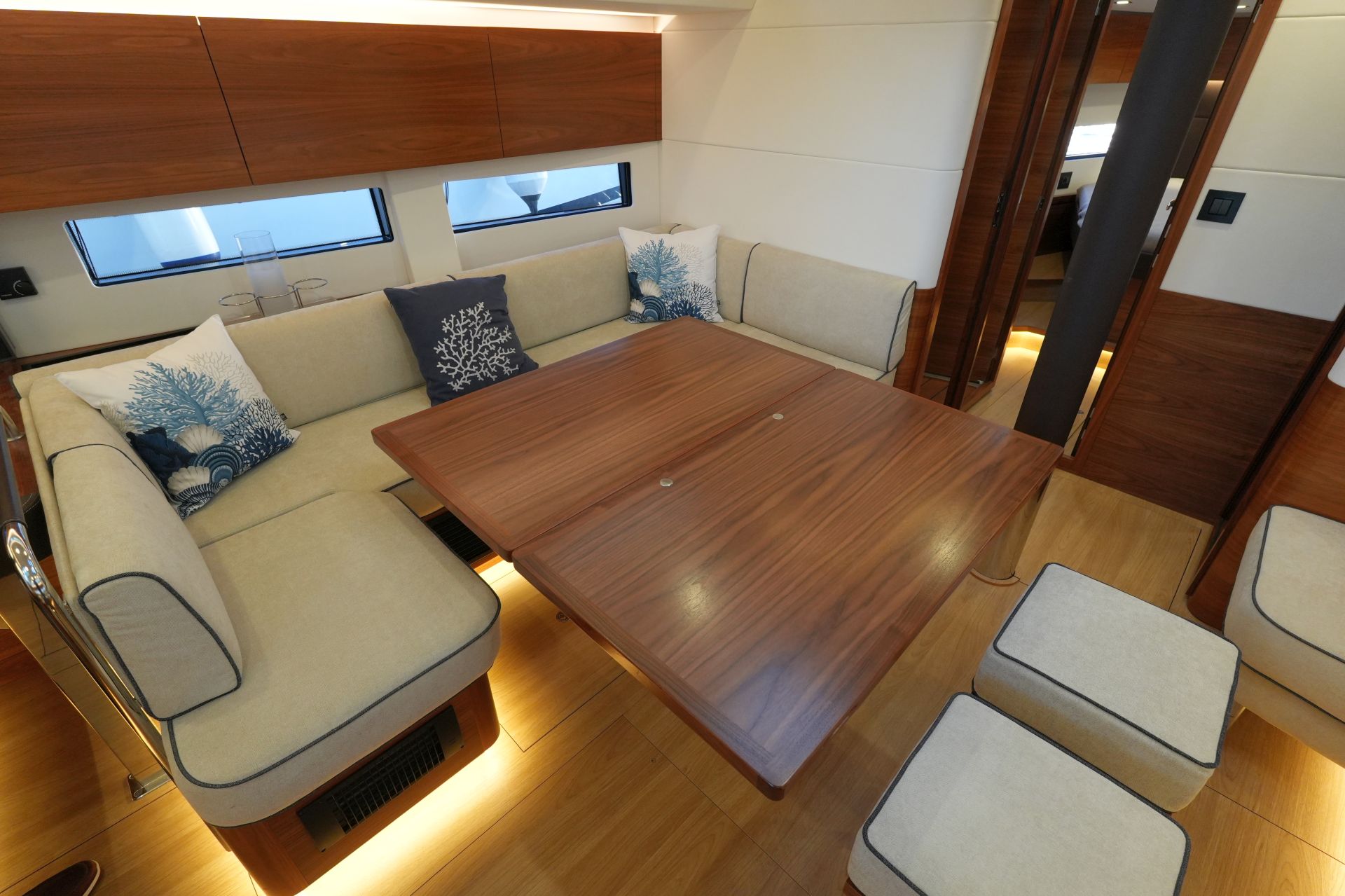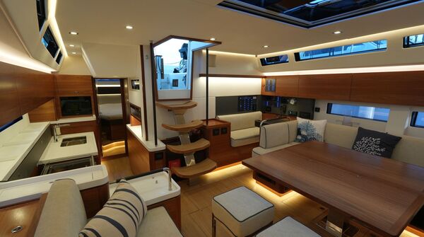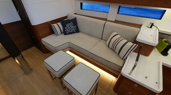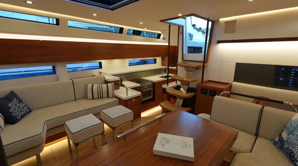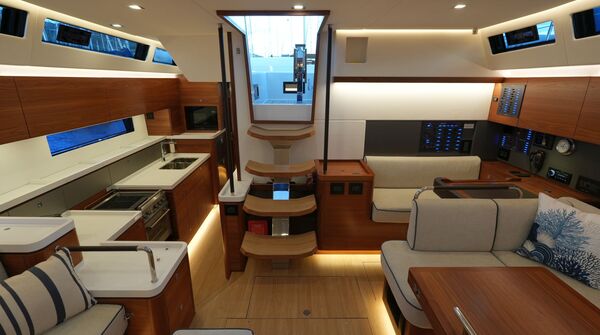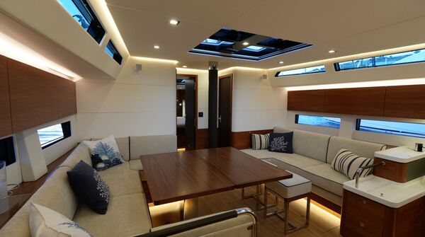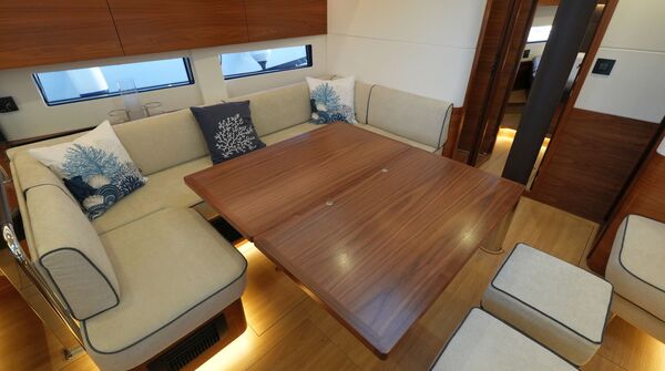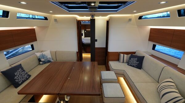 - Großzügiger, geräumiger Salon mit U-förmiger Sitzgruppe an Backbord