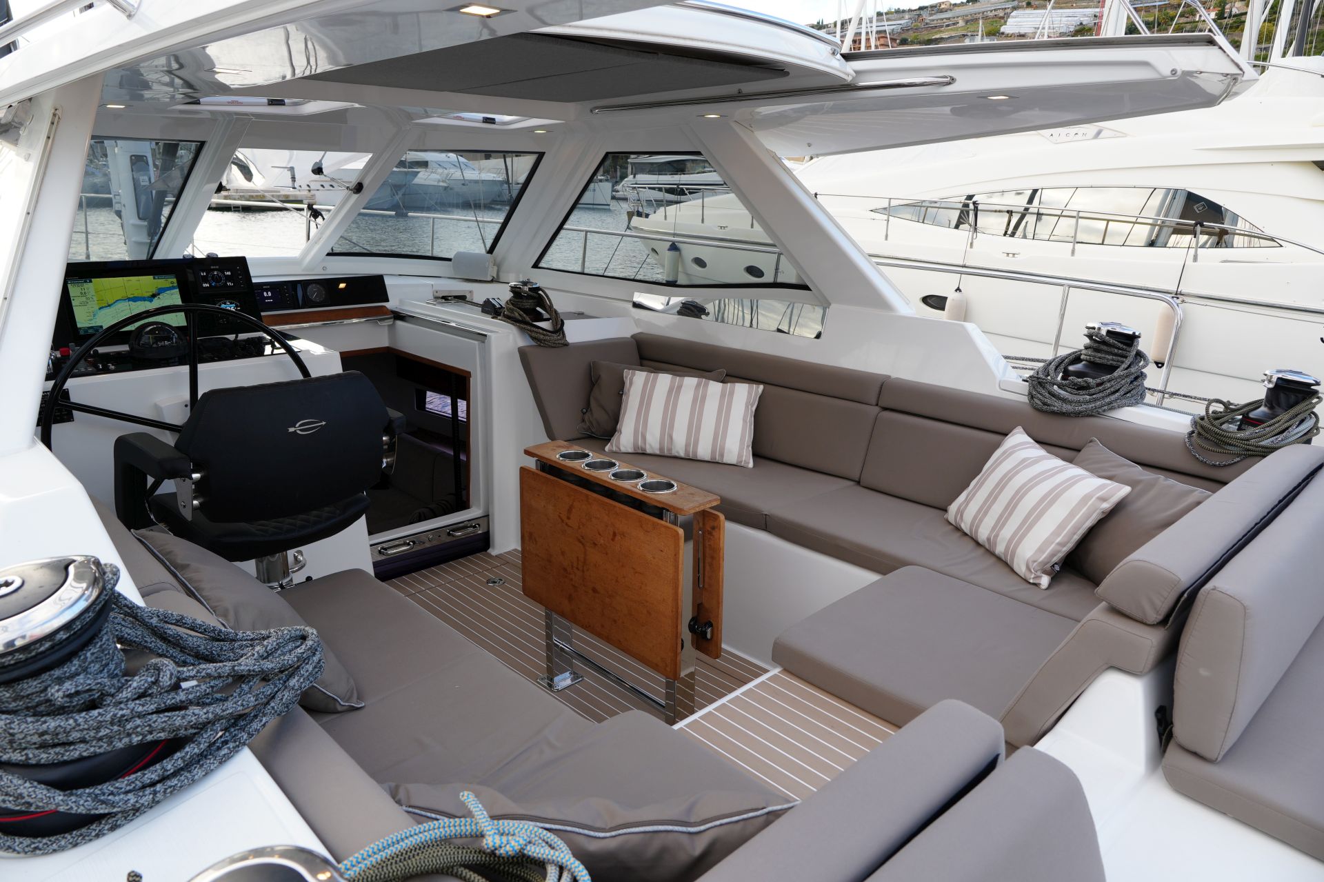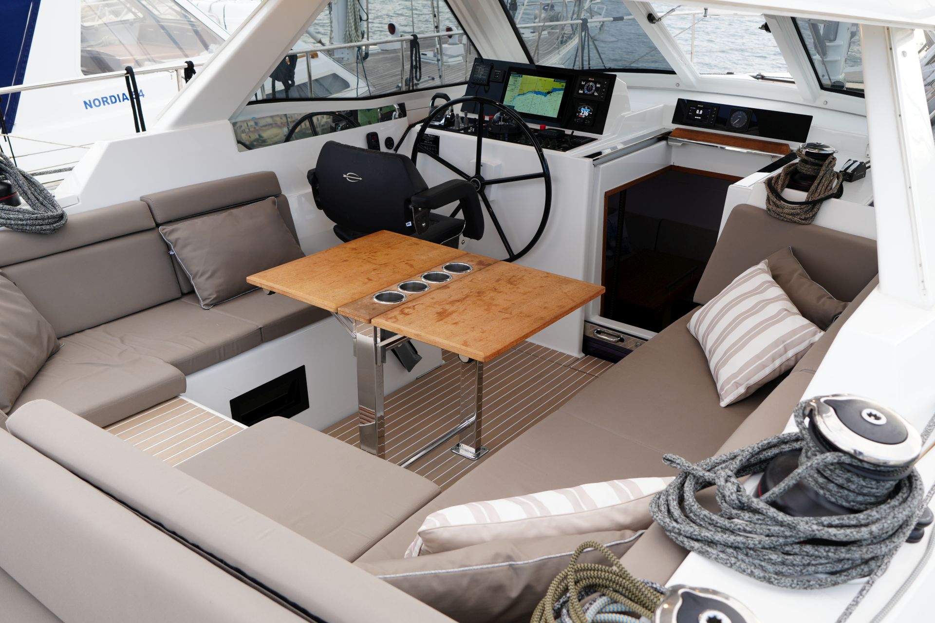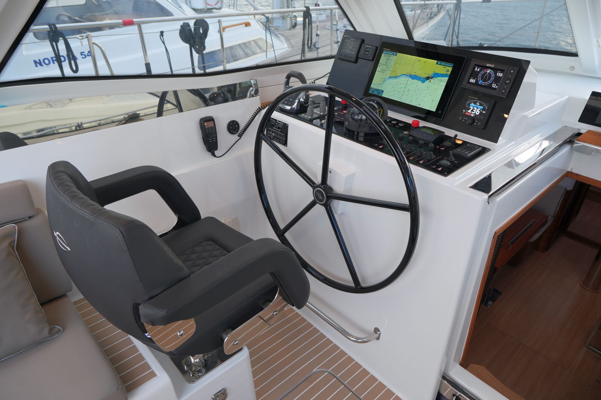- Tiefes gut geschütztes Cockpit mit Steuerstand und Steuersitz an Backbord