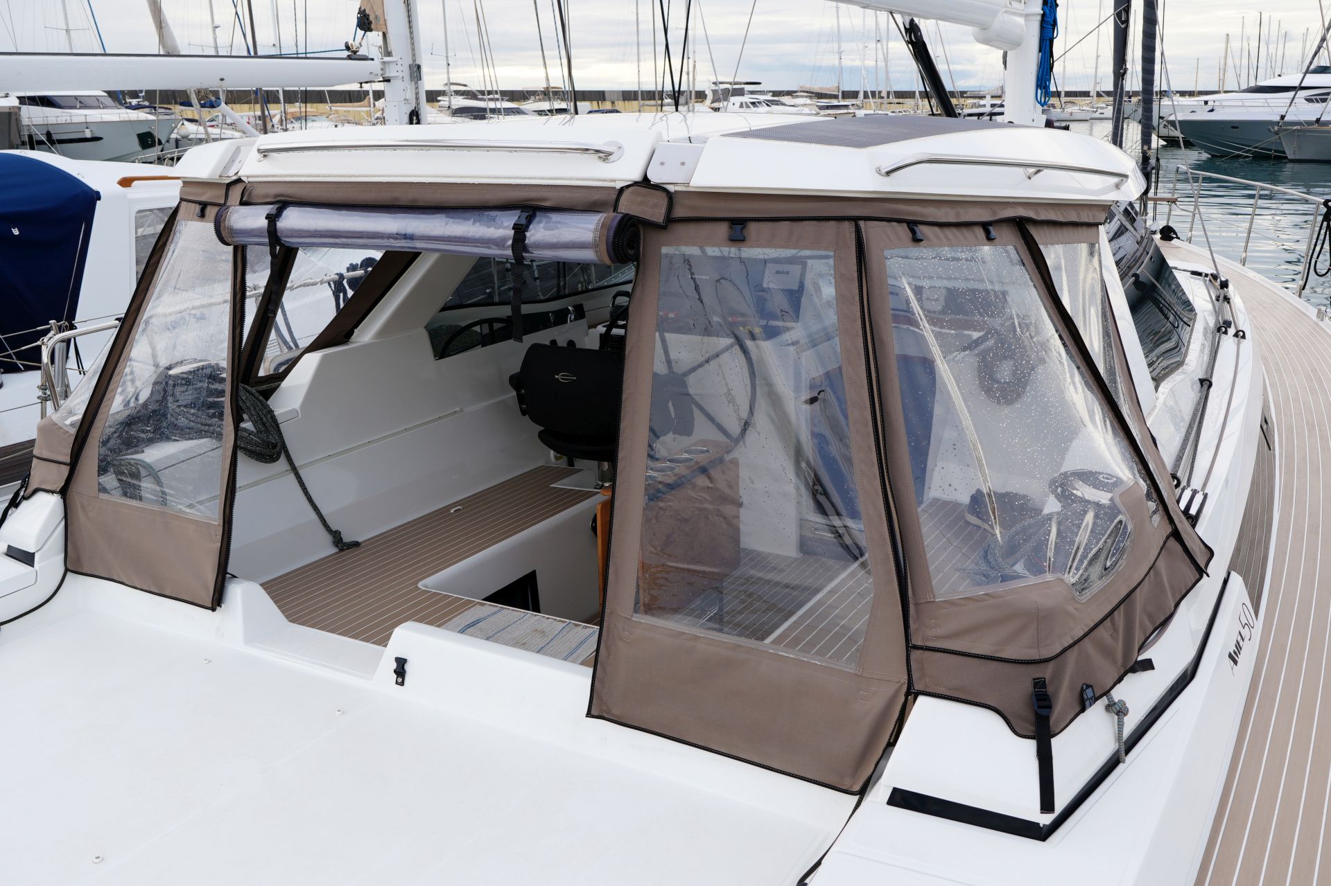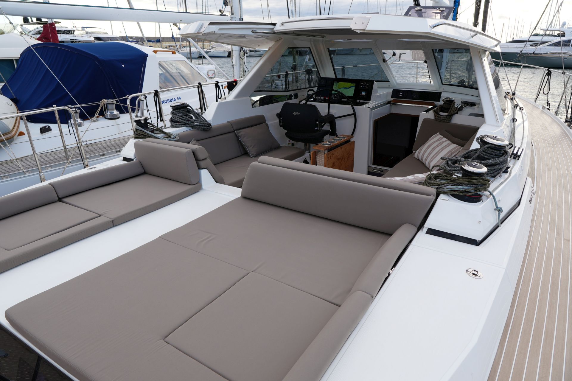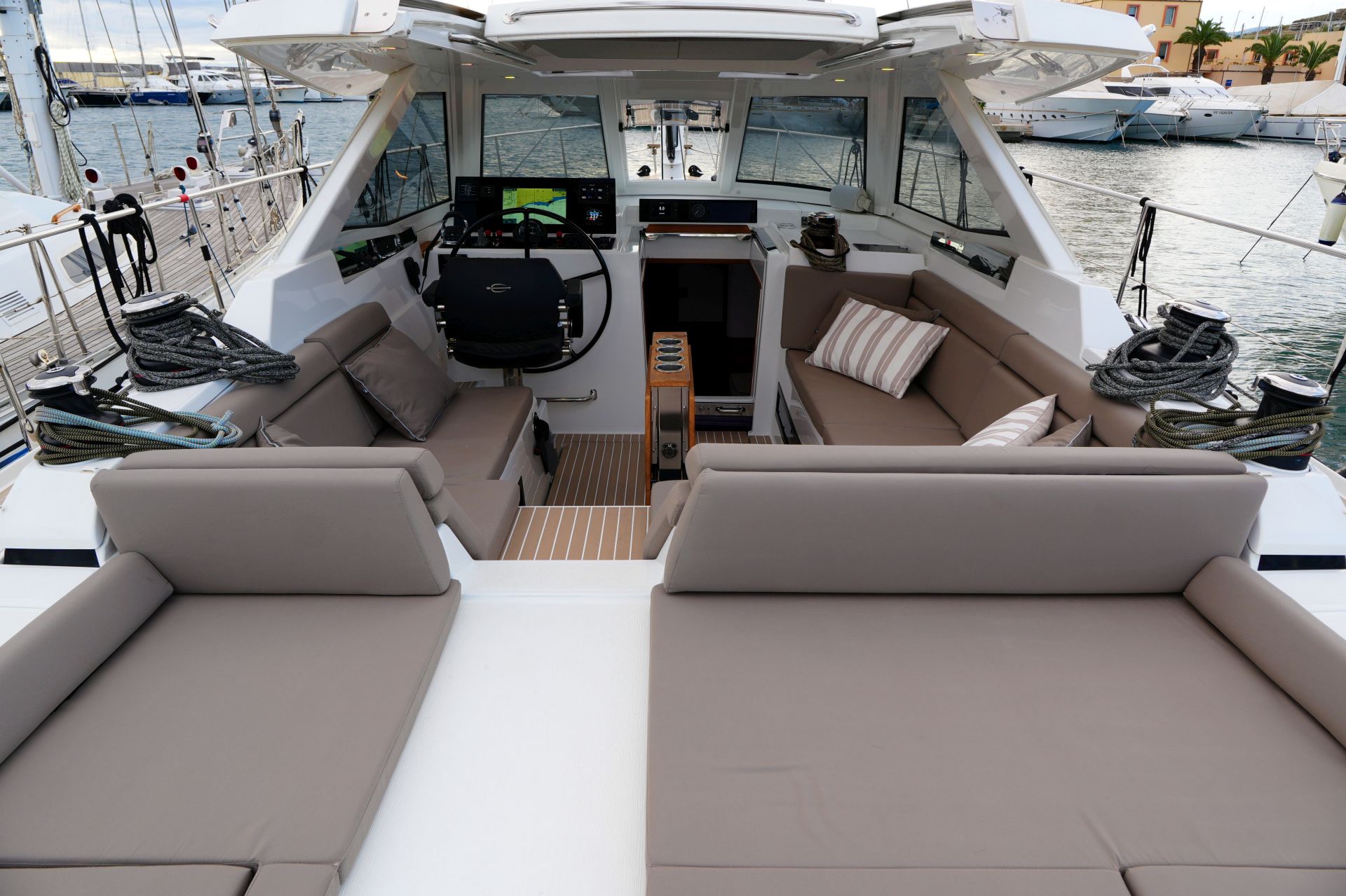 - Tiefes gut geschütztes Cockpit mit Steuerstand und Steuersitz an Backbord