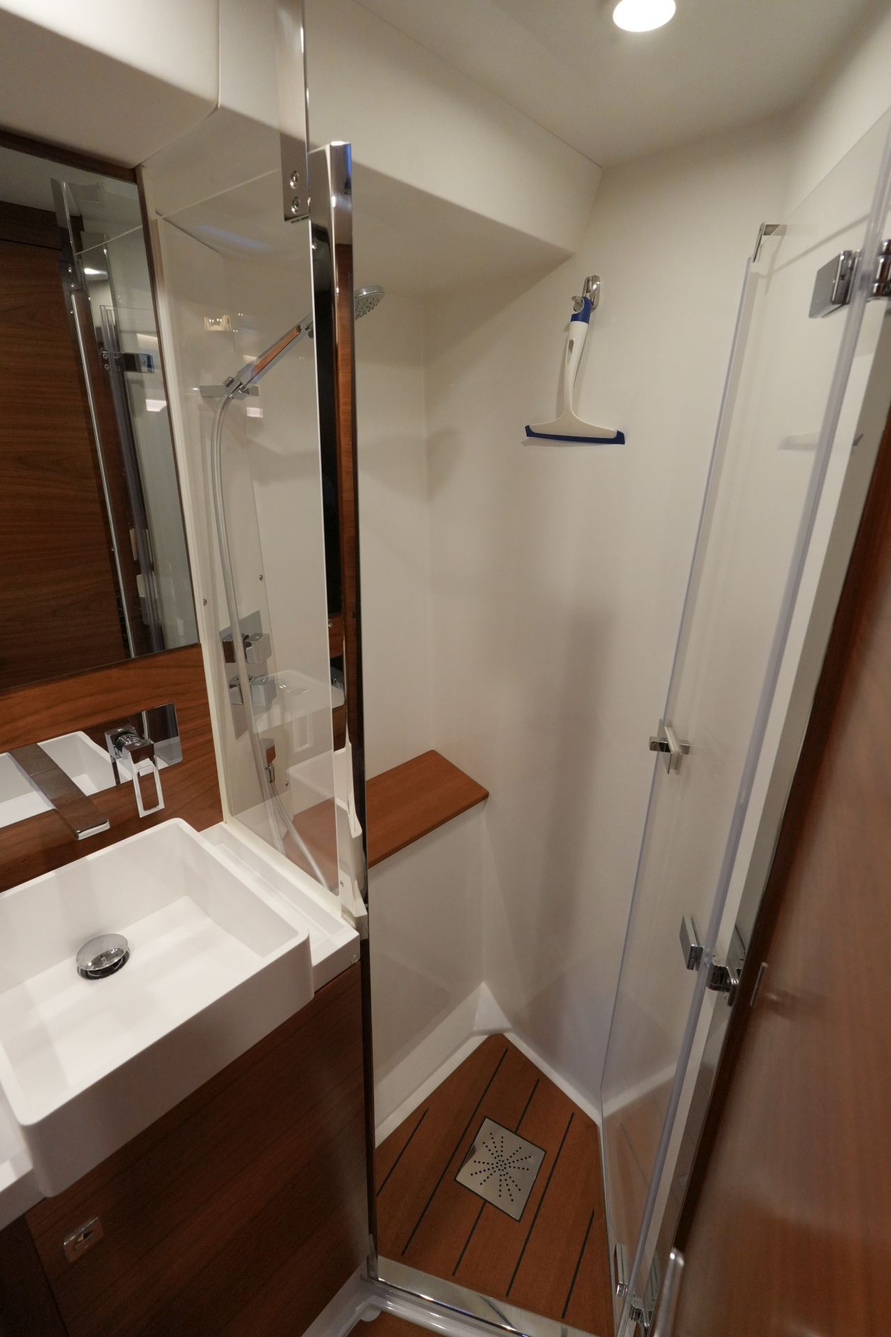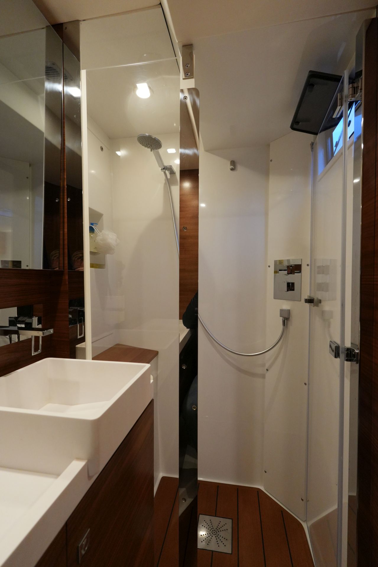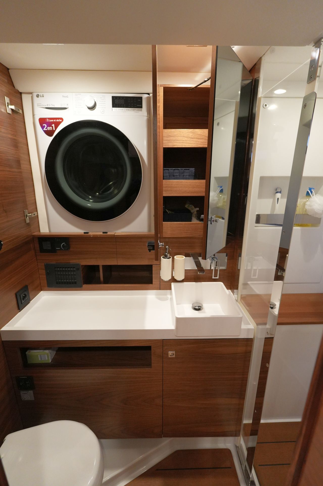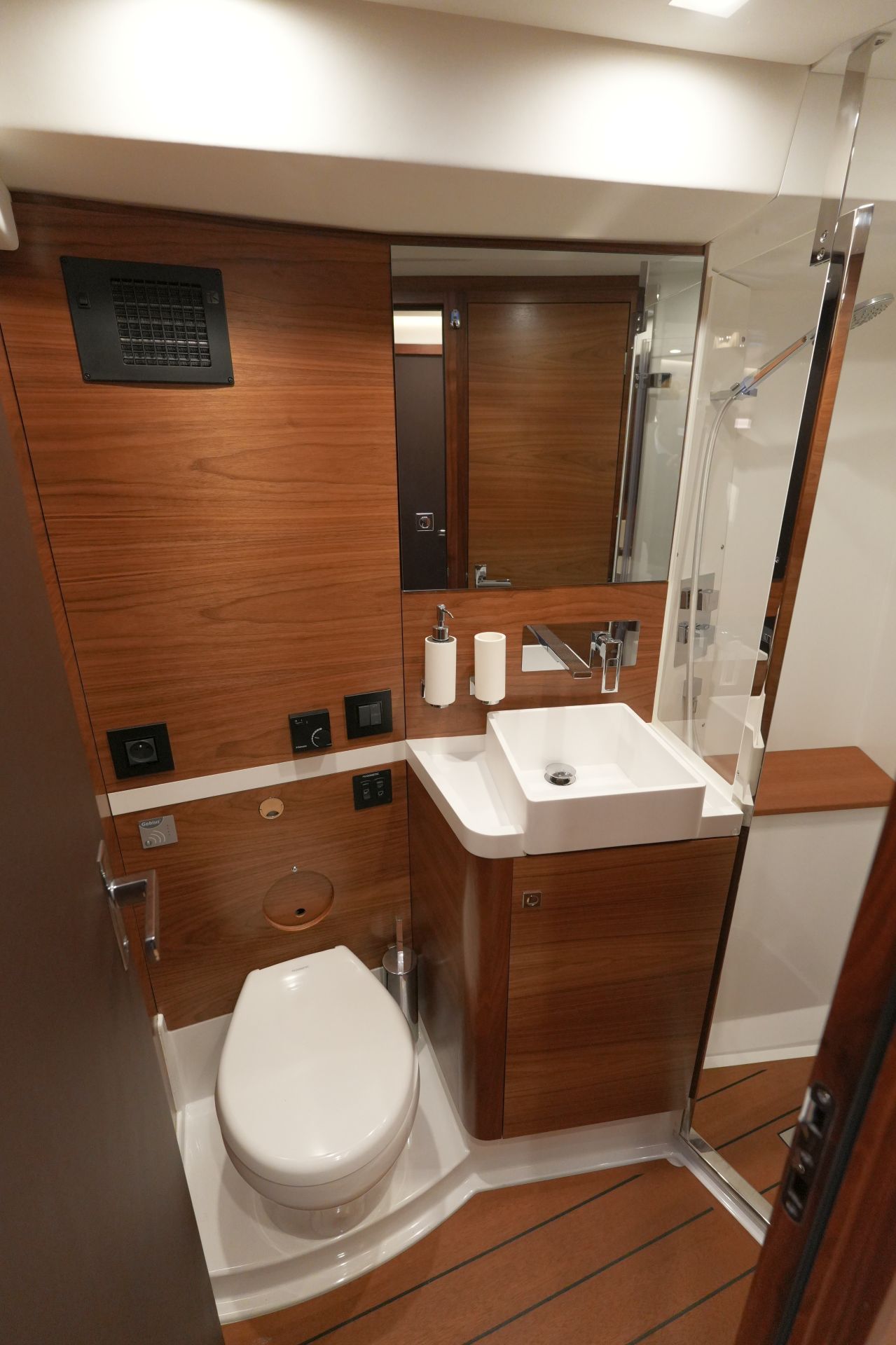 - Nasszelle mit Waschtisch, separater Duschkabine und elektrischer Toilette an Backbord
