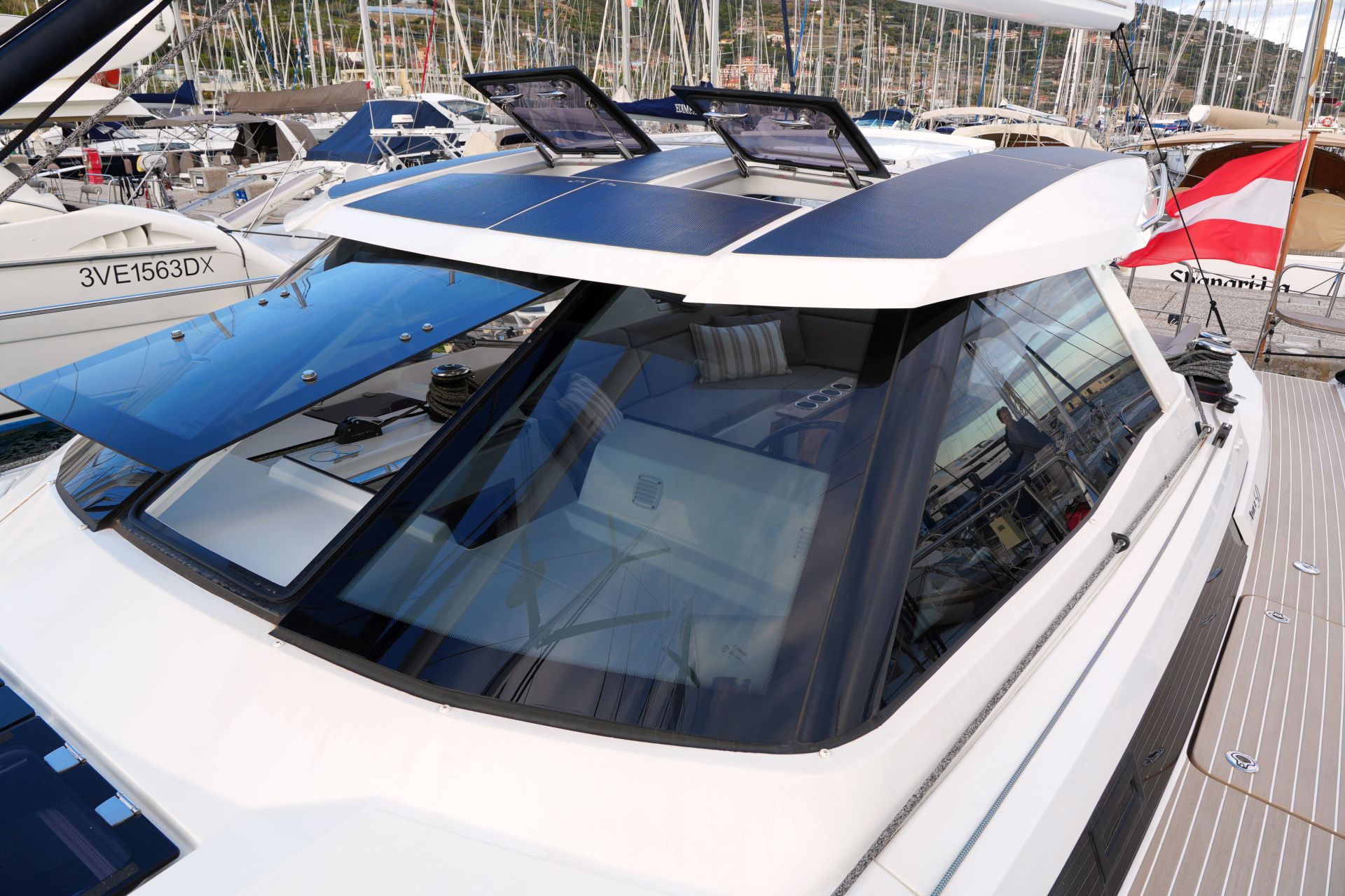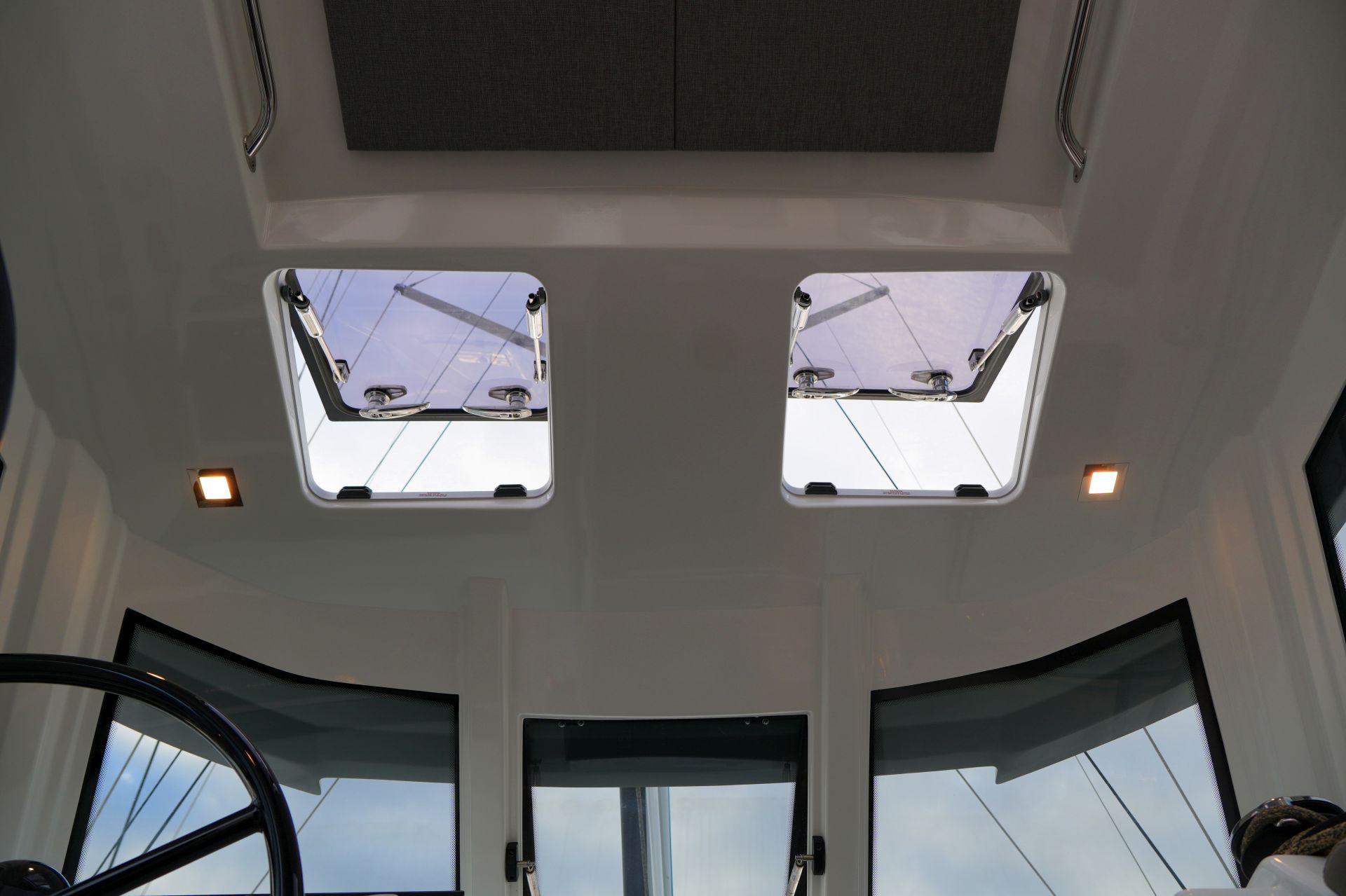 - Doghouse mit Windschutzscheibe (zentrale Scheibe zum Öffnen), zwei Luken im Dach, Deckenbeleuchtung und achtern ausziehbarem GFK-Schiebedach