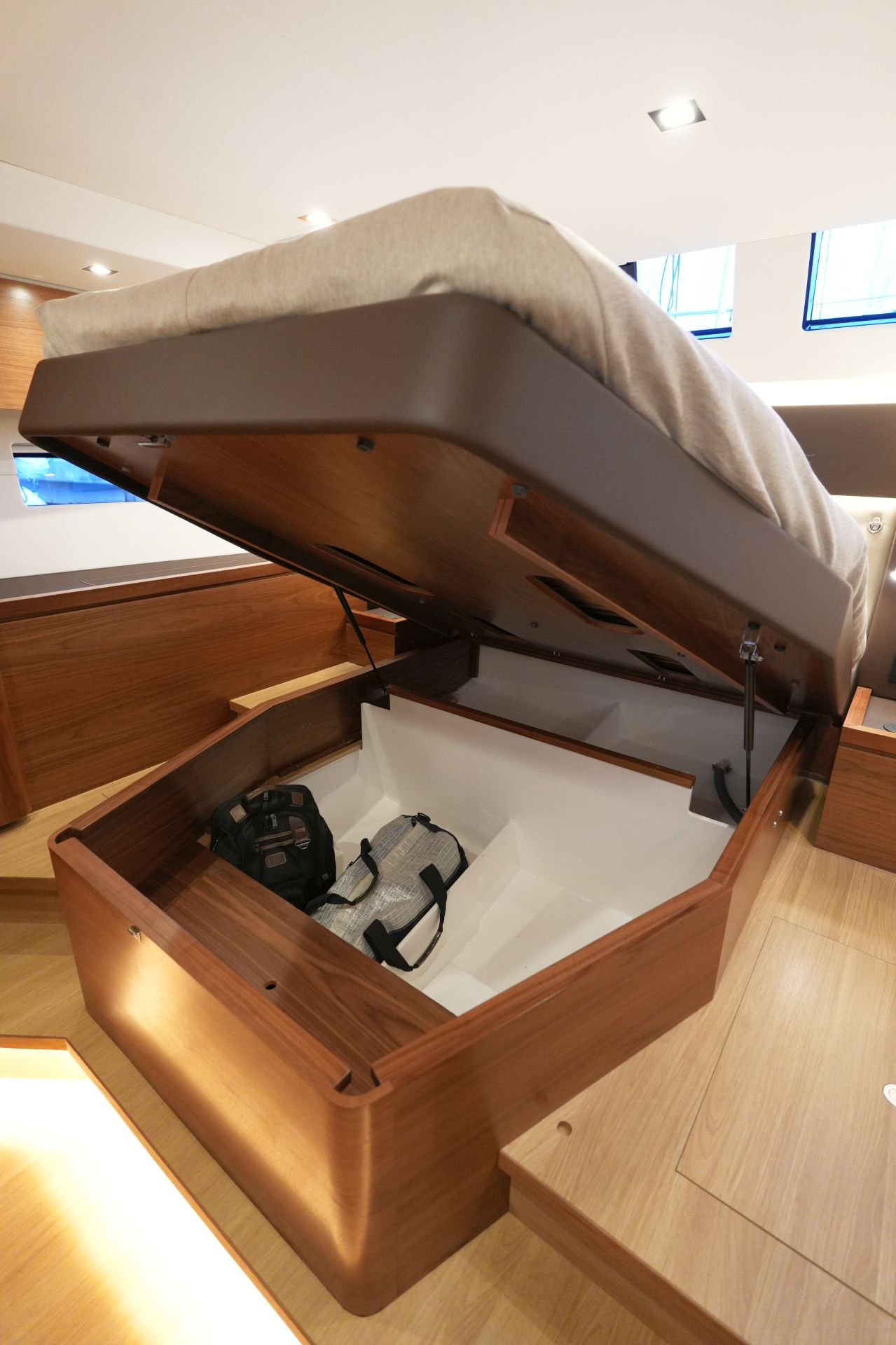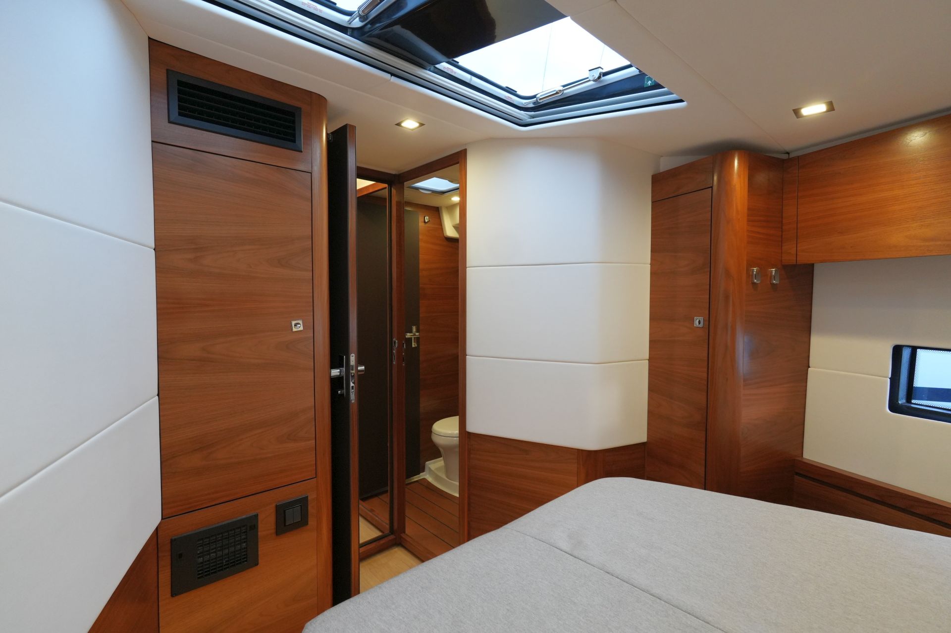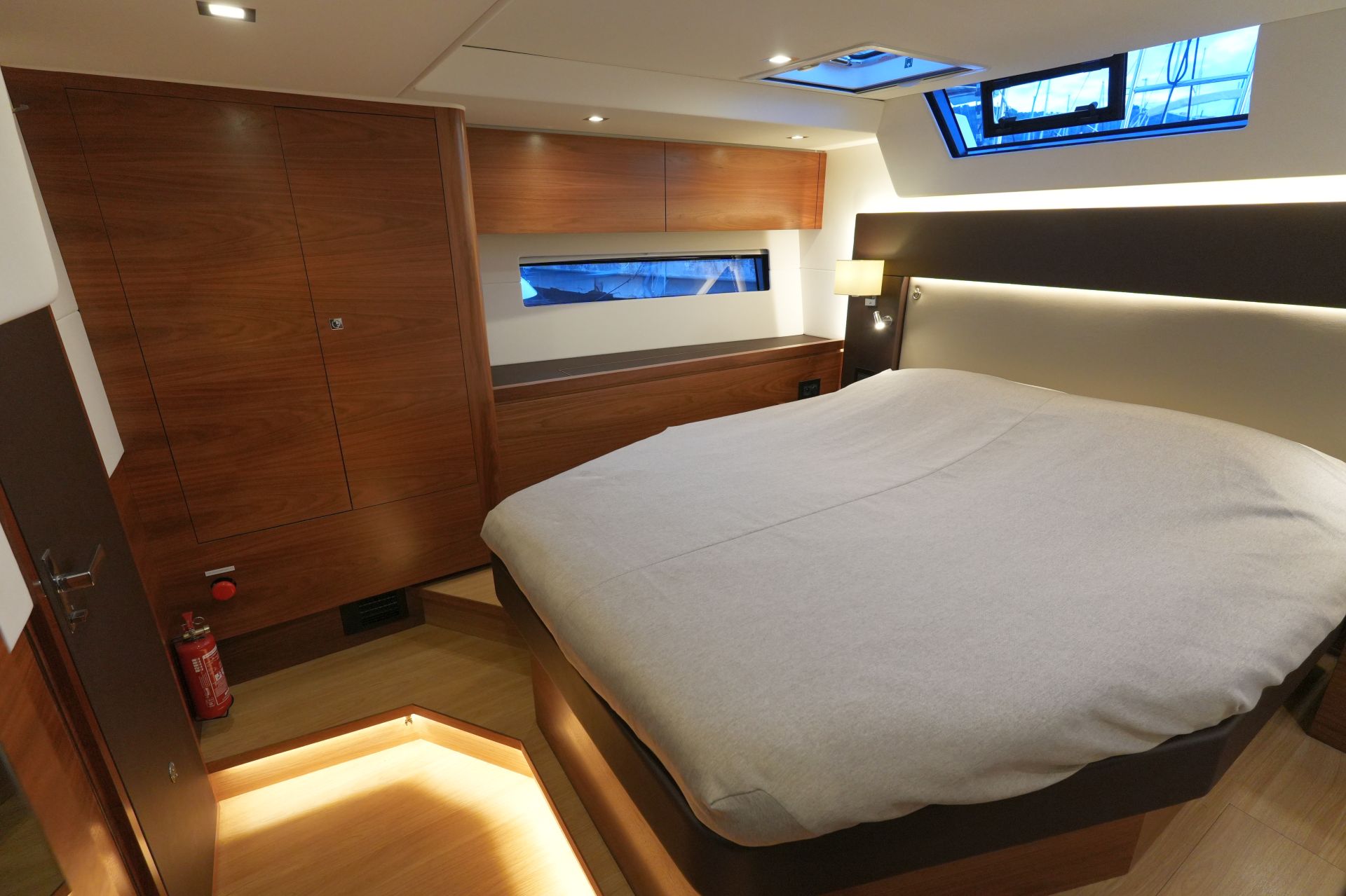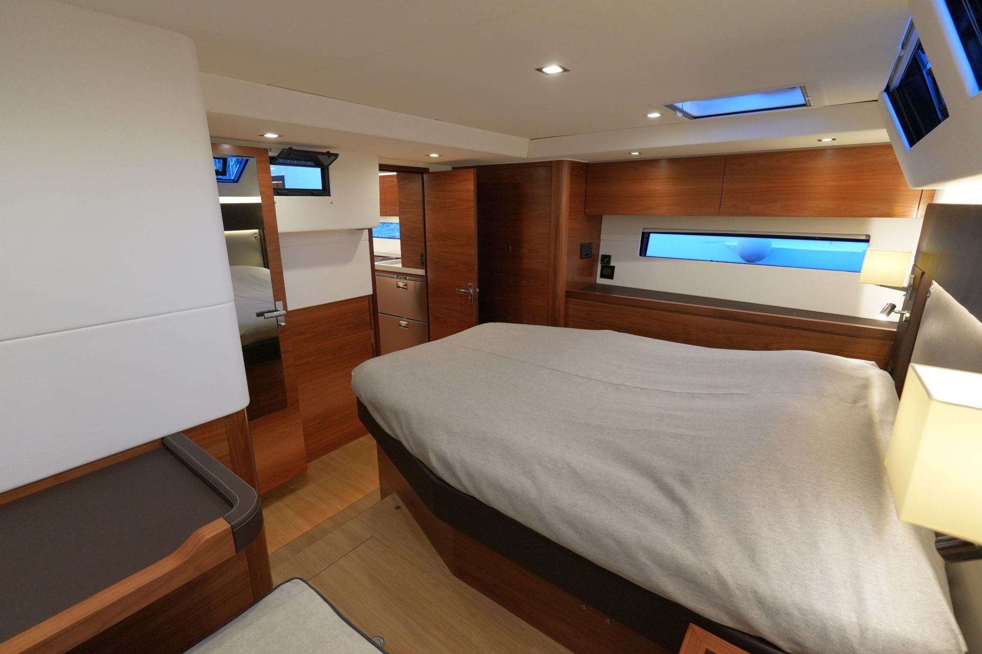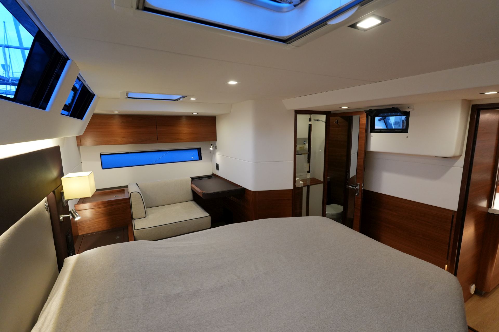 - Nesspresso-Maschine - Luxuriöse, geräumige Eignerkabine im Heck mit breiter, freistehender Doppelkoje, Sessel und Schminktisch, reichlich Stauraum in Schränken, Fächern, Regalen und unter der Koje, die mit Gasdruckfedern hochgeklappt werden kann