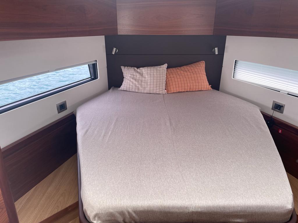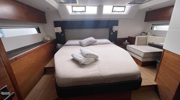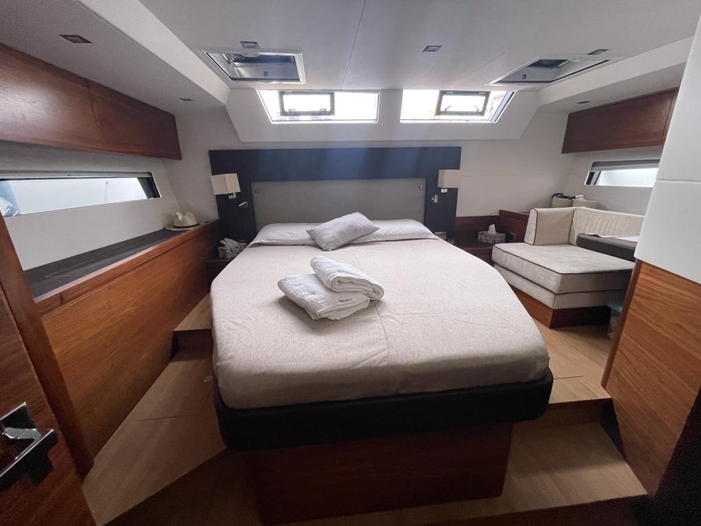• Luxuriöse, geräumige Eignerkabine im Heck mit breiter, frei stehender Doppelkoje, Sessel und Schminktisch, Safe, reichlich Stauraum in Schränken, Fächern, Regalen und unter der Koje, die mit Gasdruckfedern hochgeklappt werden kann.