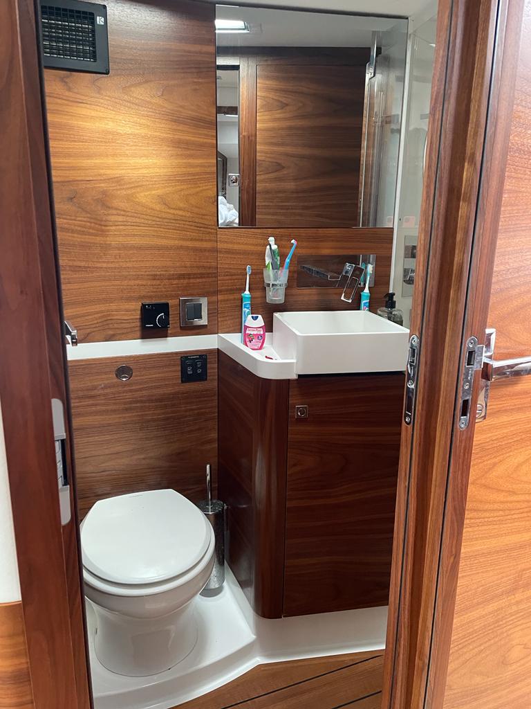 • Nasszelle mit separater Duschkabine und elektrischer Toilette an Backbord