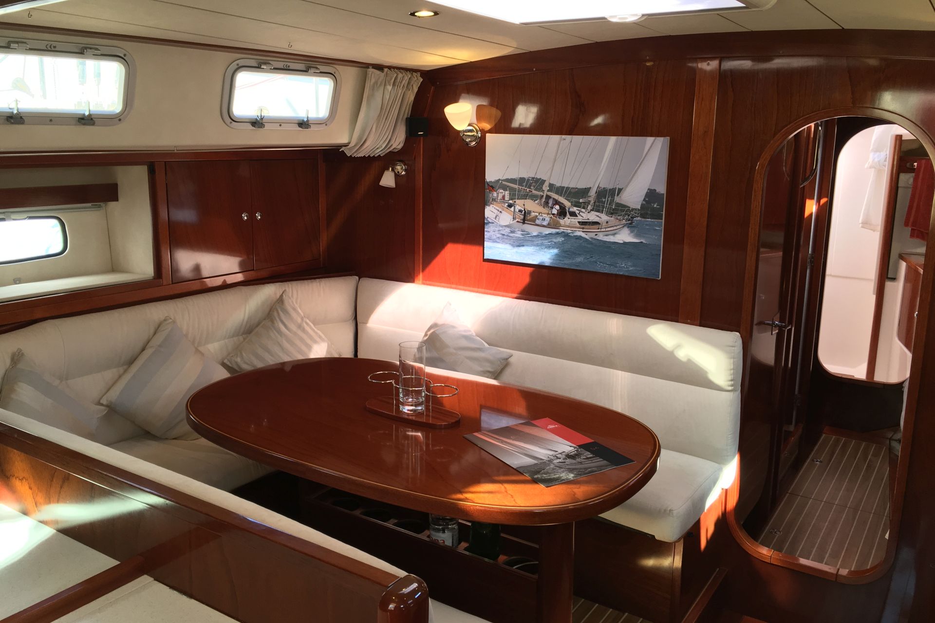 - Salon mit U-förmiger Dinette an Backbord um den Salontisch und zwei Einzelsesseln an Steuerbord