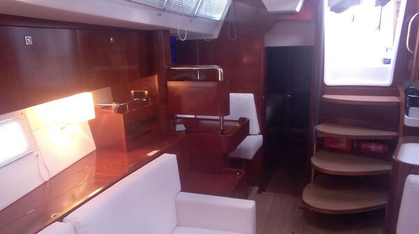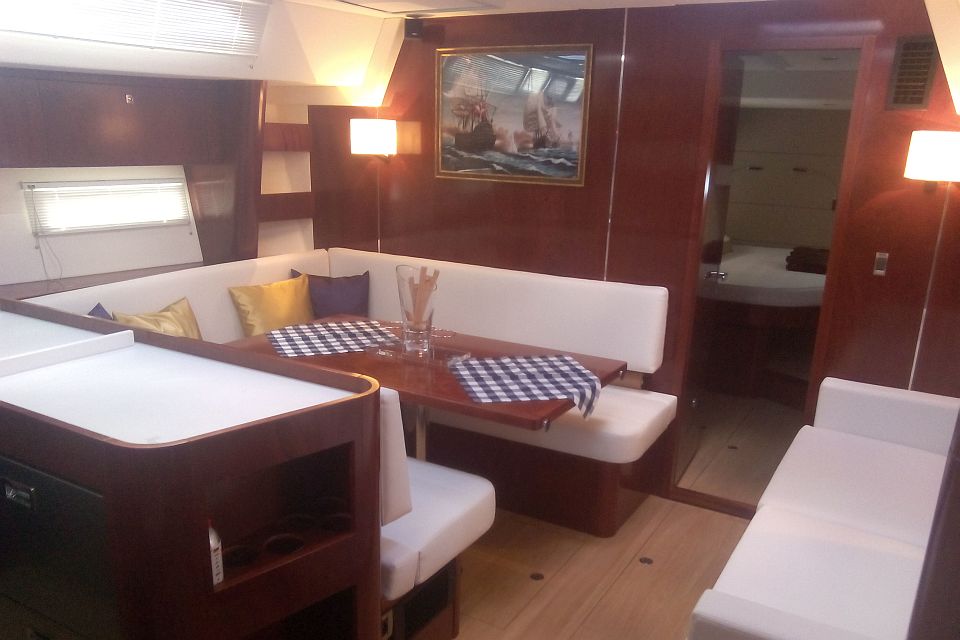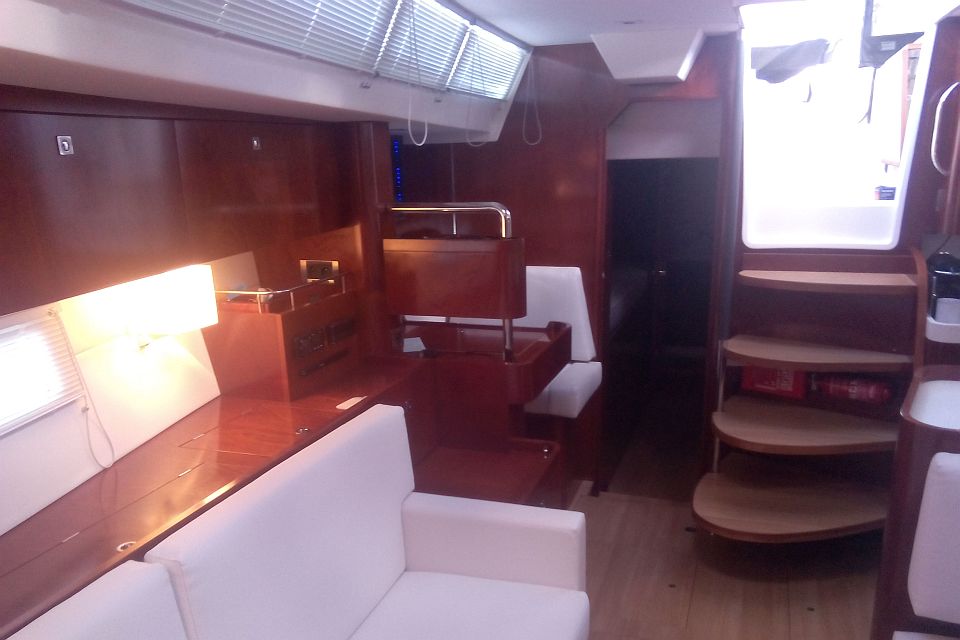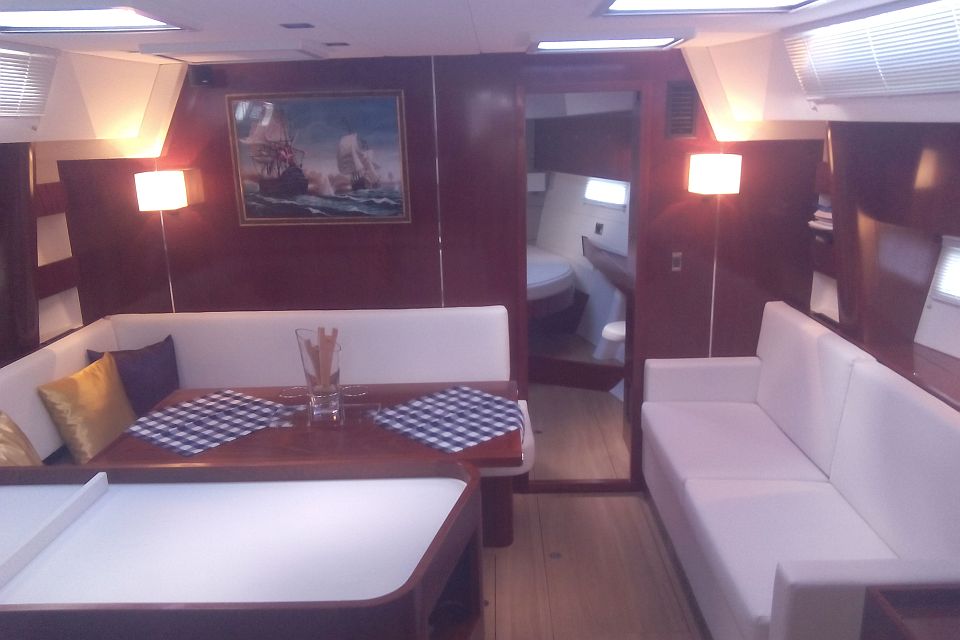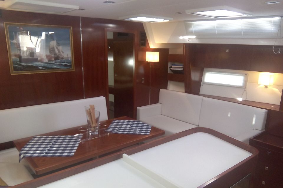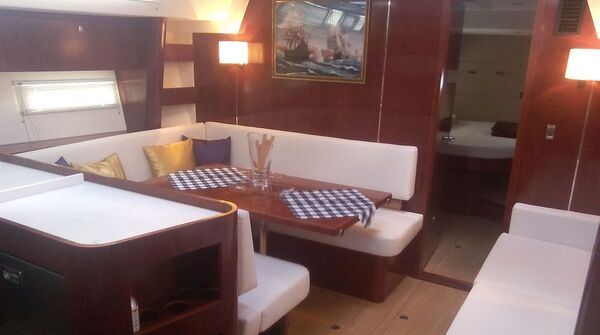 - Großzügiger Salon mit U-förmiger Sitzgruppe an Backbord um den Salontisch