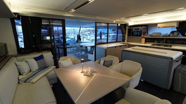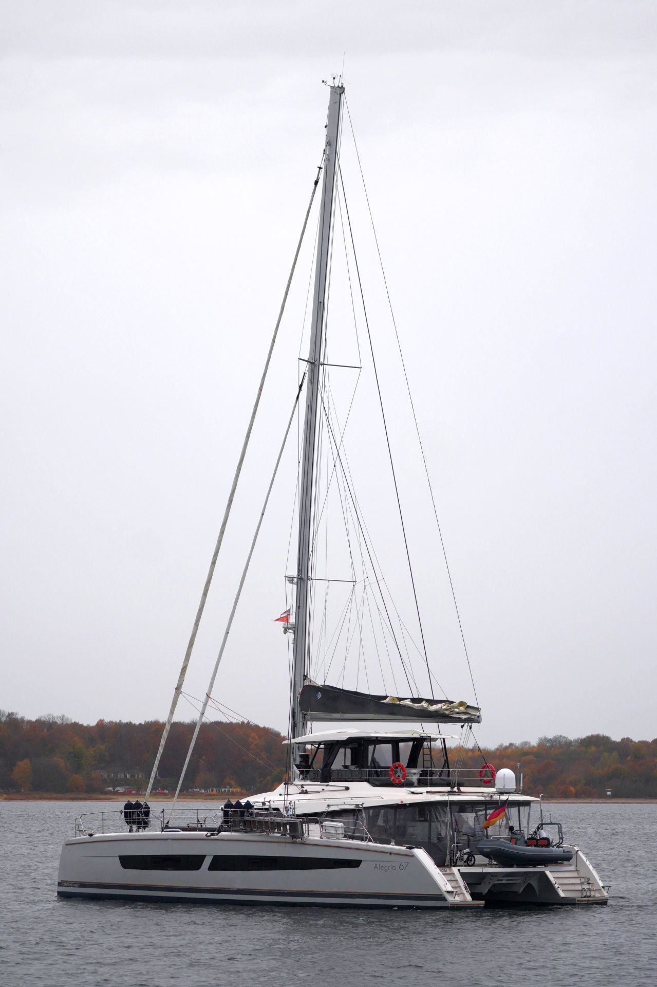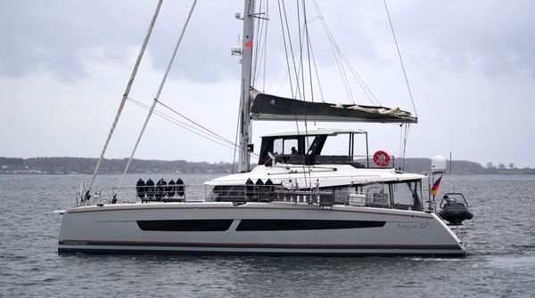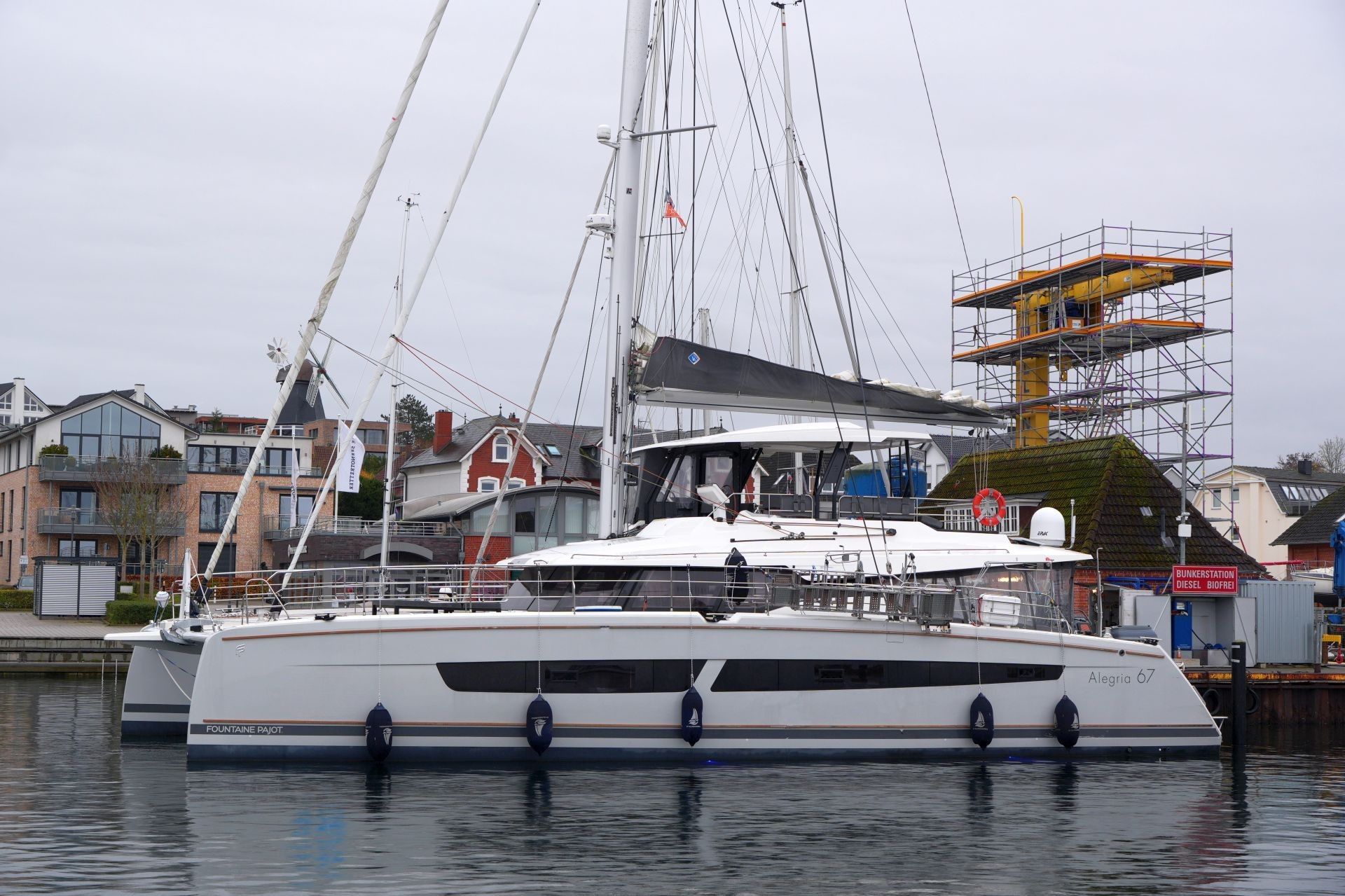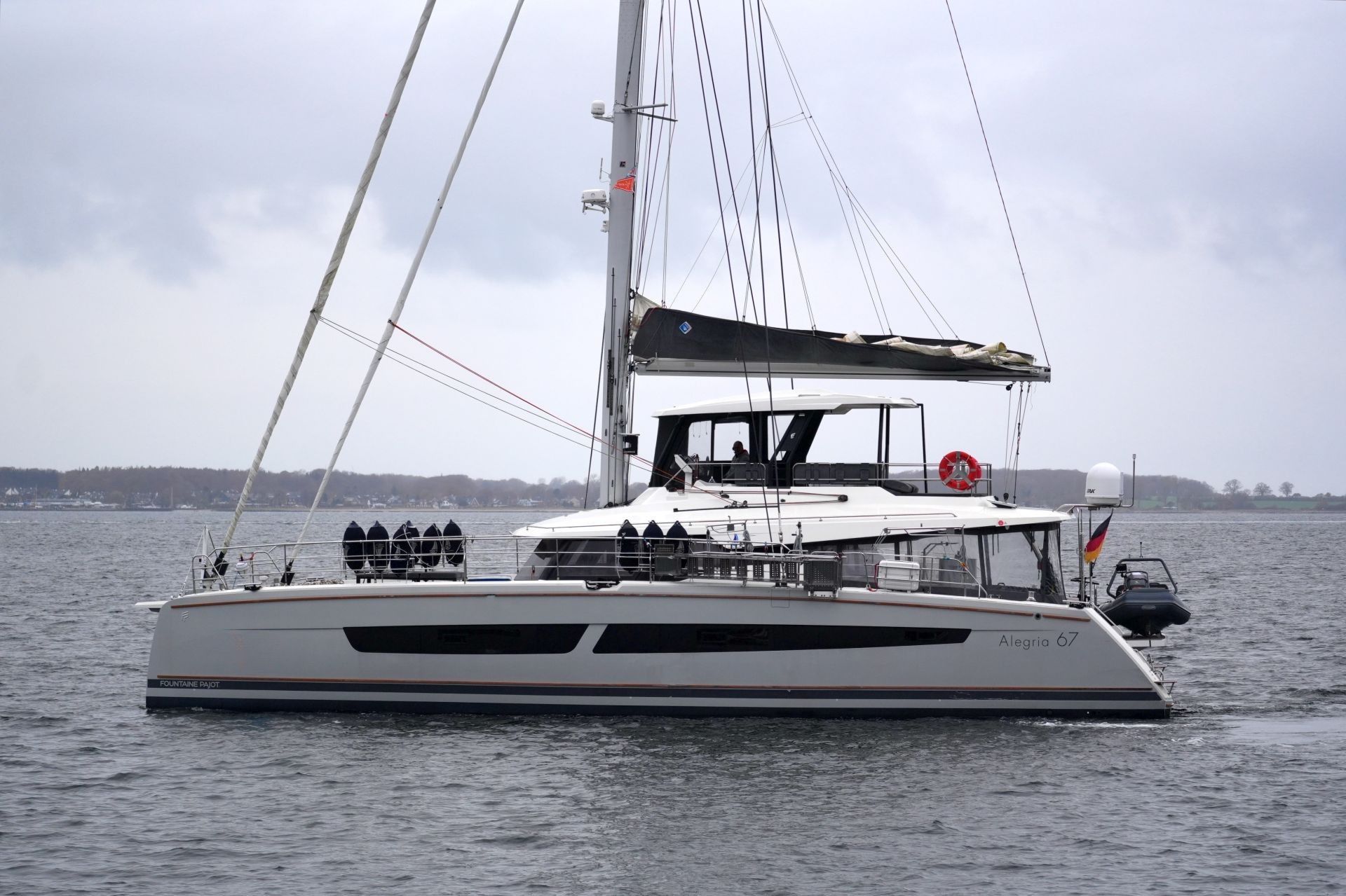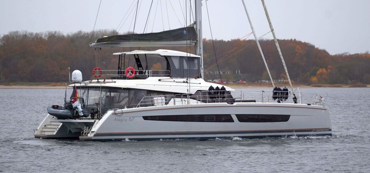 Luxus Cruising-Katamaran aus dem Jahr 2022Das Flaggschiff des Katamaran-Herstellers Fountaine Pajot aus La Rochelle legte bei seiner Vorstellung im Jahre 2018 einen Blitzstart hin: Bei der Weltpremiere auf der International Multihull Boat Show in La Grande-Motte wurde sie zum "Best Multihull of the Year 2019" gekürt und entwickelte sich schnell zum Kassenschlager für die Werft. Ca. 100 Einheiten wurden von dieser großen, luxuriösen Yacht gebaut, bevor das Modell 2024 von der Fontaine Pajot Thira 80 abgelöst wurde. Der französische Konstrukteur Olivier Racoupeau verlieh der Fountaine Pajot Alegria 67 moderne, sportliche Linien mit agressiven Wavepiercer-Bugen, starkem negativem Deckssprung und einer rasant nach achtern ansteigenden Linie des Aufbaudachs. Das ungemein geräumige, komfortable Interieur ließ sich durch verschiedene Layouts auf des Programm ihres Eigentümers anpassen. Viele Yachten gingen in den Charterbetrieb, es gibt aber auch eine luxuriöse Eignerversion mit einer ausgesprochen großen Master-Cabin, die fast den gesamten Raum des Steuerbord-Rumpfes einnimmt.