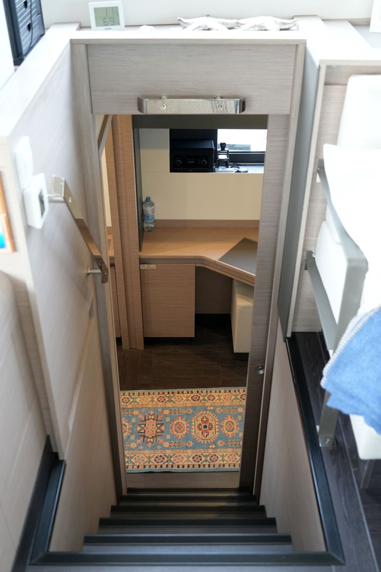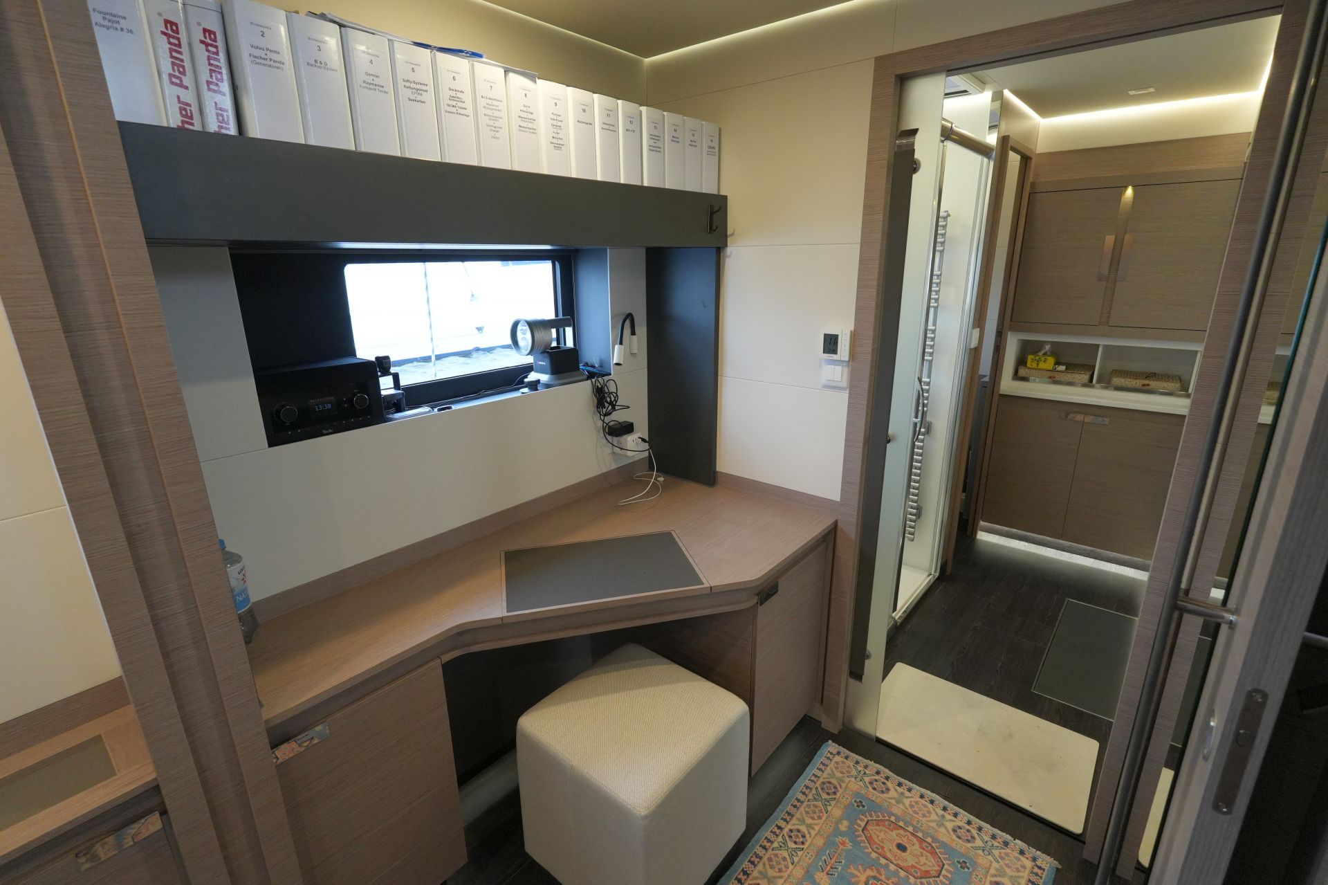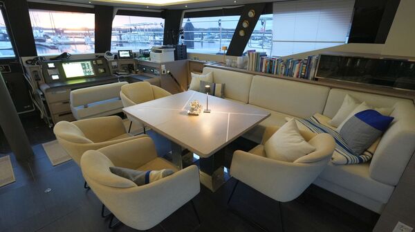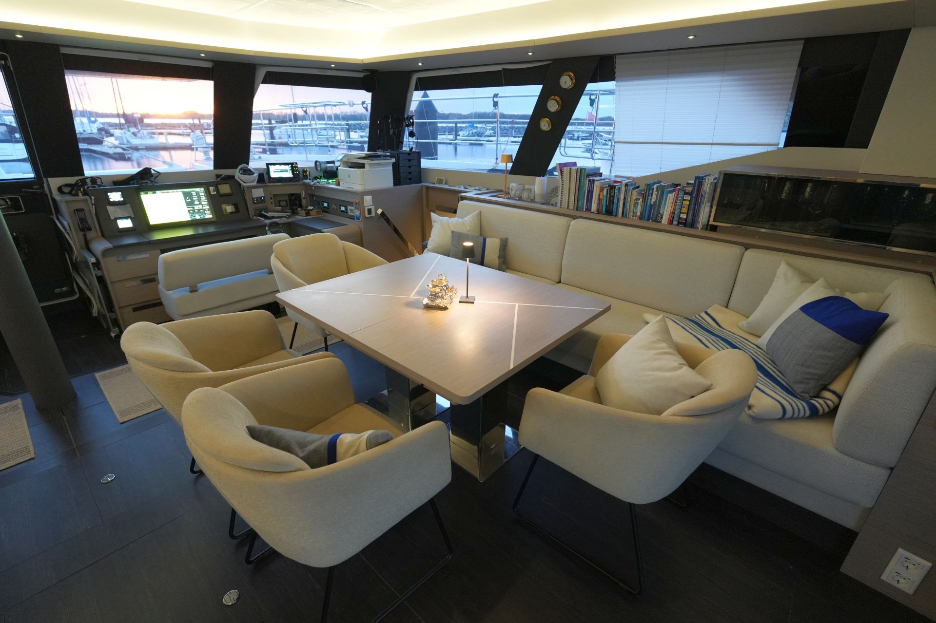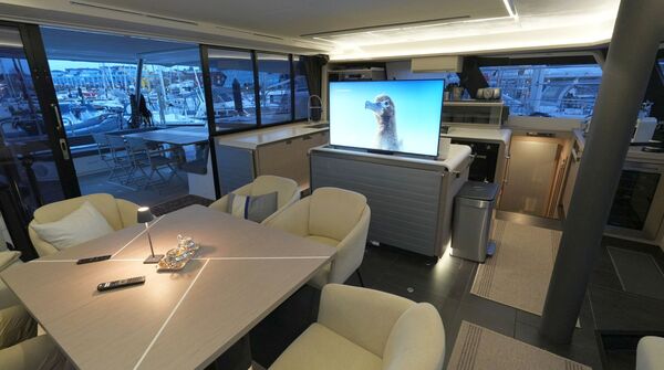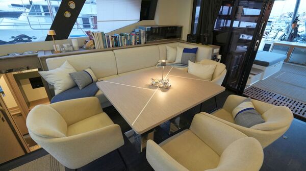 - Großer, klappbarer und elektrisch höhenverstellbarer Cockpittisch mit L-förmiger Sitzgruppe an Backbord