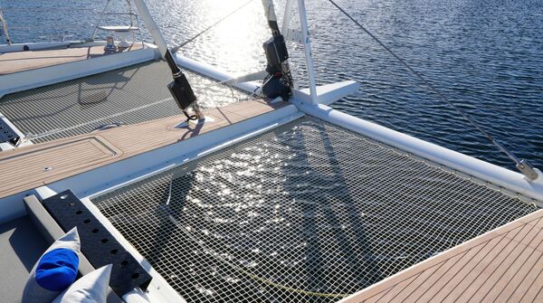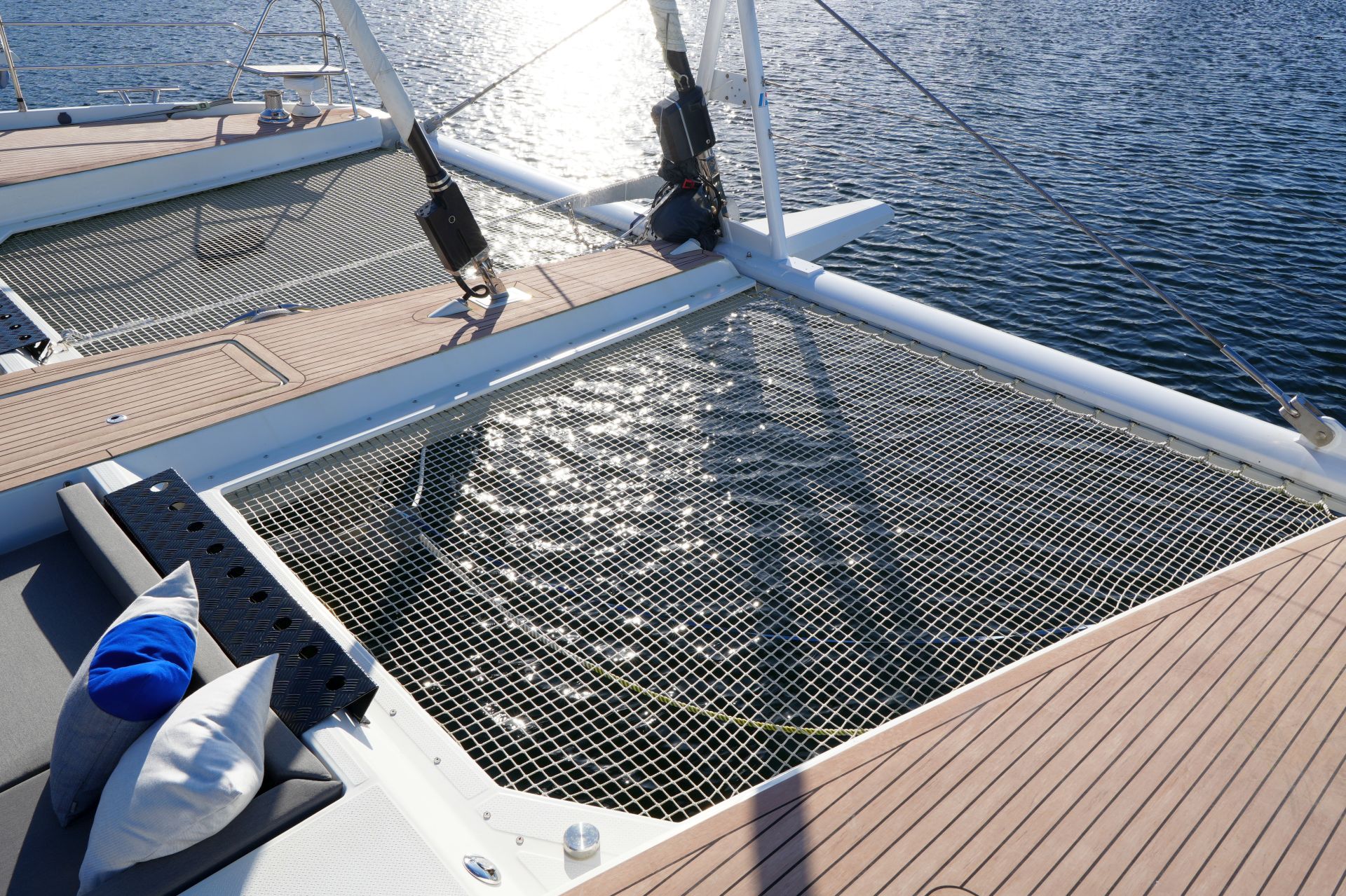 - Komplette Seereling in geschweißtem Edelstahlrohr mit Relingstoren an Steuerbord und Backbord und klappbaren Zugangstüren zu den Hecks