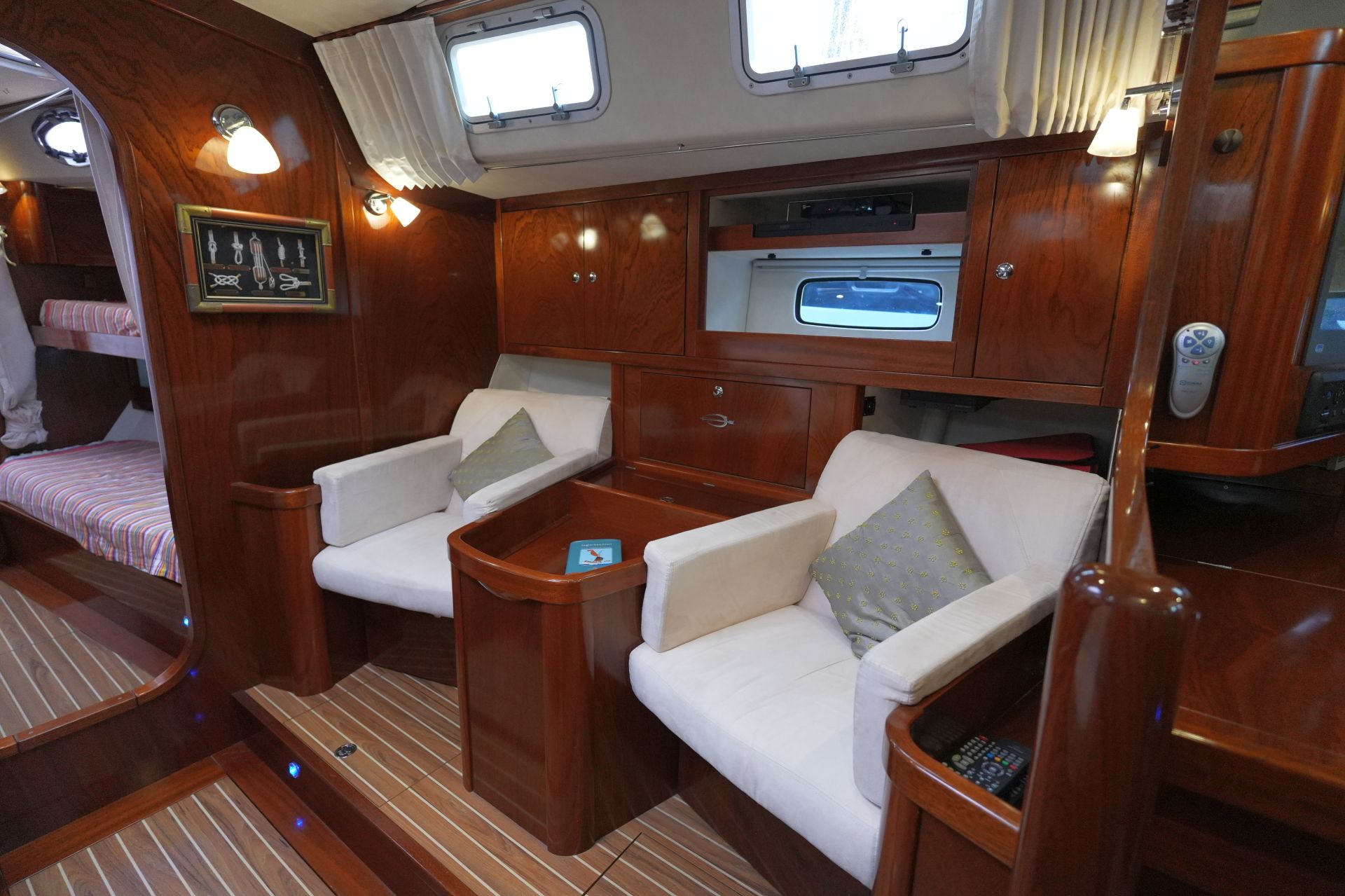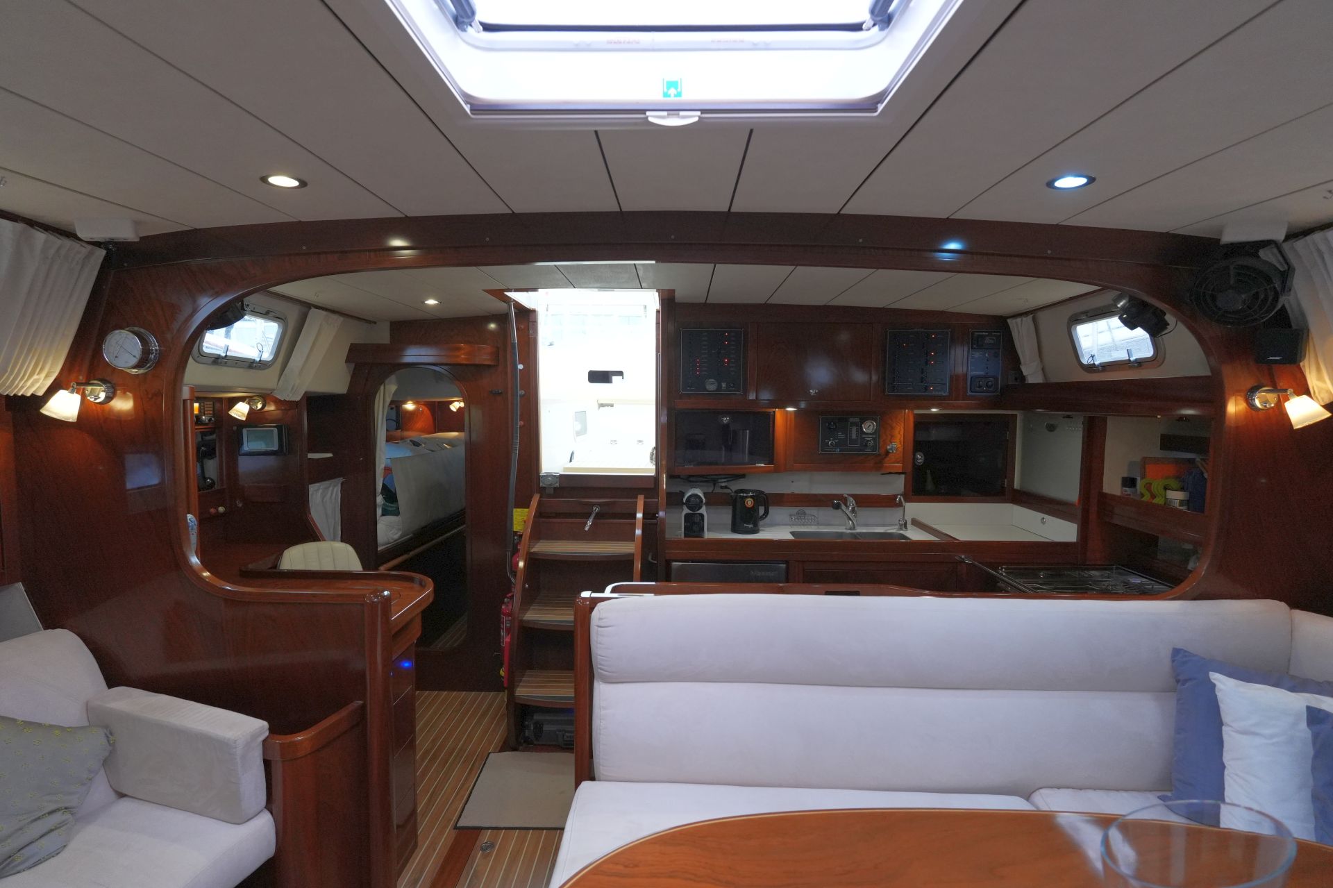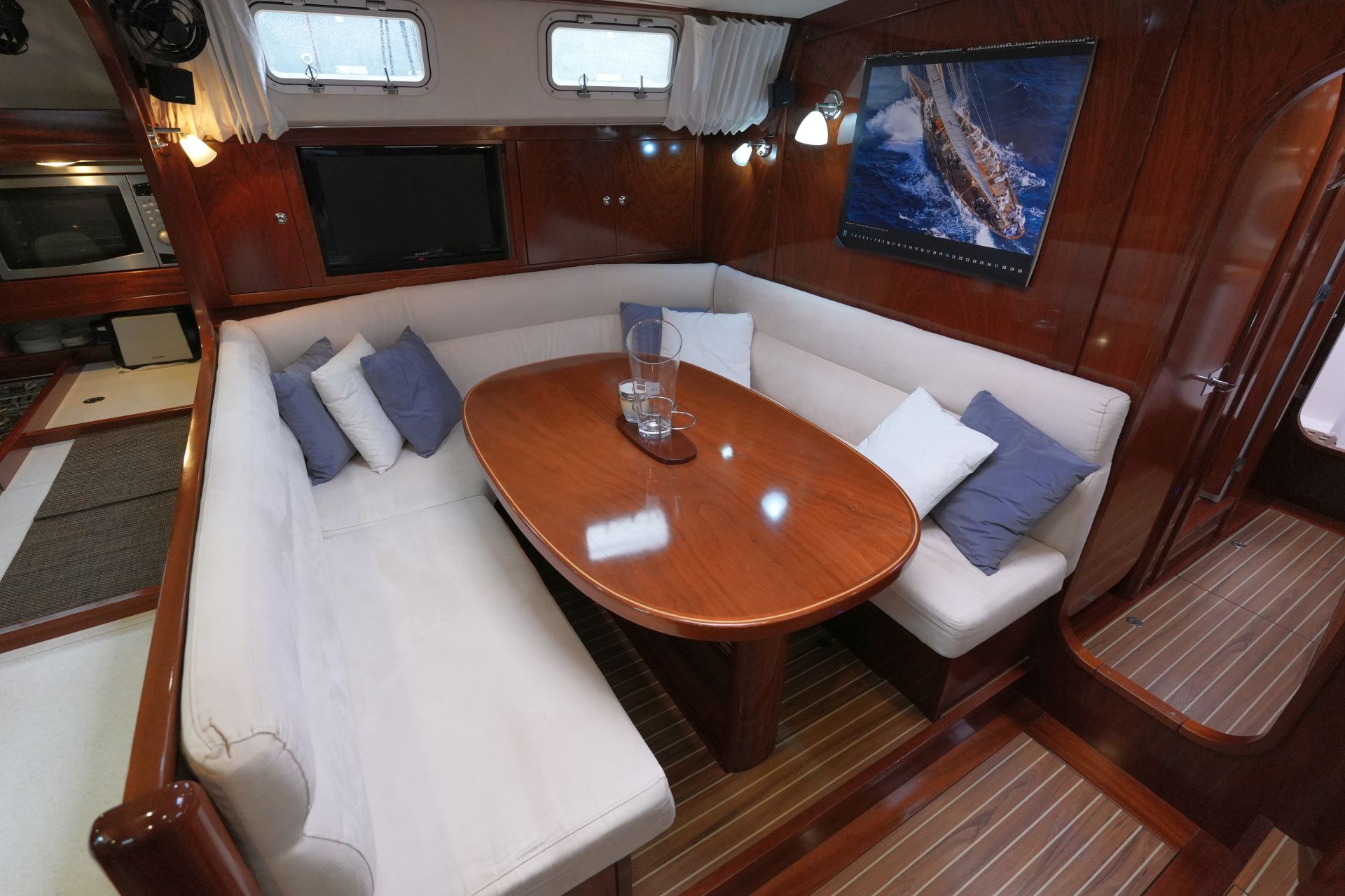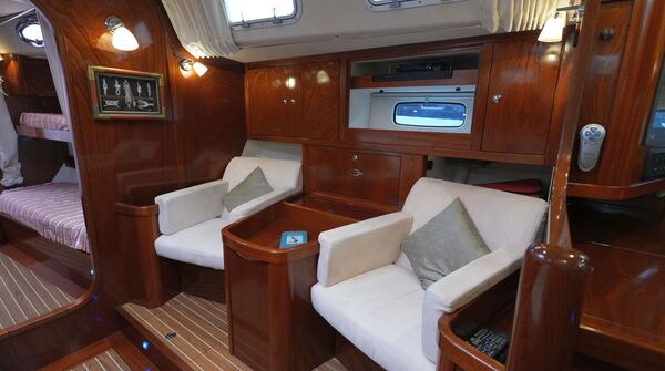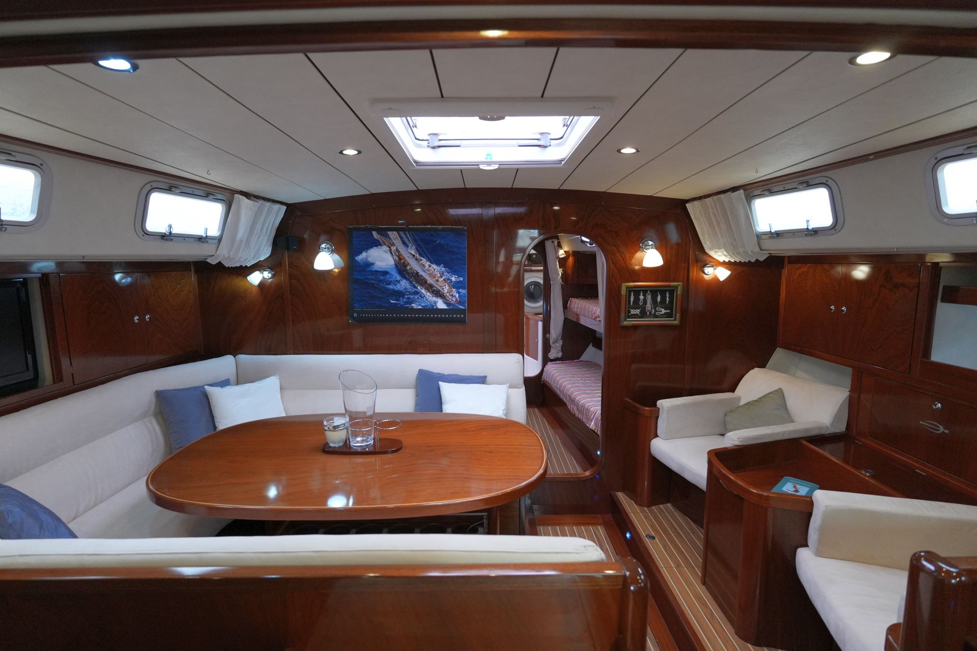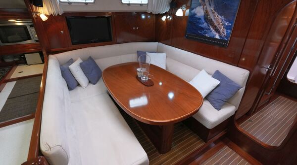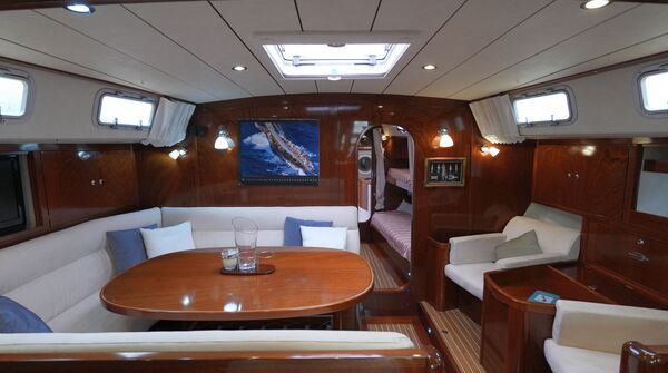 - Salon mit U-förmiger Dinette an Backbord um den Salontisch und zwei Einzelsesseln an Steuerbord