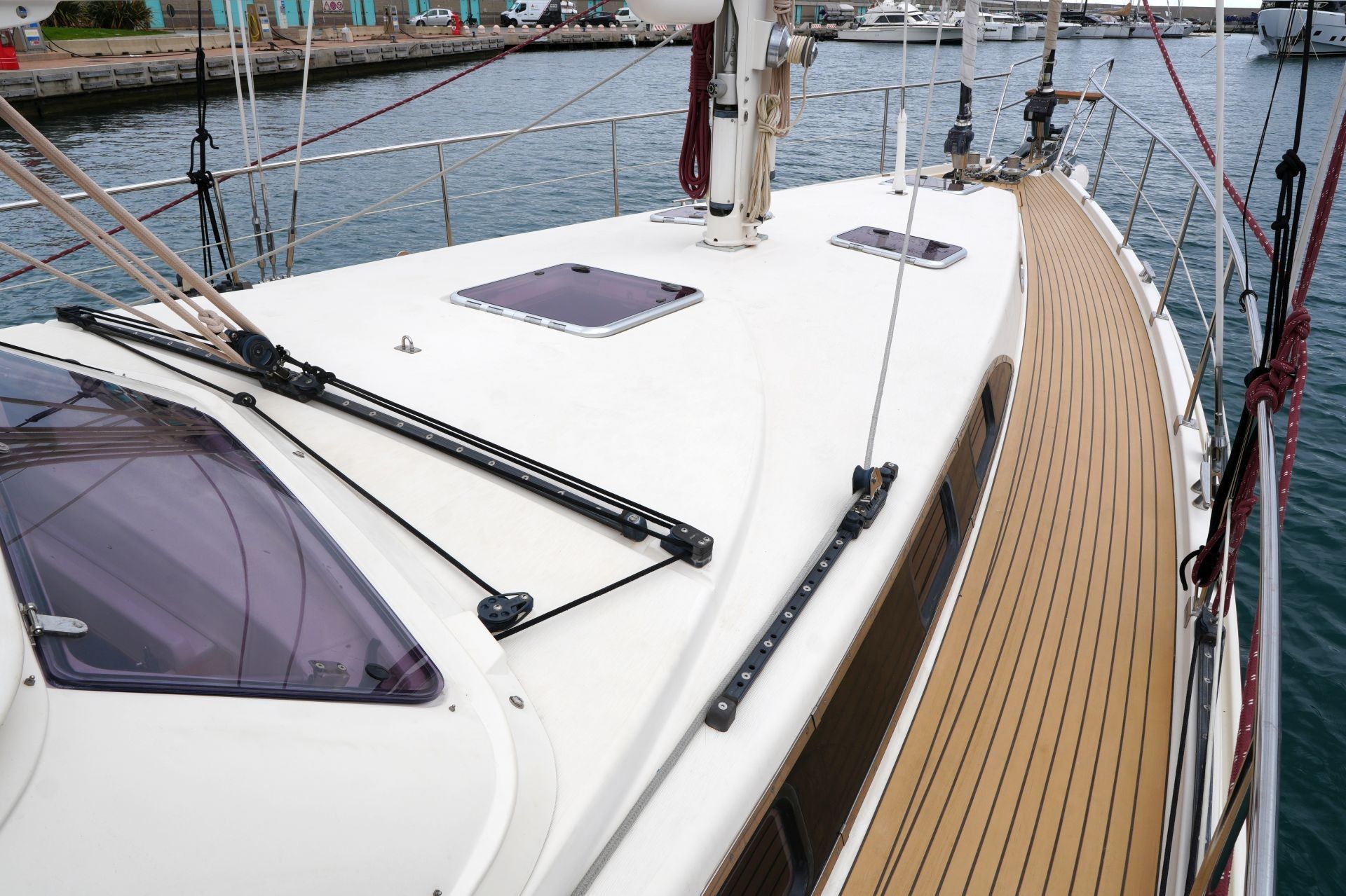- Edelstahl Festmacherklampen vorn und achtern und zusätzlicher zentraler Belegpoller am Bug