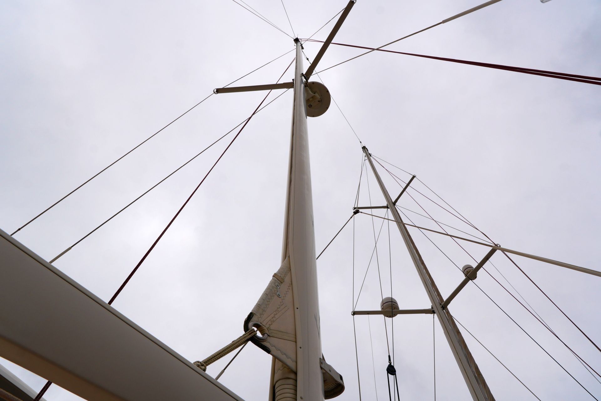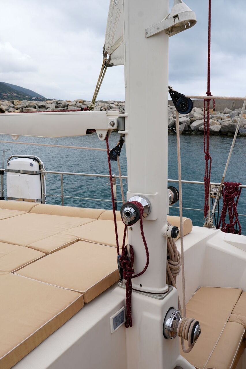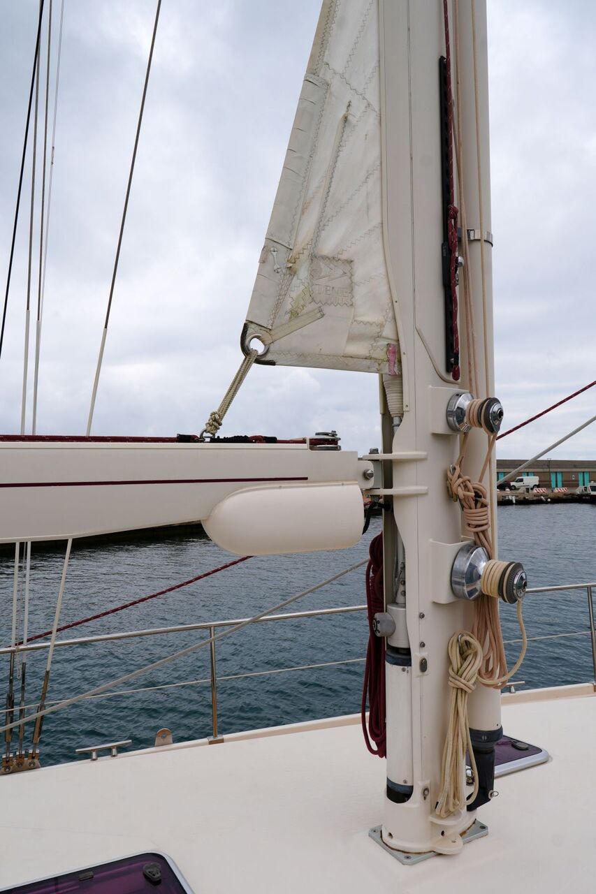 - An Deck stehender, topgetakelter, weiß lackierter AMEL Besanmast mit manueller Rollanlage und einem gepfeilten Salingspaar