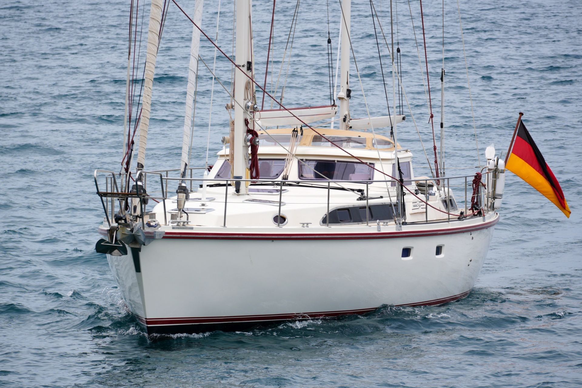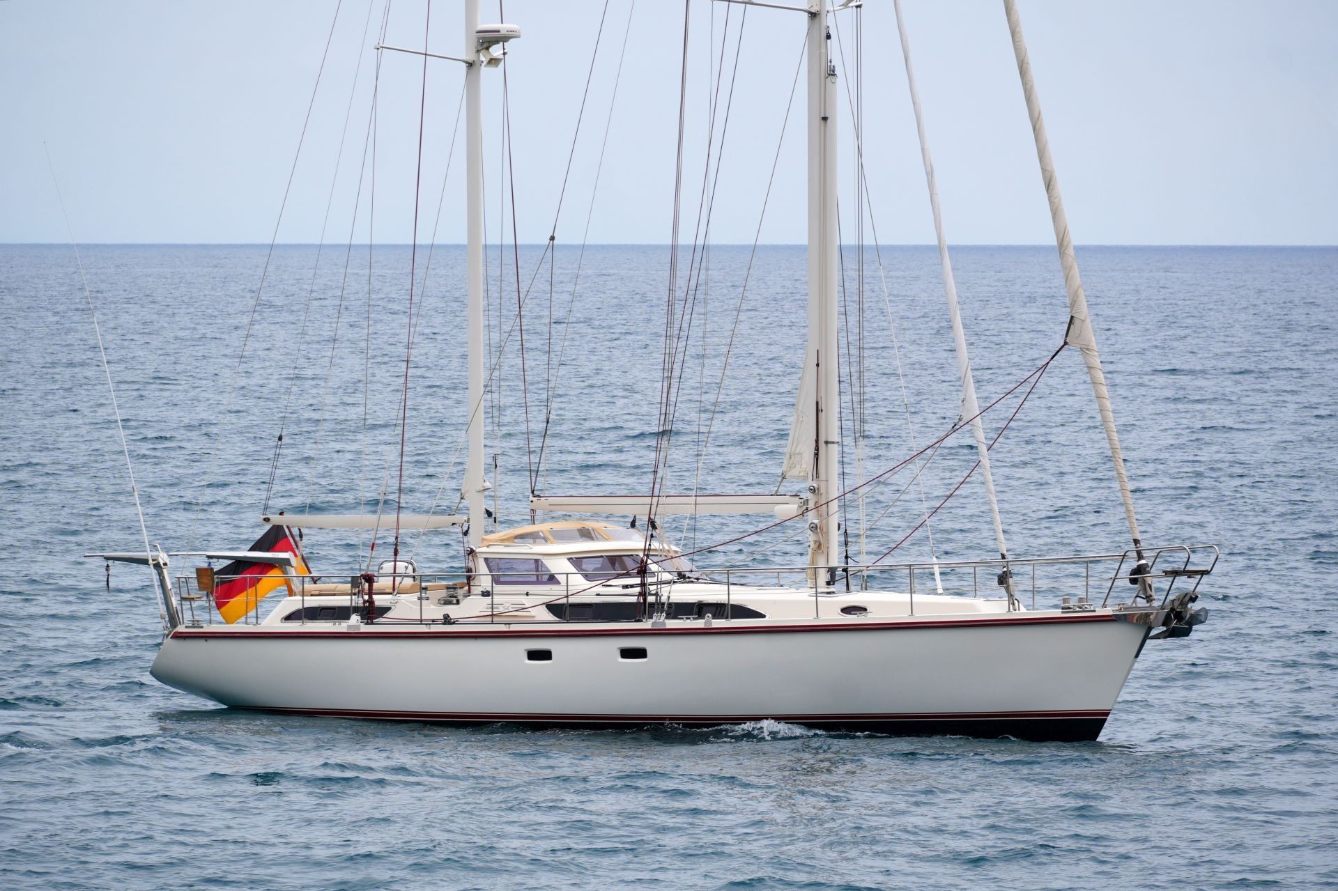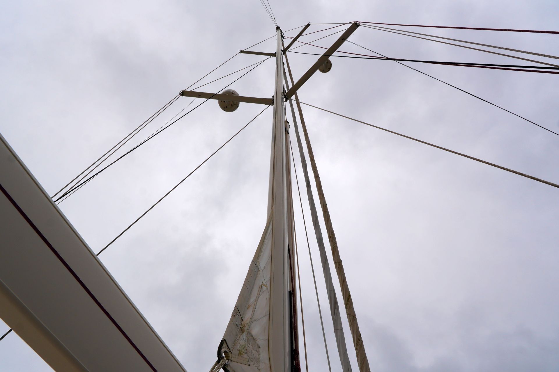 - An Deck stehender, topgetakelter, weiß lackierter AMEL Besanmast mit manueller Rollanlage und einem gepfeilten Salingspaar