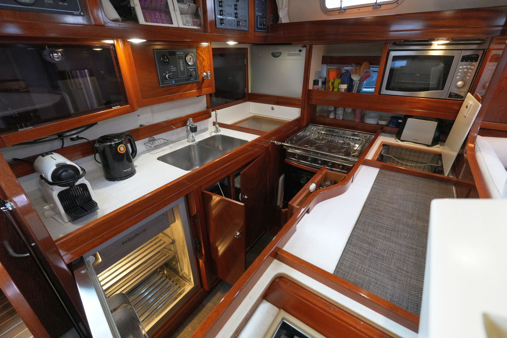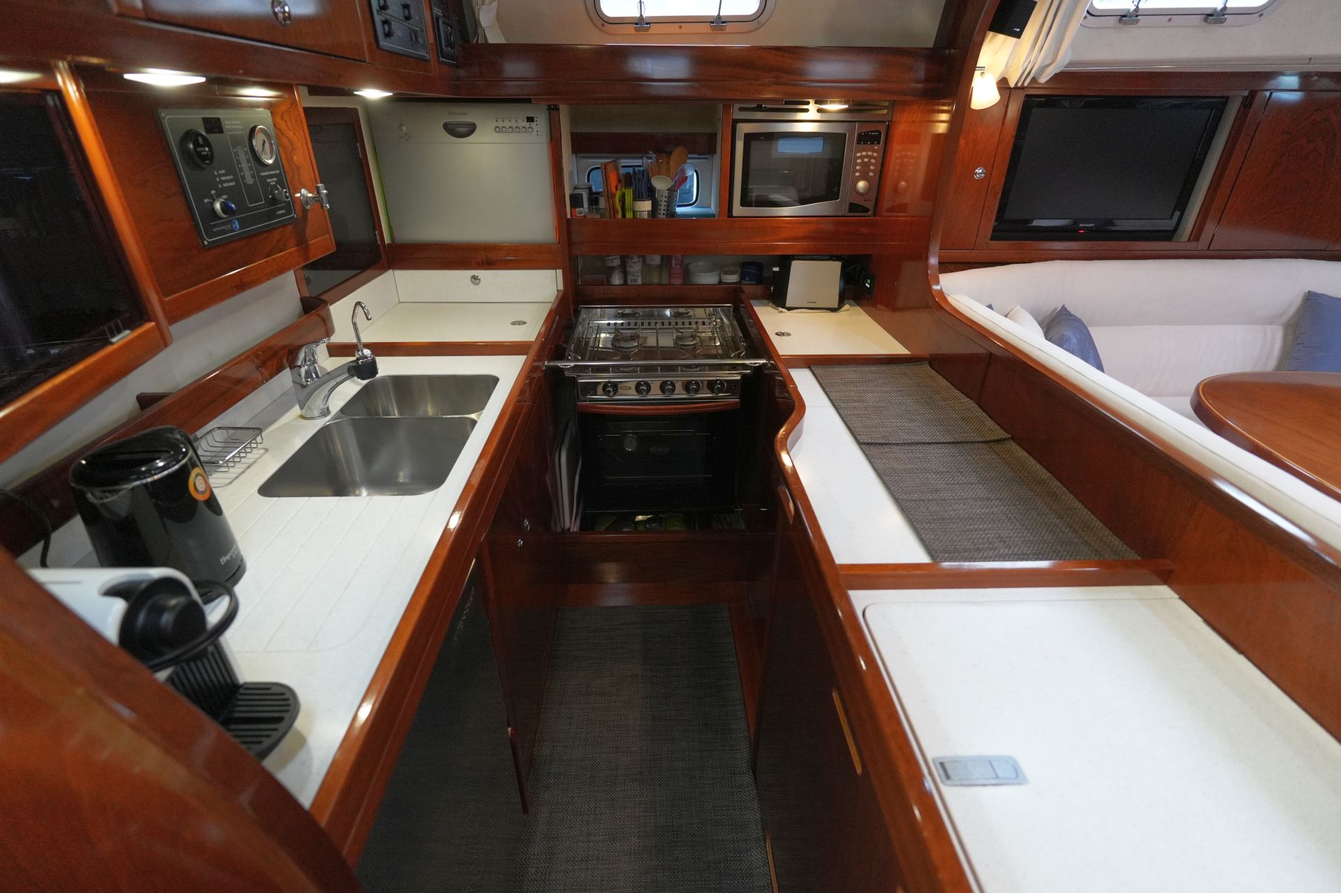 - Solider, aufwendig ausgeführter Ausbau in hochglanzlackiertem Mahagoni mit viel Vollholz in Rahmen und Leisten sowie zahlreichen formverleimten Profilen