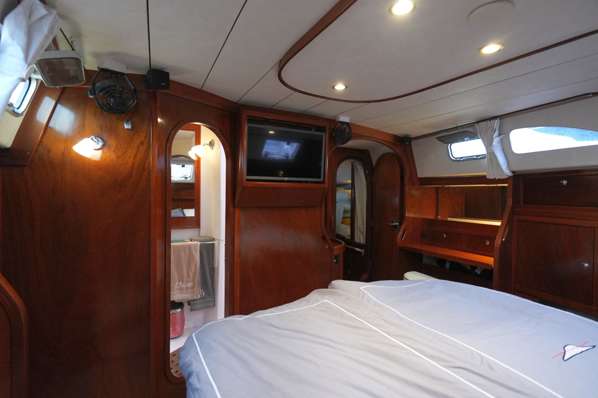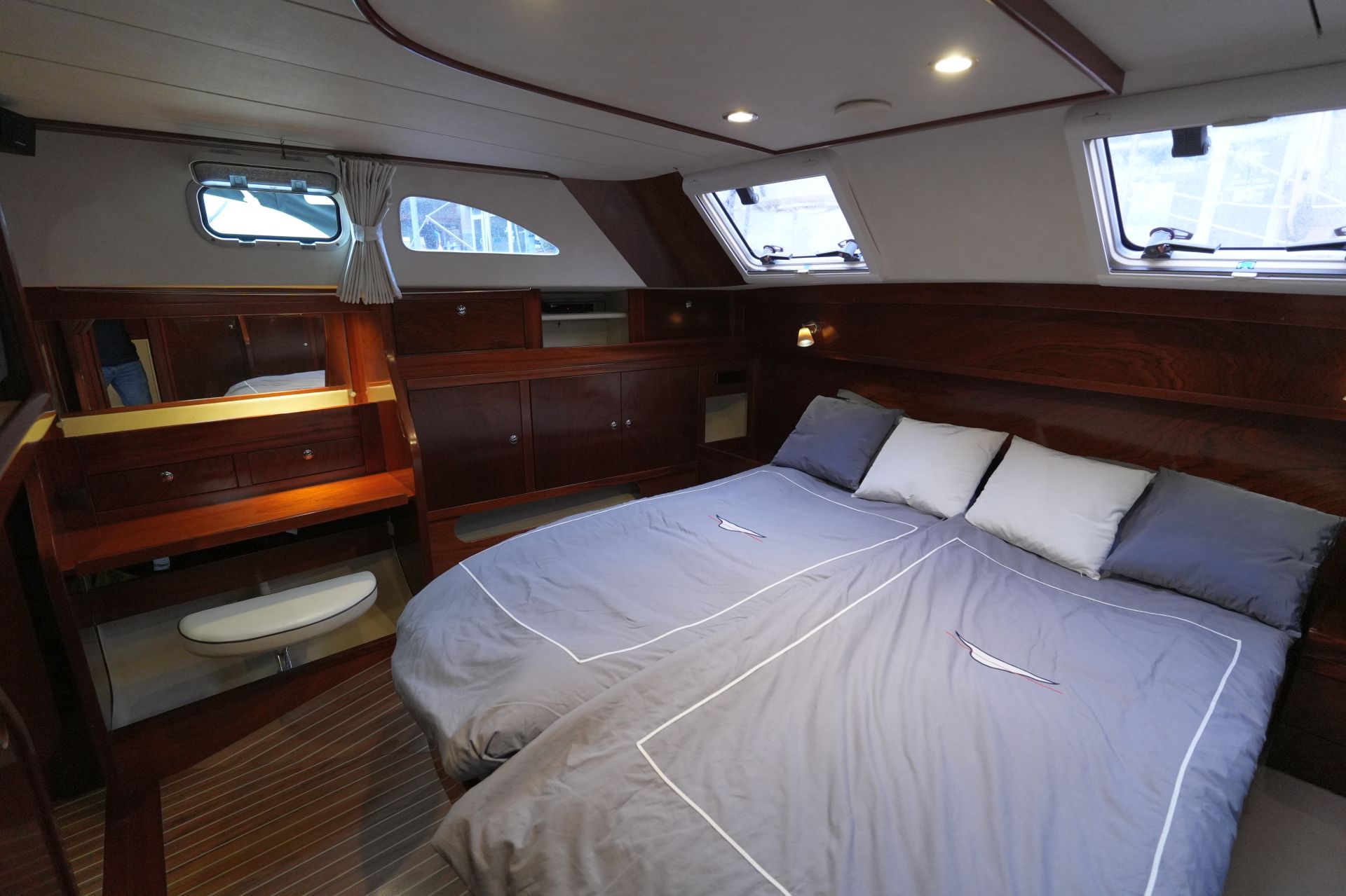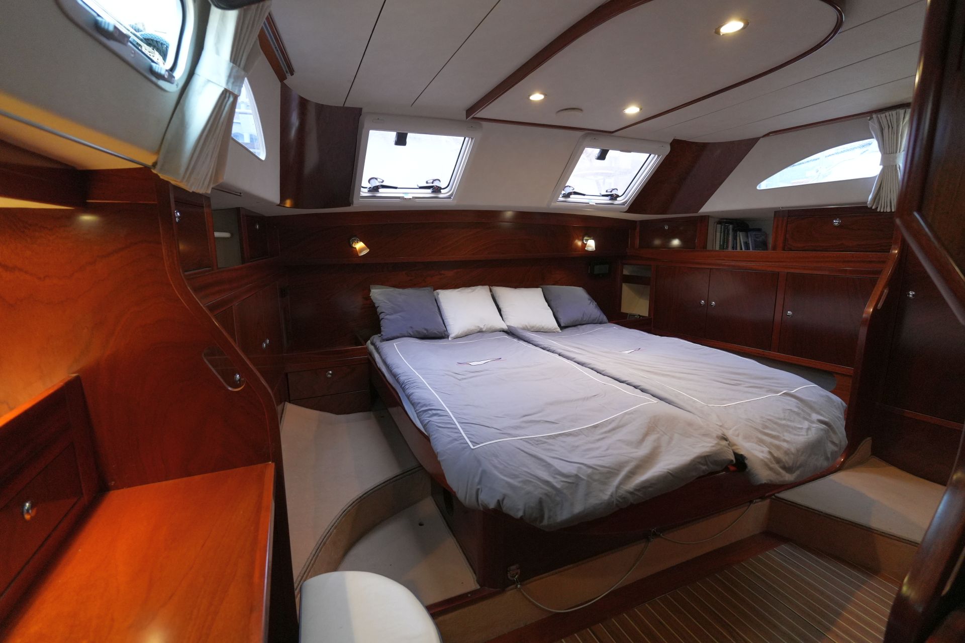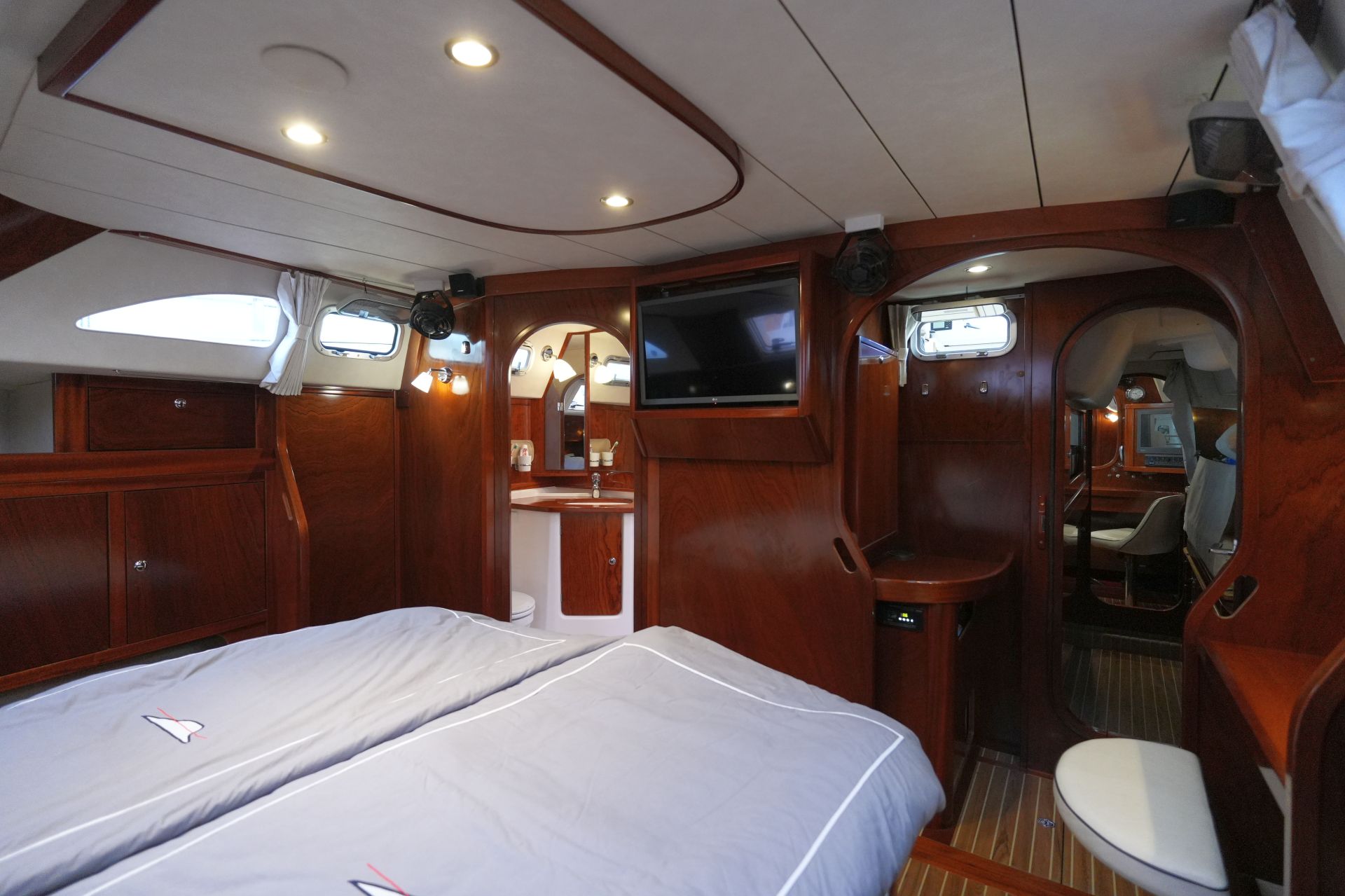 - Geschirrspülmaschine - Geräumige, luxuriöse Eignerkabine achtern über die gesamte Schiffsbreite mit großer, freistehender Doppelkoje, Schreibtisch, Schränken, Regalen und Staufächern