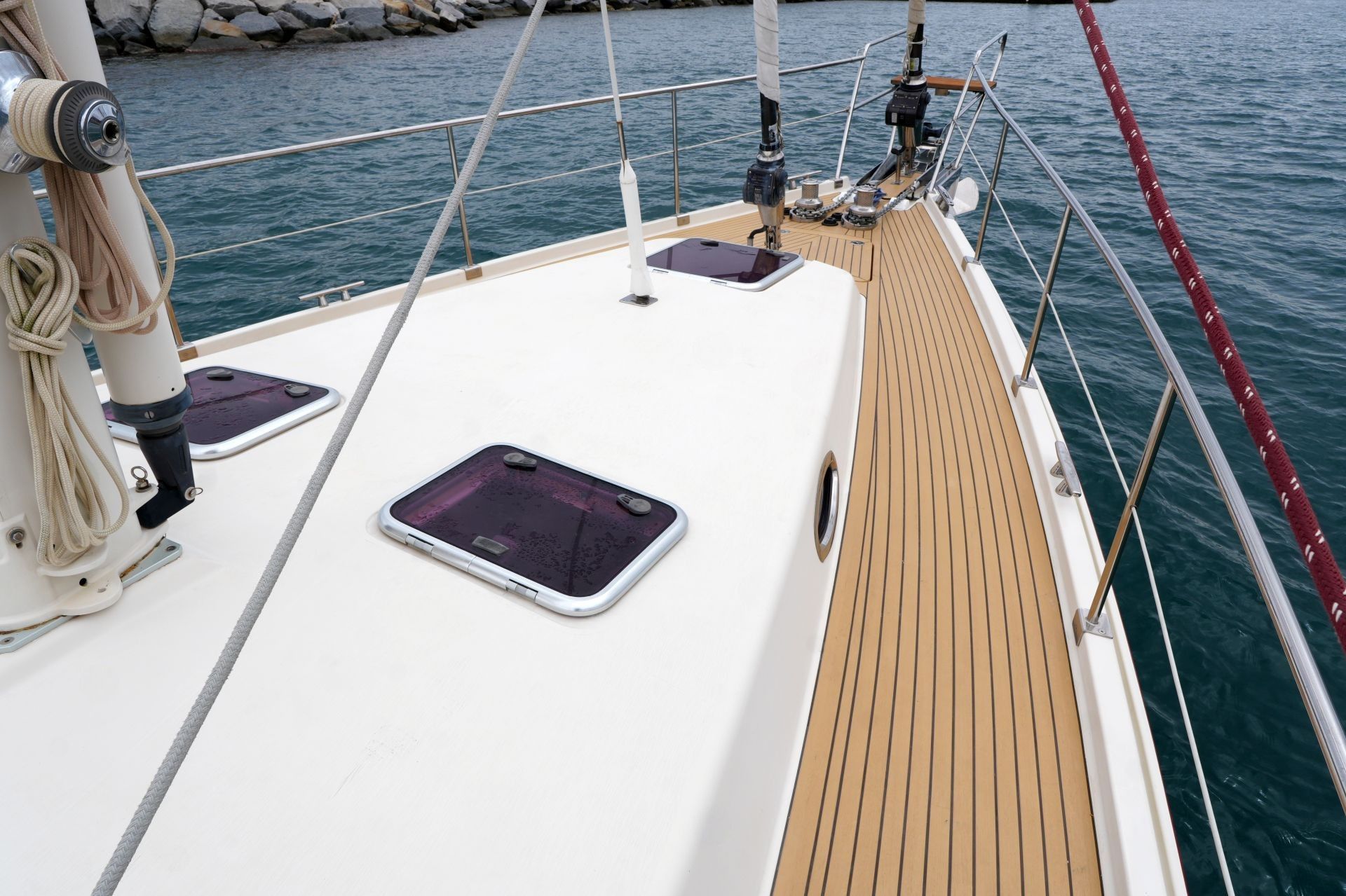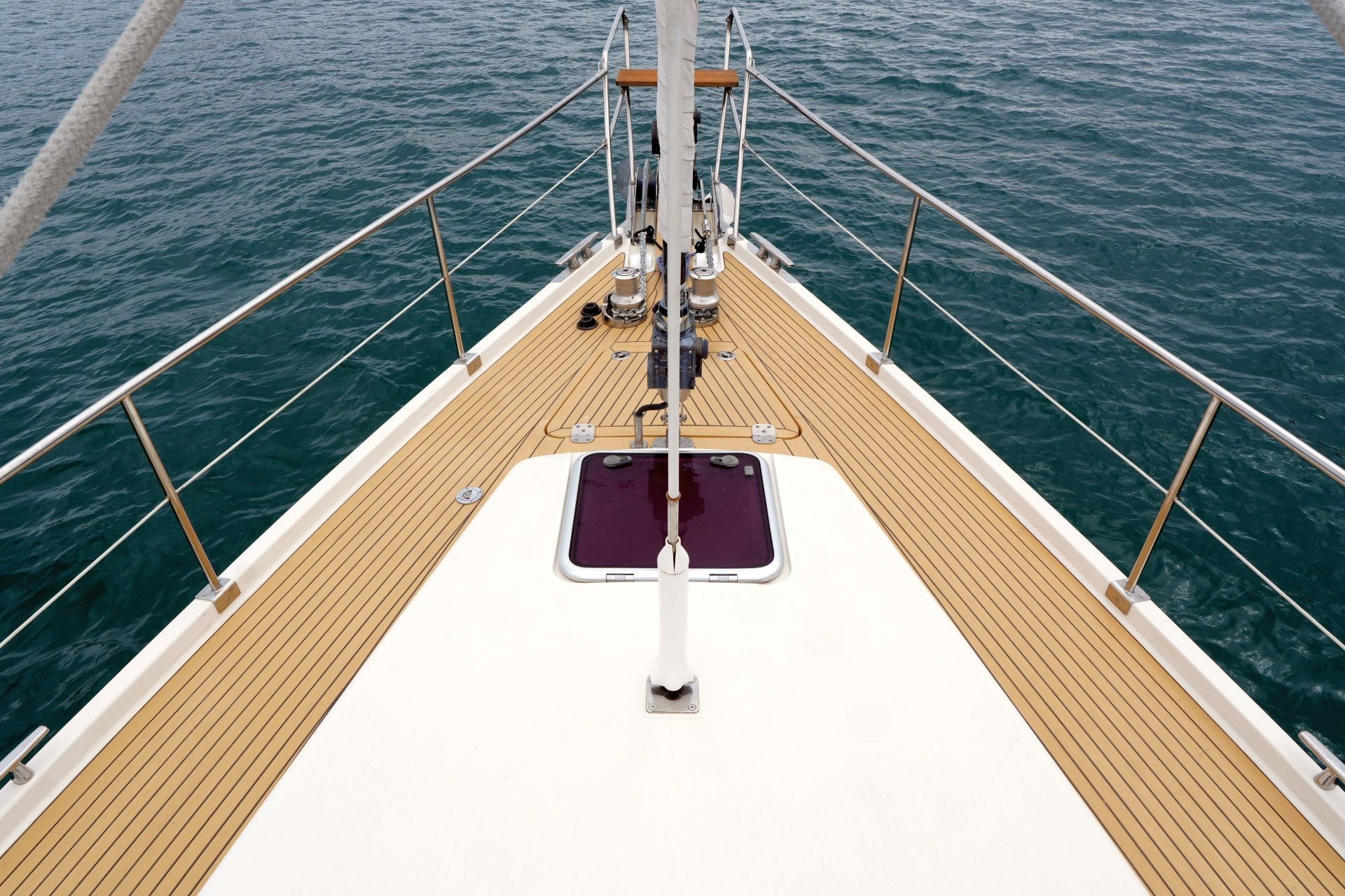 - Massiver Edelstahl Bugbeschlag mit Rollen für zwei Anker und zusätzlicher Rolle für Mooring-Leine