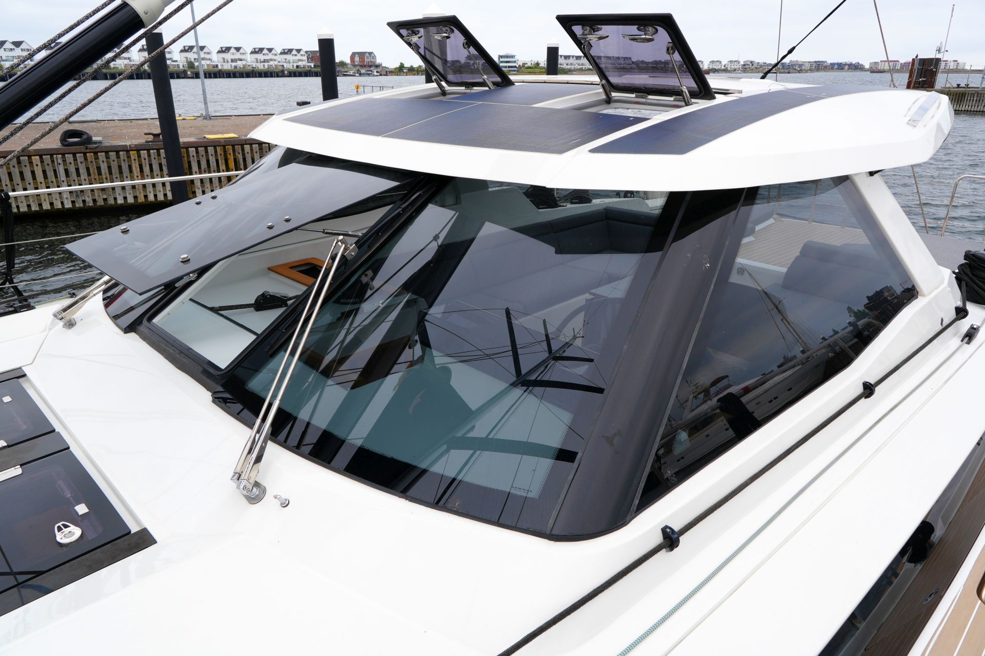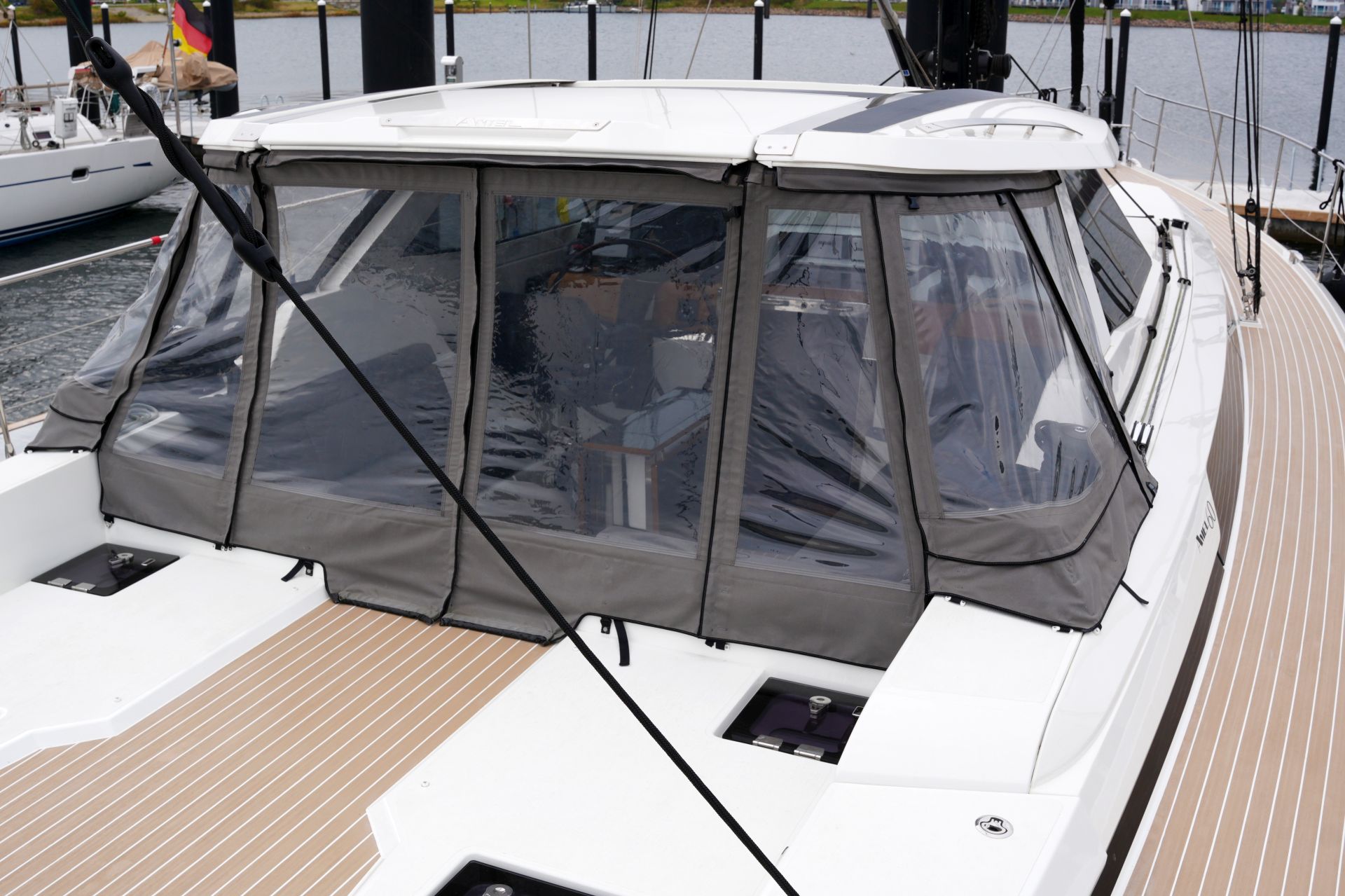 - Doghouse mit Windschutzscheibe (zentrale Scheibe zum Öffnen), zwei Scheibenwischern, zwei Luken im Dach, Deckenbeleuchtung und achtern ausziehbarem GFK-Bimini