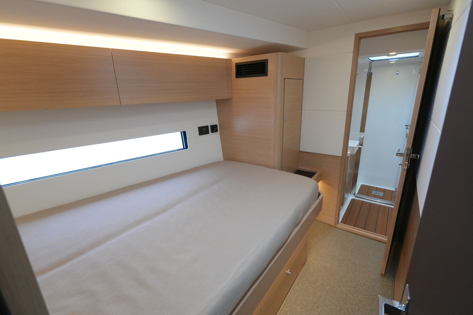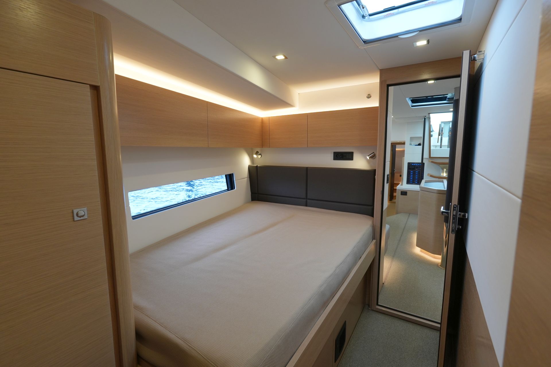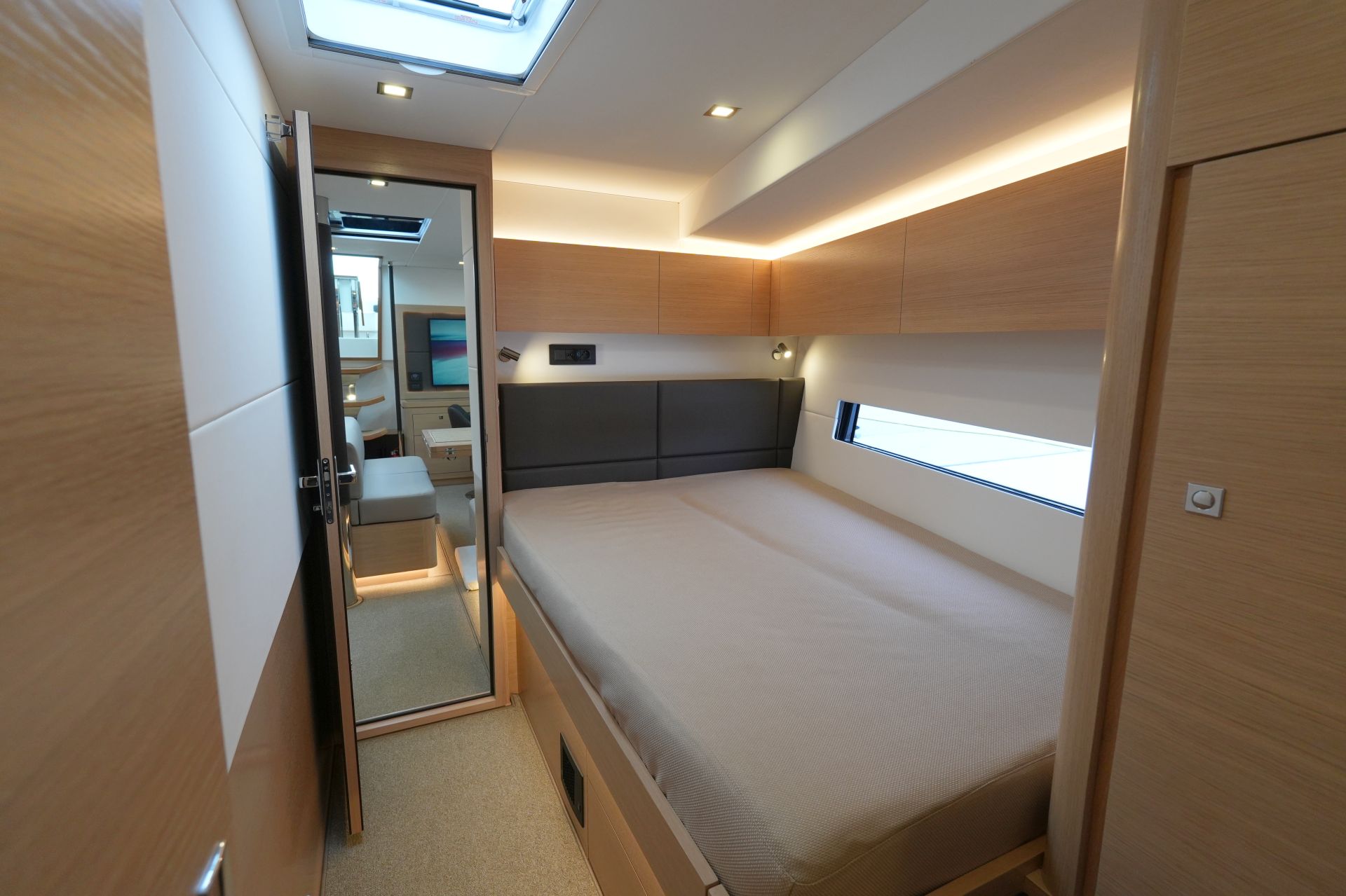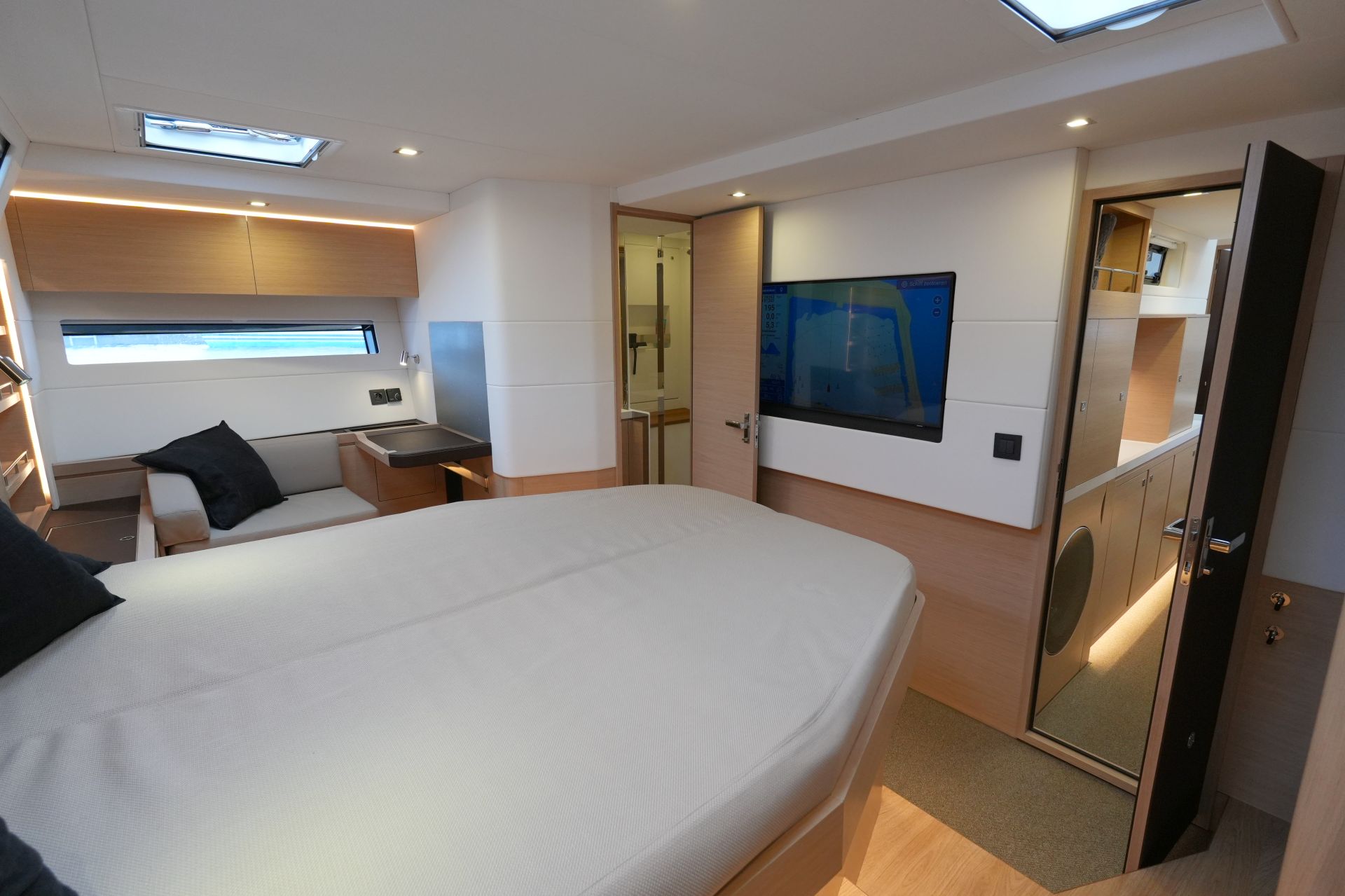 - Elektrischer Induktionsherd Miele (4 Flammen und Backofen) - Luxuriöse, geräumige Eignerkabine im Heck mit breiter, frei stehender Doppelkoje, Sessel und Schminktisch, Safe, reichlich Stauraum in Schränken, Fächern, Regalen und unter der Koje, die mit Gasdruckfedern hochgeklappt werden kann.