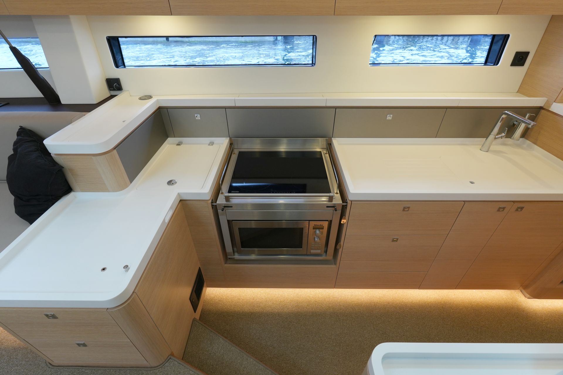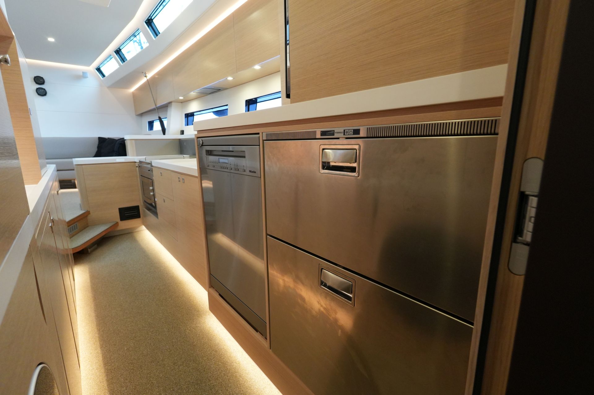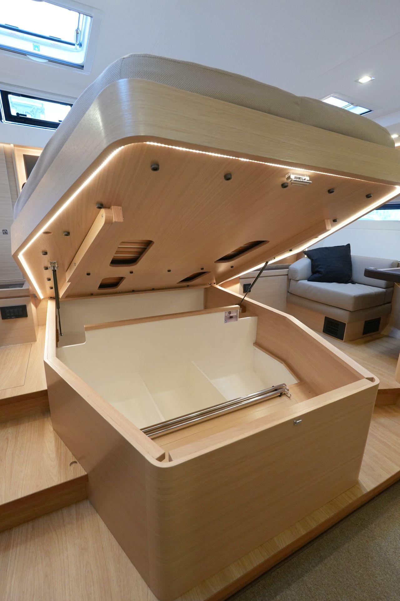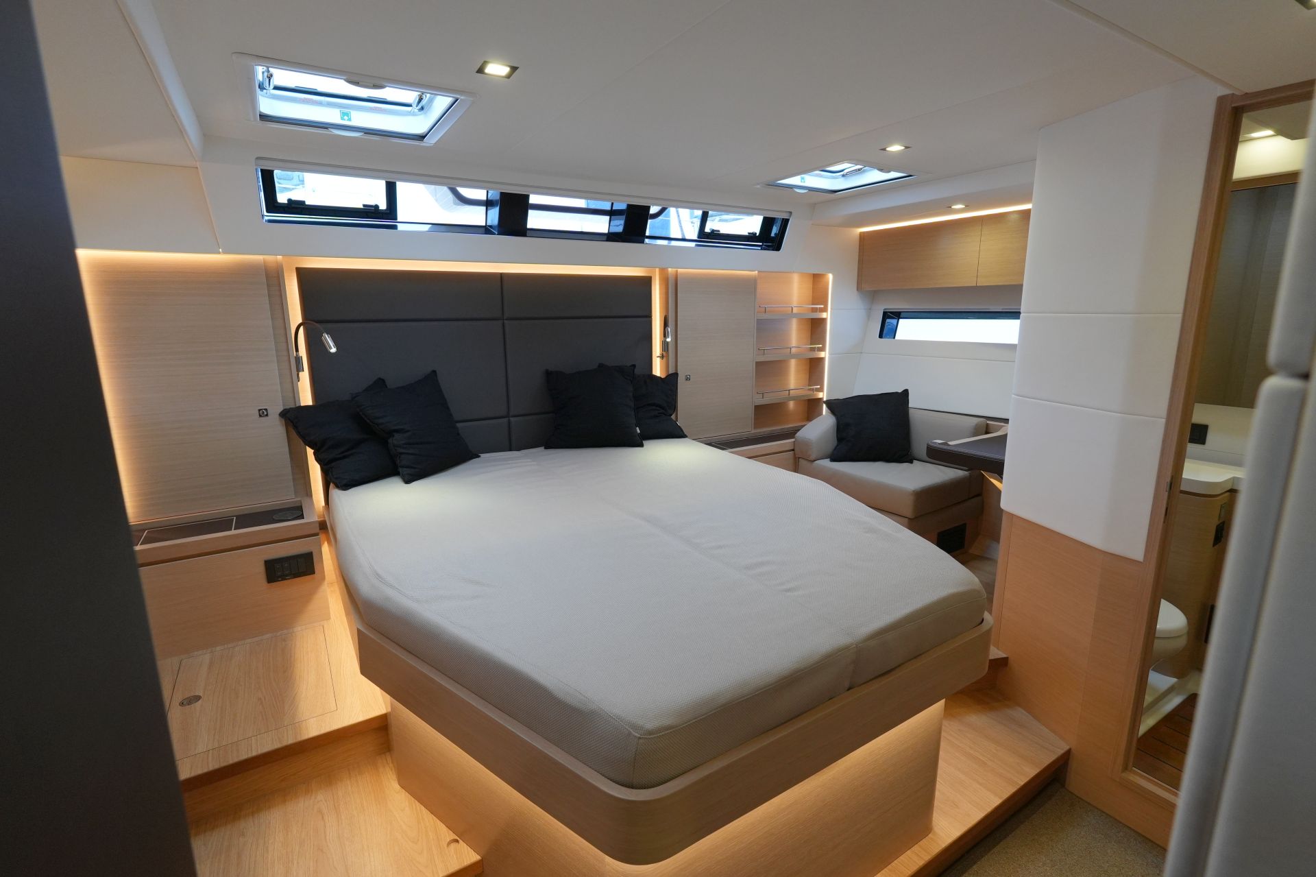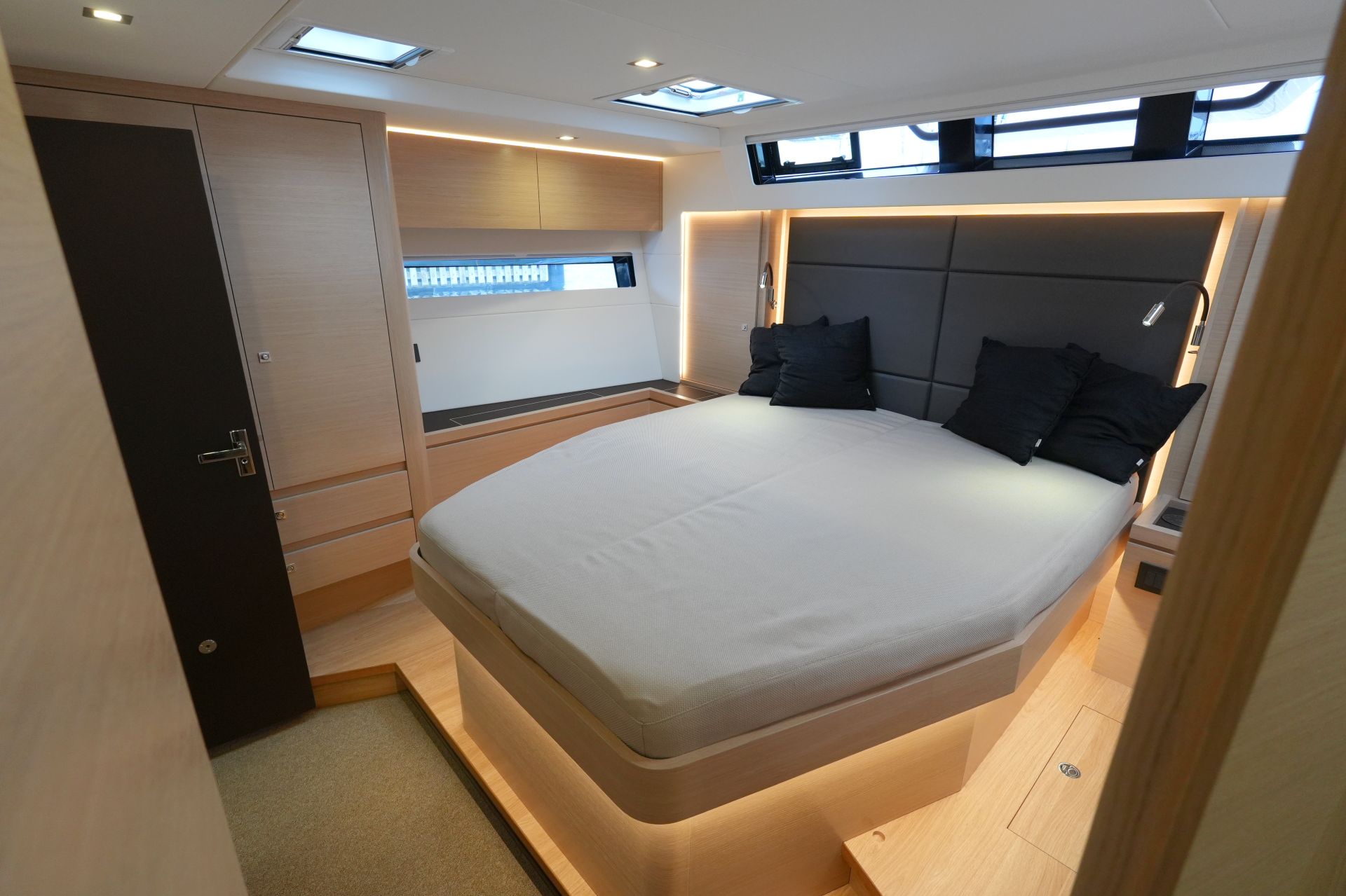- Elektrischer Induktionsherd Miele (4 Flammen und Backofen) - Luxuriöse, geräumige Eignerkabine im Heck mit breiter, frei stehender Doppelkoje, Sessel und Schminktisch, Safe, reichlich Stauraum in Schränken, Fächern, Regalen und unter der Koje, die mit Gasdruckfedern hochgeklappt werden kann.