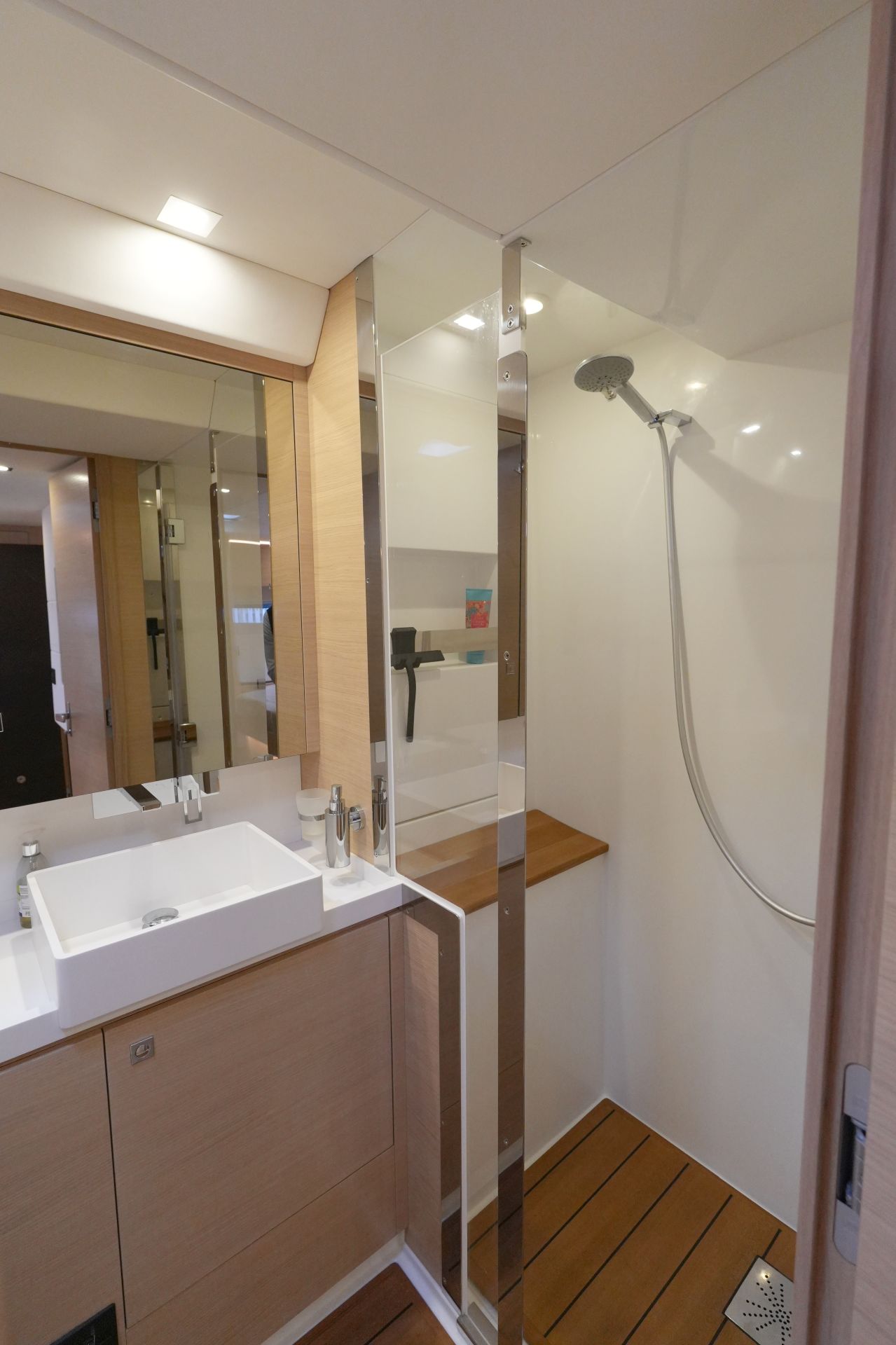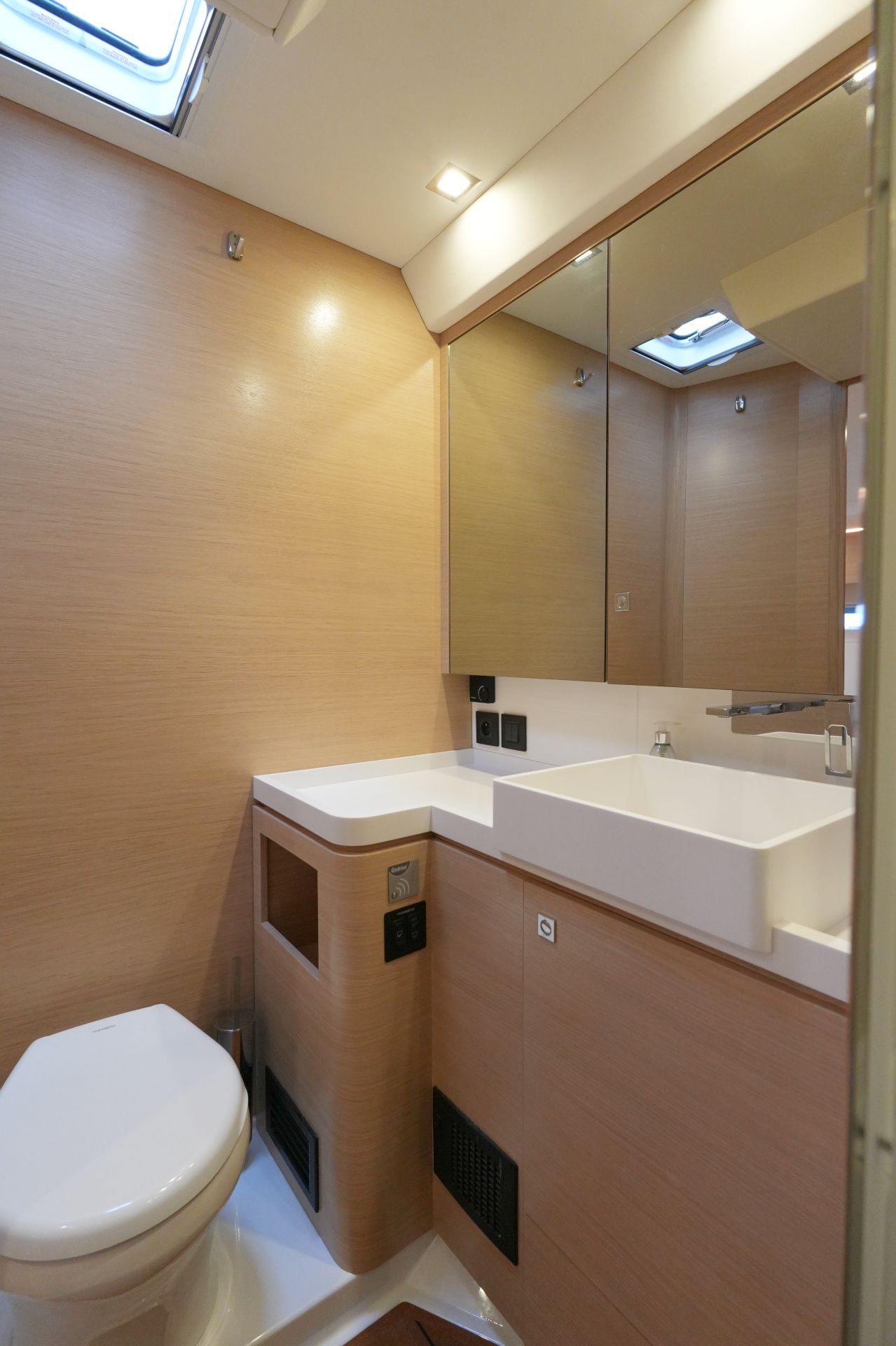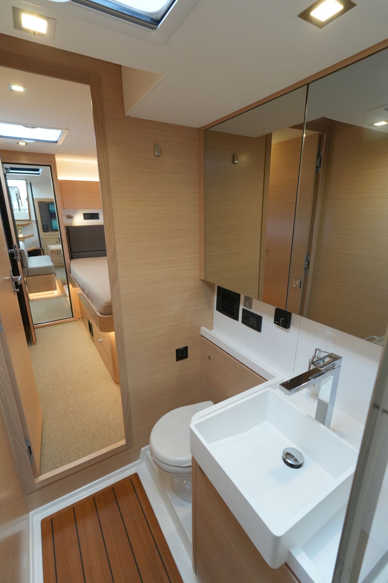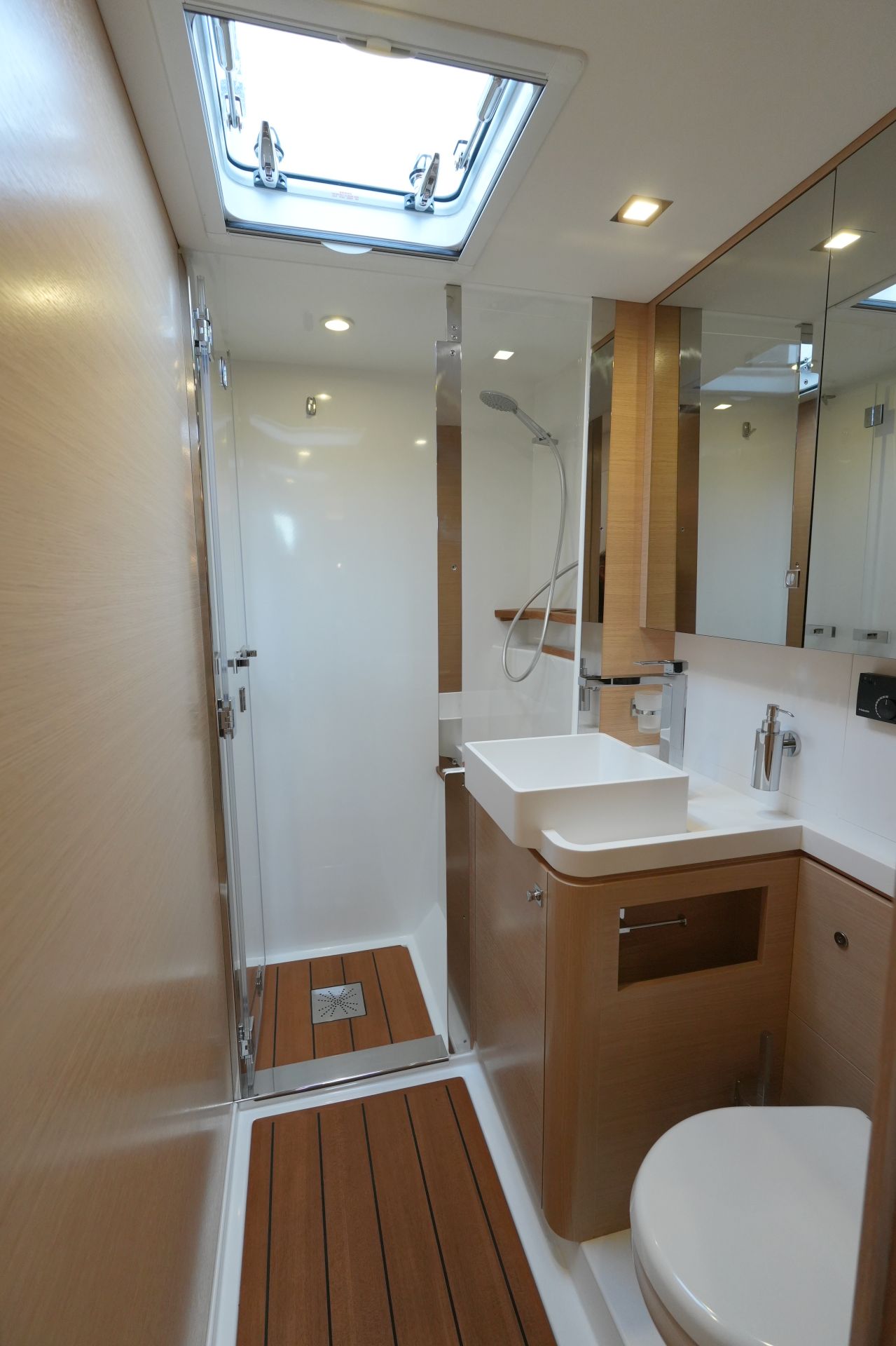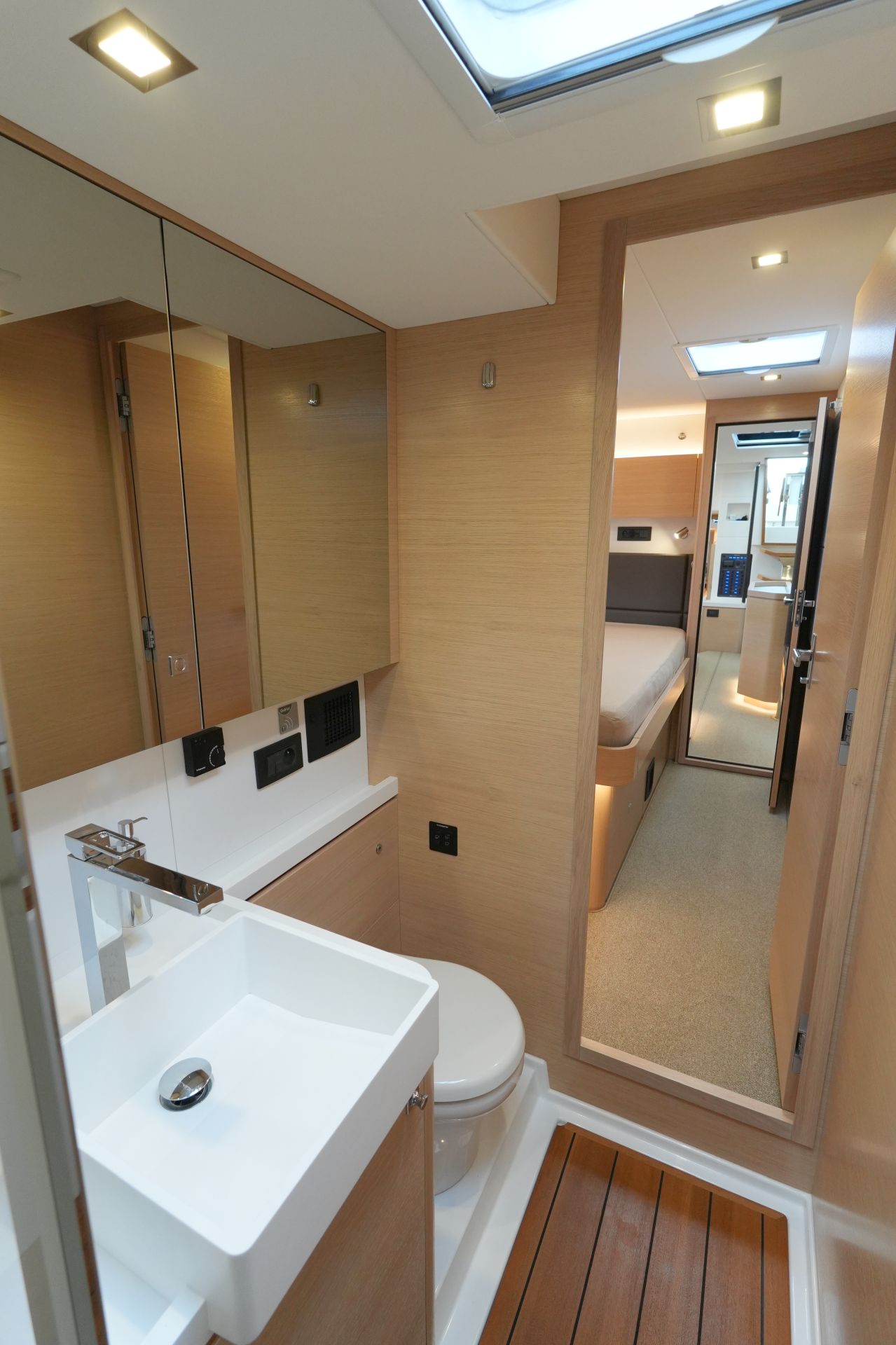 - Zwei symmetrische Nasszellen für die Gästekabinen mit Waschtisch, separater Duschkabine und elektrischer Toilette im Vorschiff