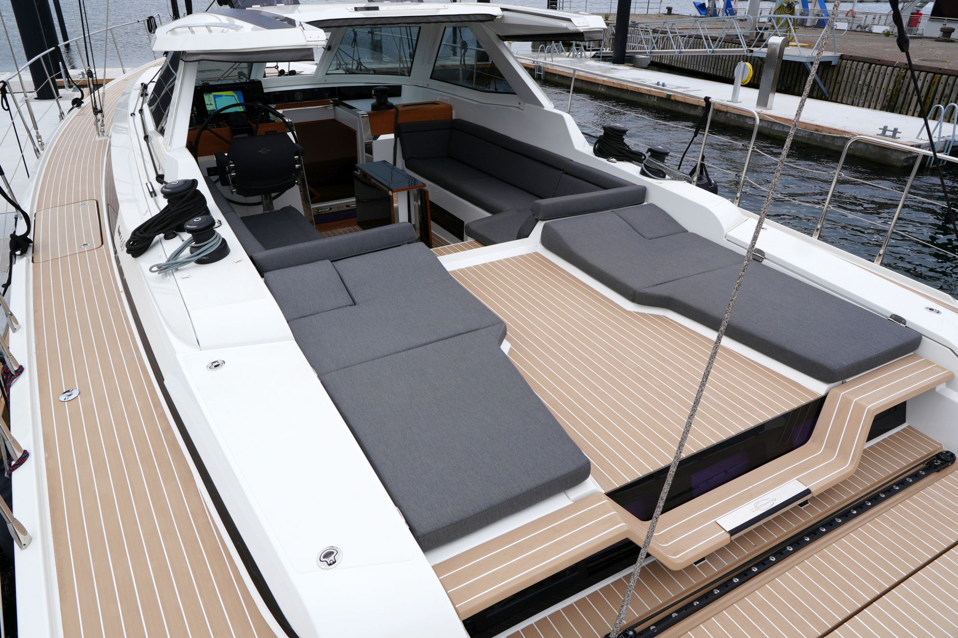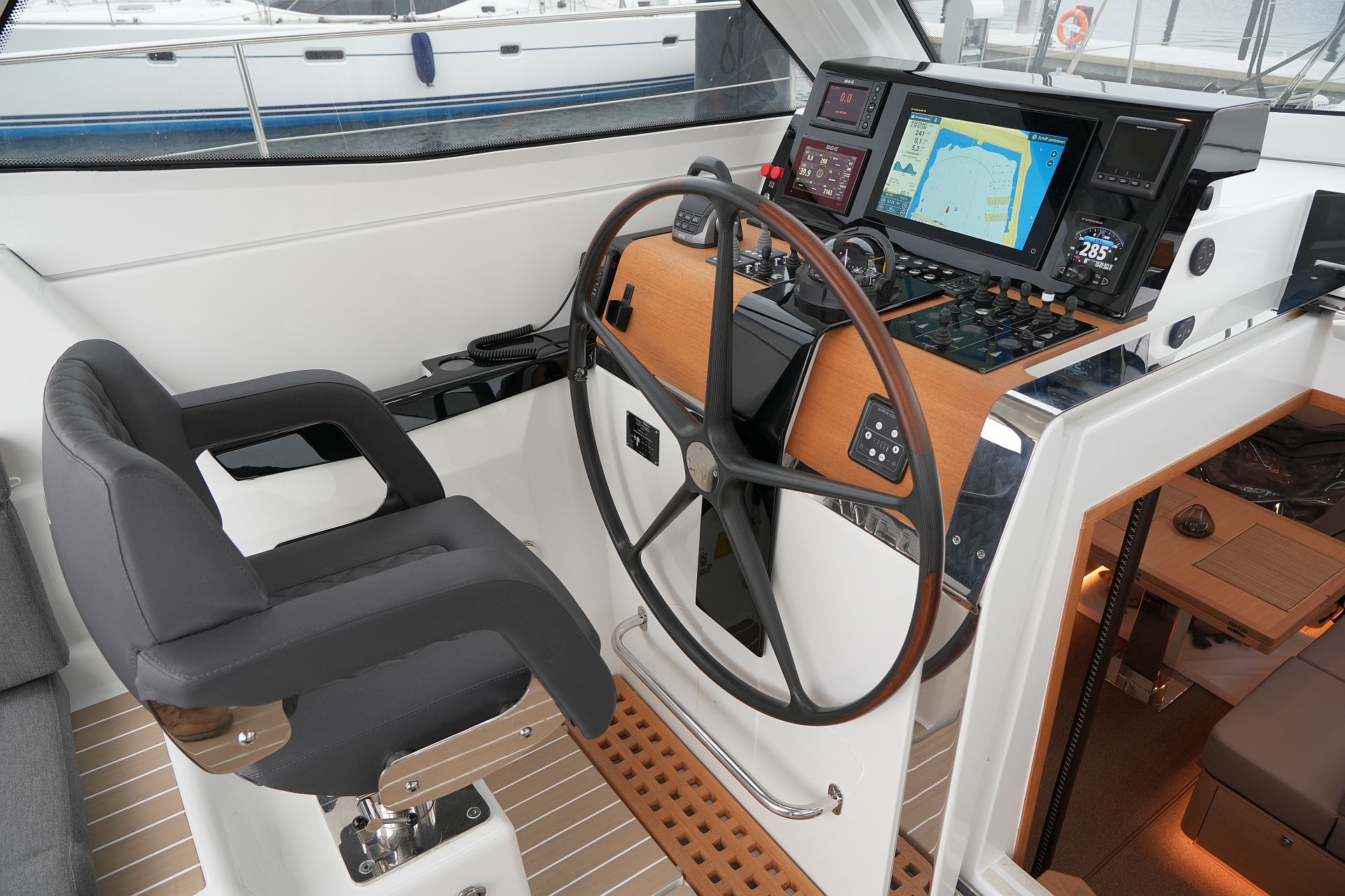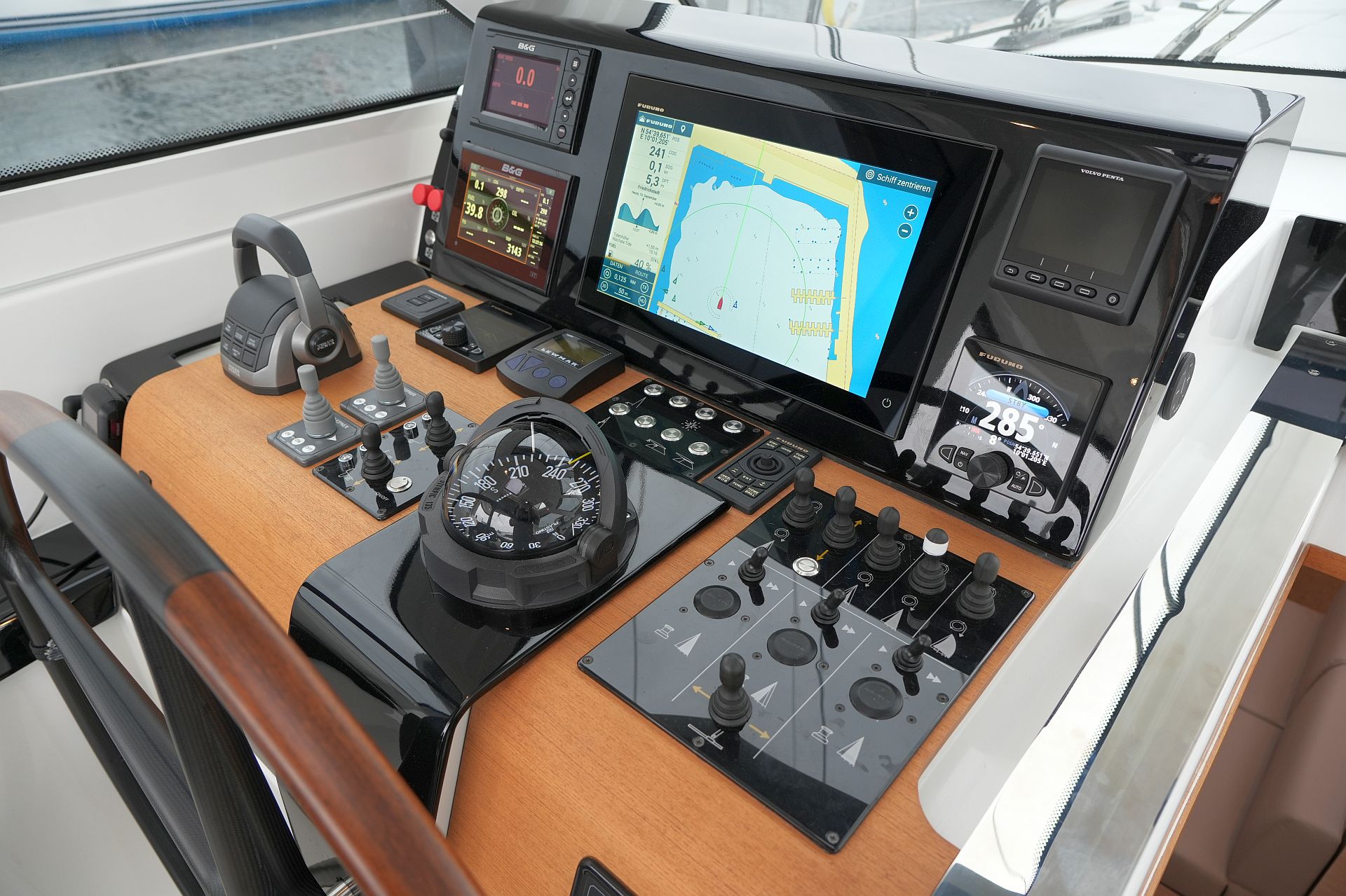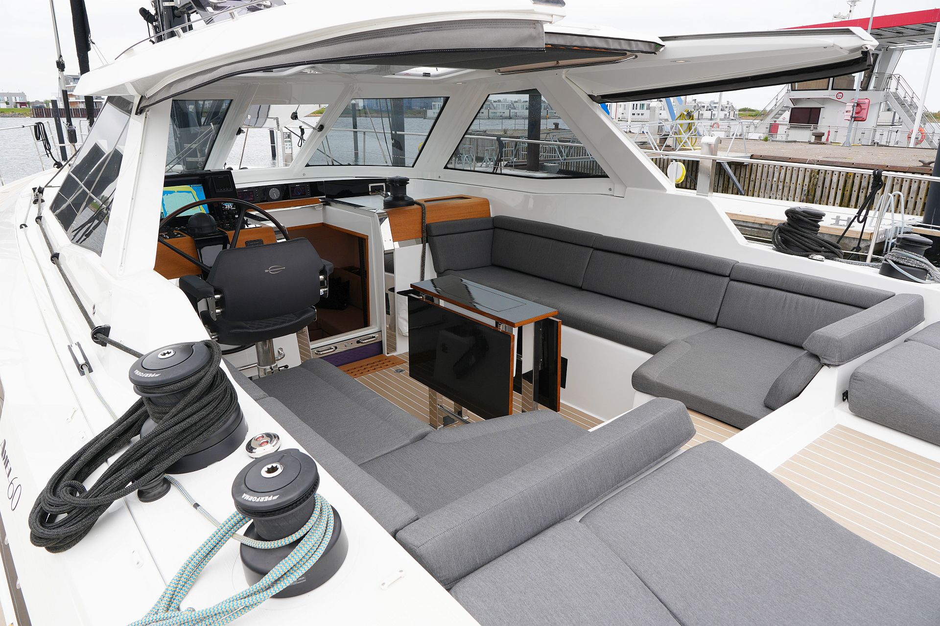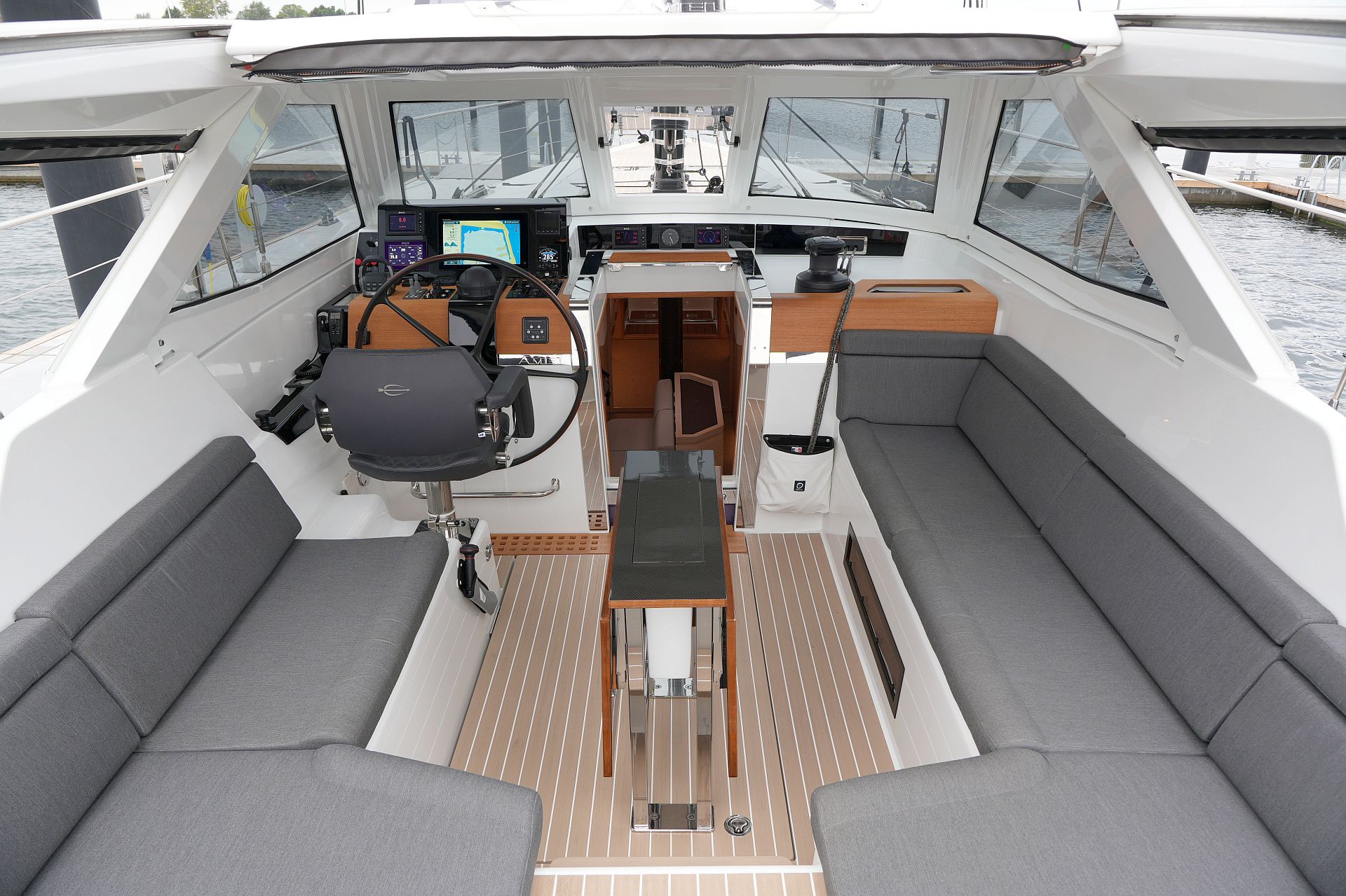 - Tiefes gut geschütztes Cockpit mit Steuerstand und Steuersitz an Backbord