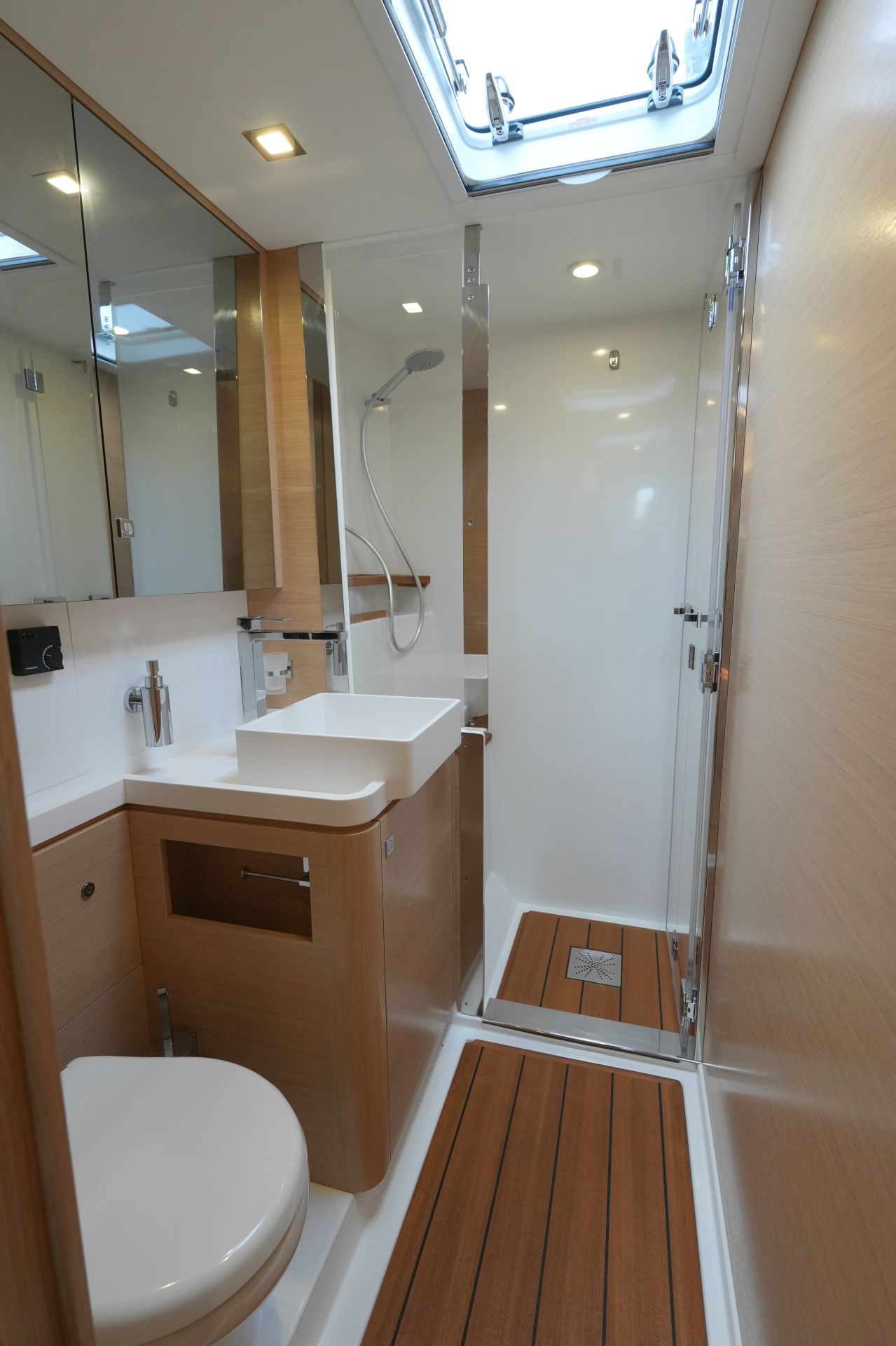 - Eignerbad mit Waschtisch, separater Duschkabine und elektrischer Toilette an Backbord