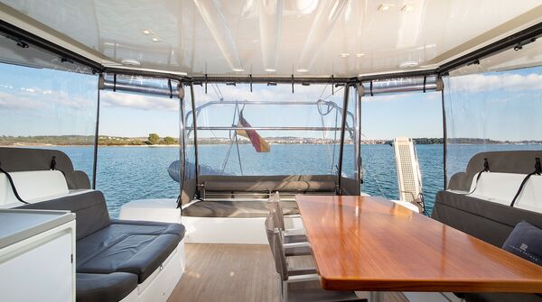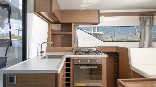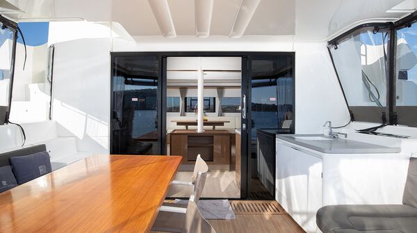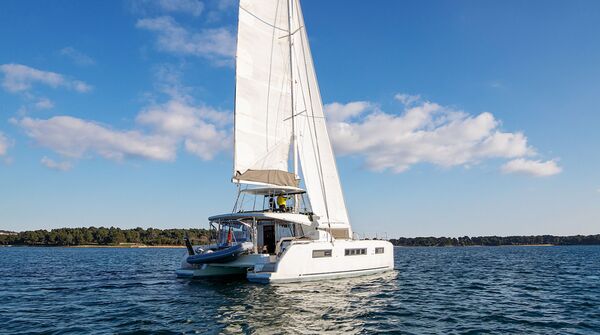 Cruising-Katamaran aus dem Jahr 2022Mit der Lagoon 50 gelang dem Weltmarktführer für Fahrtenkatamarane ein echter Coup: Das innovative Konzept des Konstukteurs VPLP, das freundliche, helle Interieur von Nauta Yachts und die jahrzehntelange Erfahrung der Werft machten das neue Modell bei seiner Vorstellung im Jahre 2018 zu einem großen Wurf. Das Modell errang nicht nur internationale Auszeichnungen, sondern wurde auch schnell zum Kassenschlager. Der weit achtern stehende Mast ermöglicht eine große Selbstwendefock und der kürzere Baum vereinfacht das Handling des Großsegels, was es erleichtert, den Katamaran im Segelbetrieb zu bedienen. Das durch ein Dach komplett geschützte Cockpit, die ausgesprochen großzügige Flybridge und die bequeme Sitzgruppe vor dem Deckshaus schaffen räumlich voneinander getrennte Inseln für viele Passagiere. Das geräumige, komfortable Interieur der Lagoon 50 ließ sich durch verschiedene Layouts auf das individuelle Programm ihres Eigners anpassen. Viele Yachten gingen in das Charter-Management. Der durch niedrige Stufen vereinfachte Zugang zu den Heck-Plattformen macht den Katamaran zur perfekten Badeinsel vor Anker in der Bucht. Das freundliche, lichtdurchflutete Deckshaus mit unverbautem 360° Panorama sowie das große Volumen der beiden Rümpfe bieten reichlich Komfort und Lebensraum unter Deck.
