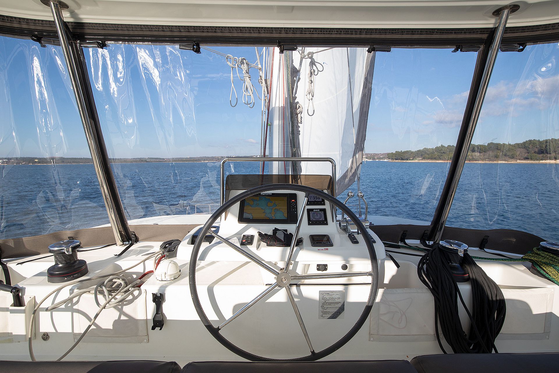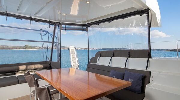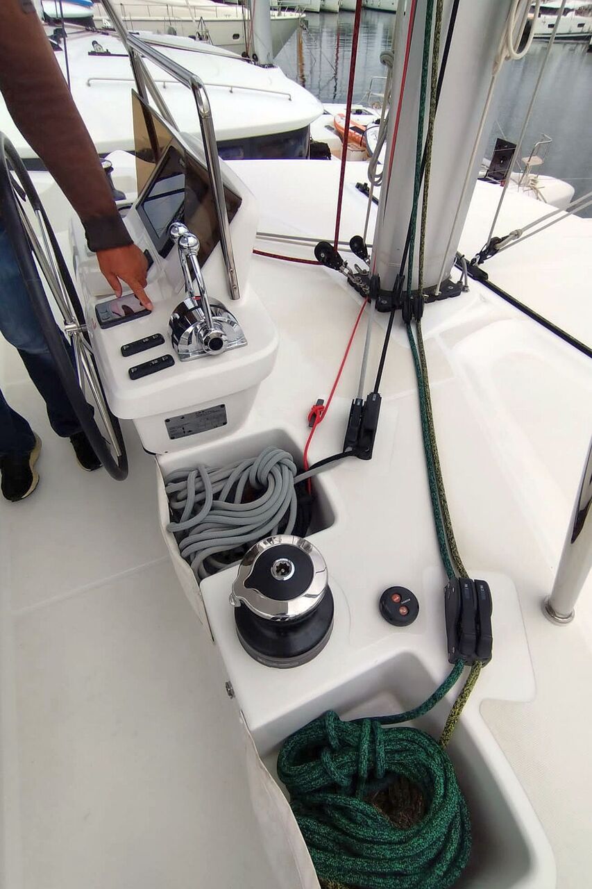 Hier steht eine junge Lagoon 50 aus dem Charterbetrieb zum Verkauf. Sie wurde aber nur mit Skipper verchartert. Ausbau in Alpi-Walnuß mit sechs Kabinen aber abweichend vom normalen Layout hat die Yacht vier größere Nasszellen. Der Katamaran ist mit den optionalen YANAMR 80 PS Maschinen motorisiert und verfügt über den stärkeren ONAN 11 kVA Generator und eine Klimaanlage für Salon und Kabinen. Die Flybridge ist durch das optionale feste GFK-Bimini überdacht. Die Lagoon 50 liegt in Kroatien an der oberen Adria und kann nach Absprache besichtigt werden. Sie befindet sich im Besitz einer kroatischen Charter-Gesellschaft und der Fragepreis versteht sich exklusiv Mehrwertsteuer.
