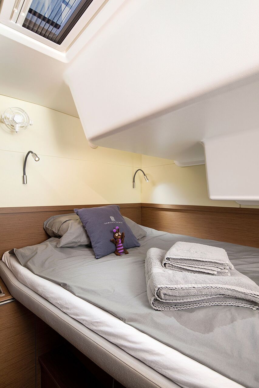 - Zwei Vorschiffskabinen mit Doppelkoje, Schrank, Staufächern, Rumpffenster und Decksluke
